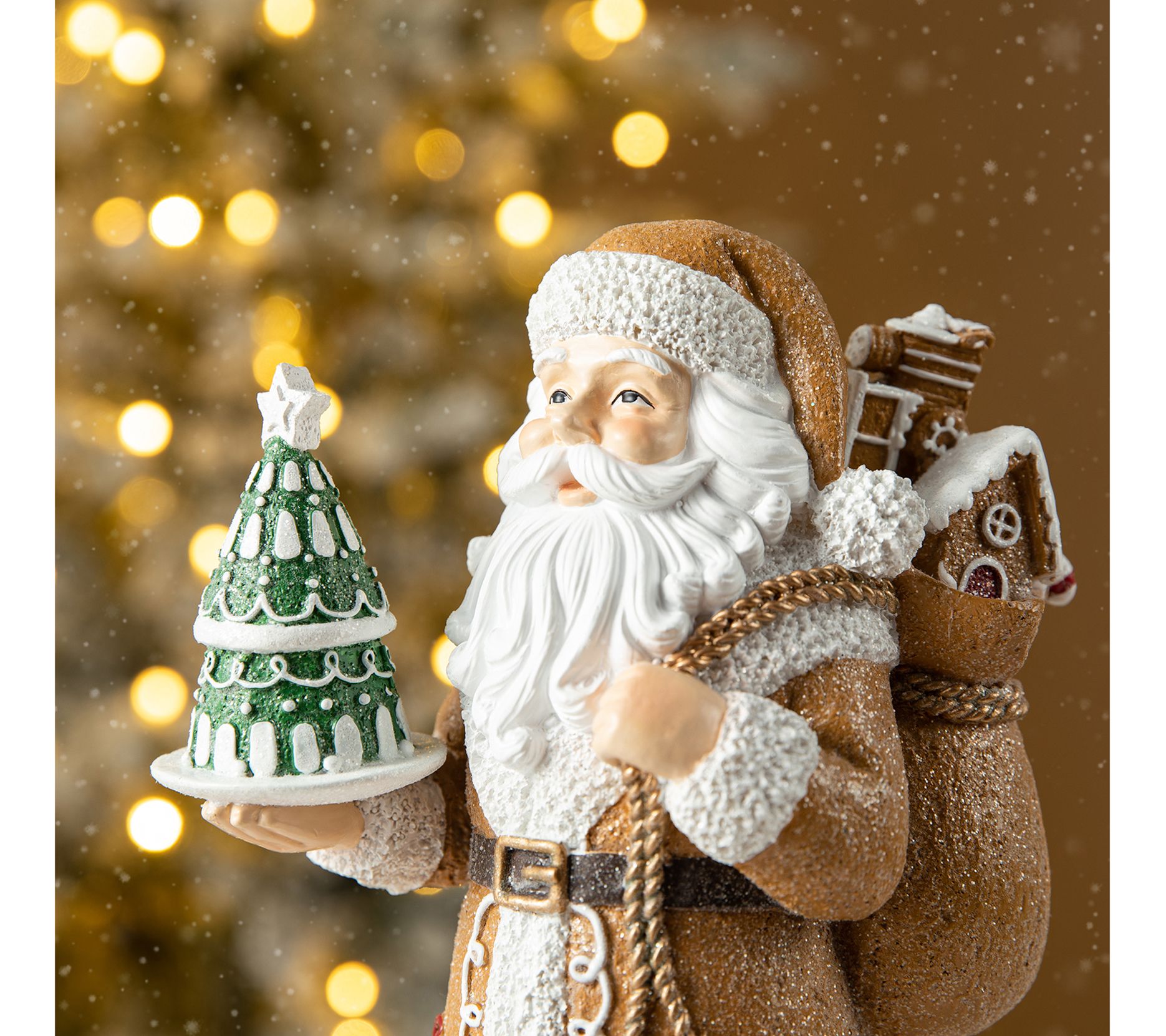 Add a touch of whimsy to your holiday decor with the Christmas Santa table decor. This charming piece features Santa in a gingerbread coat, holding a Christmas tree in one hand and a sack of presents in the other, all dusted in shimmering powder for a magical sparkle. It's the perfect festive addition to any table or shelf, bringing the spirit of Christmas to your home. From Glitzhome.