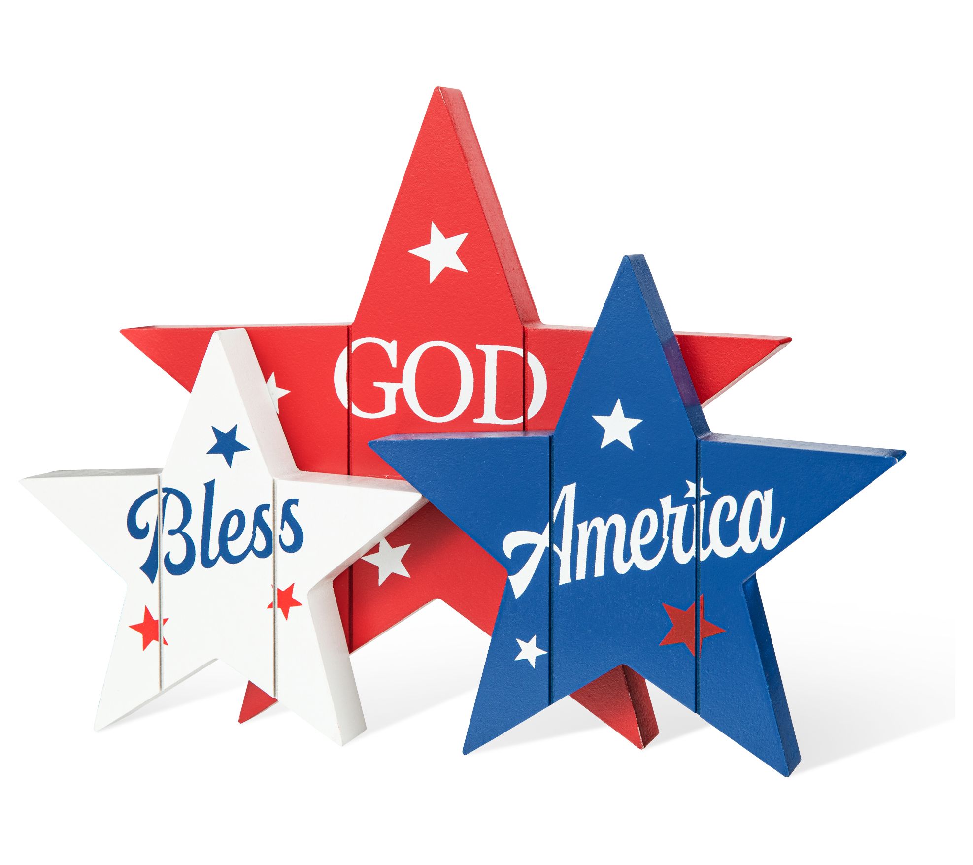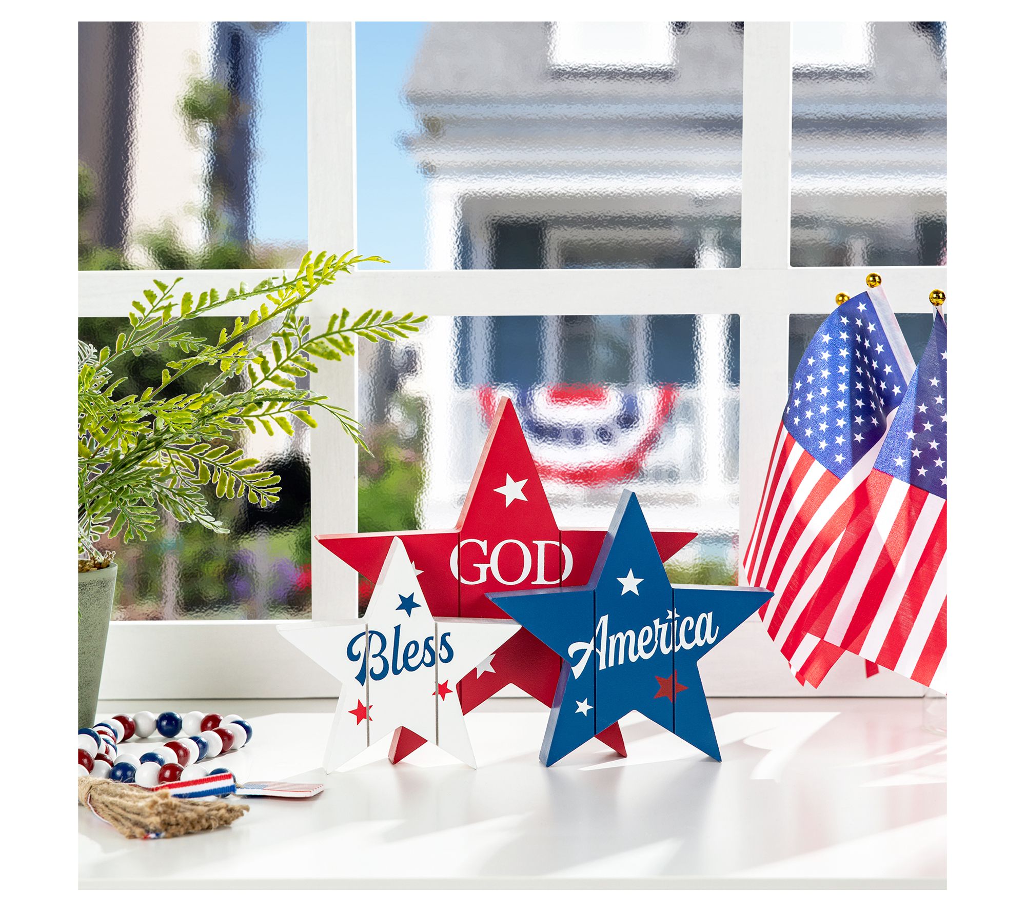 Perfect for Independence Day or for adding a touch of Americana style to a shelf or windowsill all year round, this union of three stars features a patriotic theme and message. From Glitzhome.