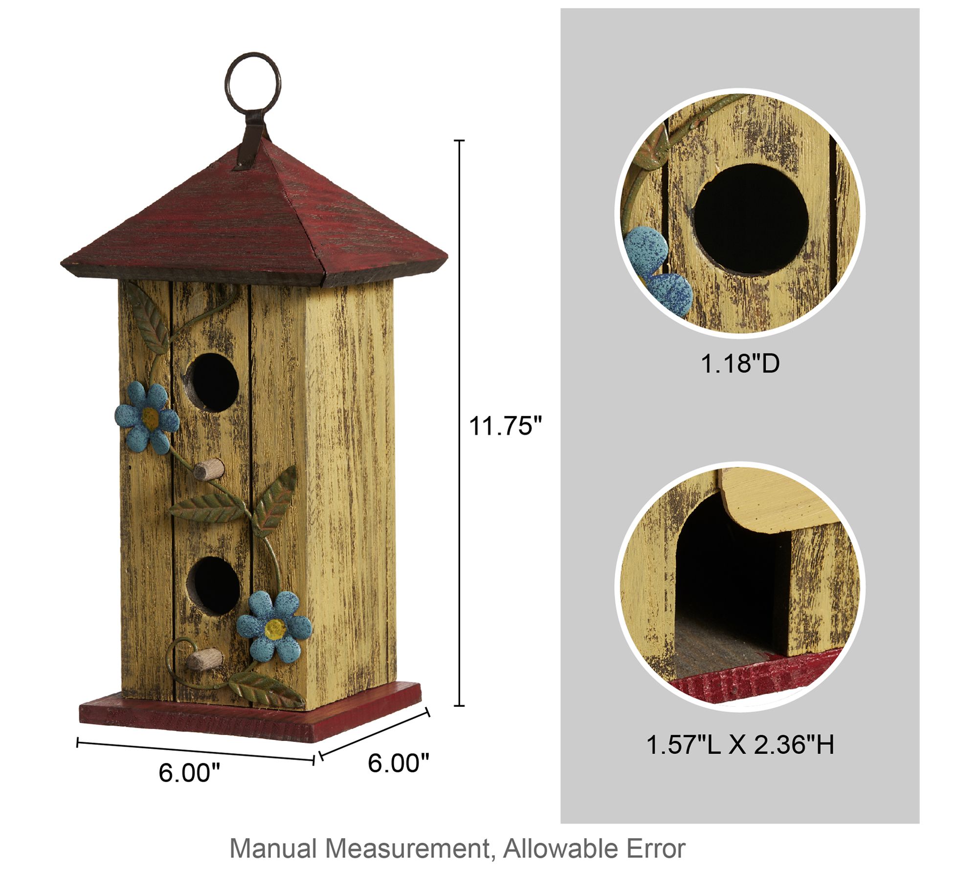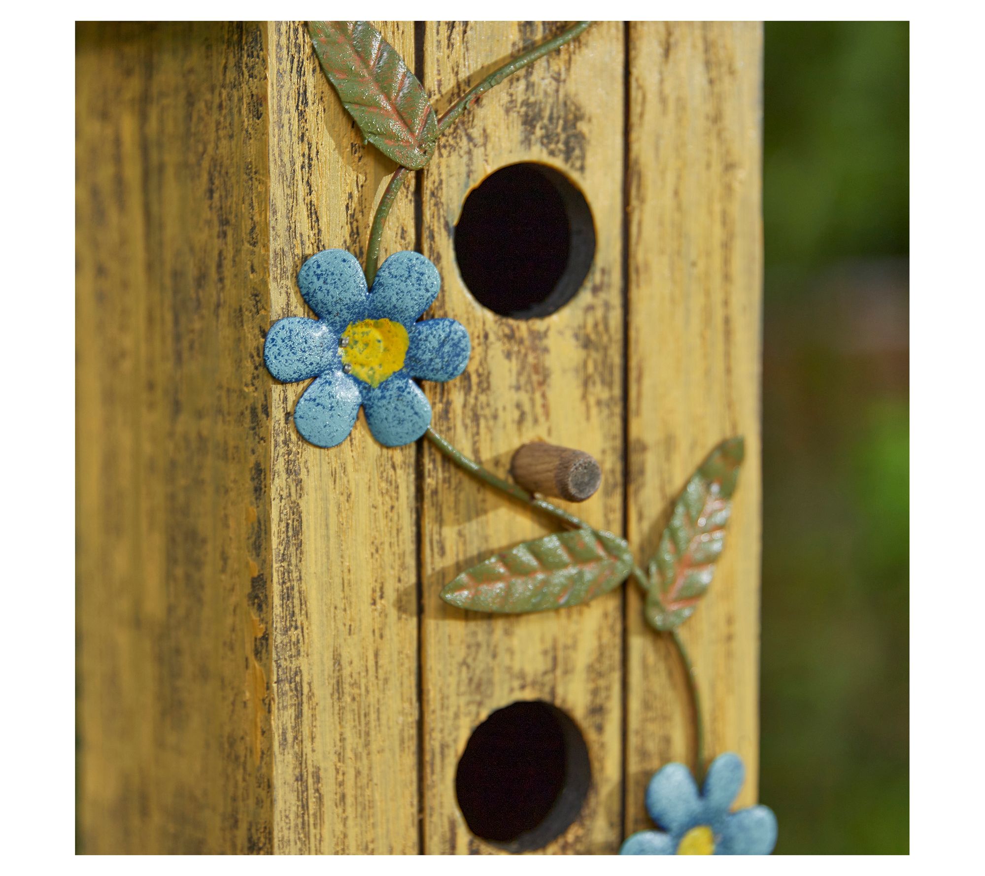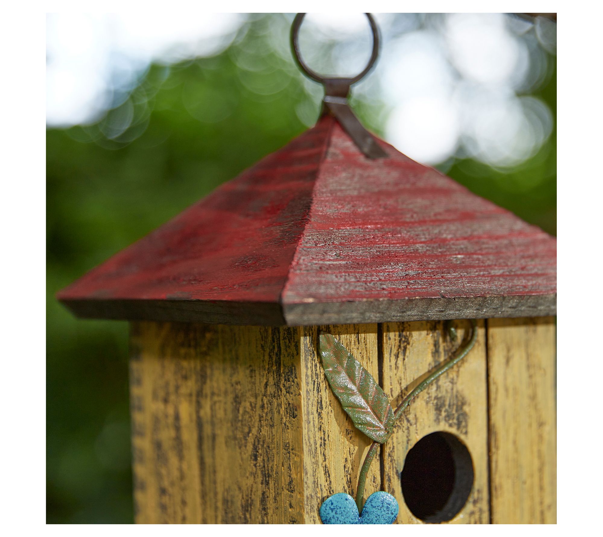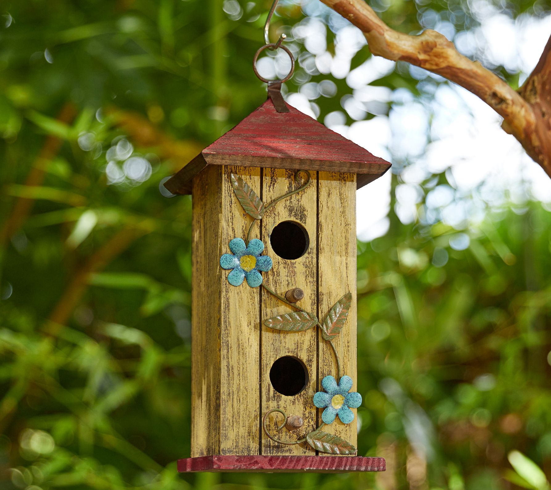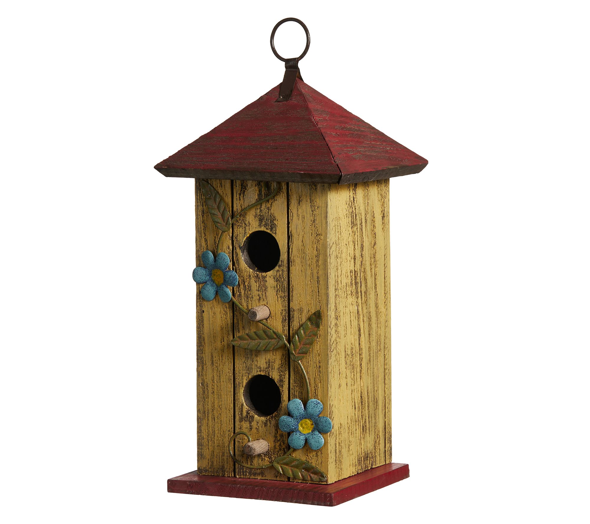 Create a cozy retreat for small birds with this beautifully crafted two-tier decorative birdhouse, perfect for adding charm to your garden, patio, or backyard. Its creative cottage-inspired design features vibrant natural wood slats and artistic 3D rusty flowers and leaves, making it a delightful focal point. The metal hanger ensures easy placement and enjoyment. From Glitzhome.