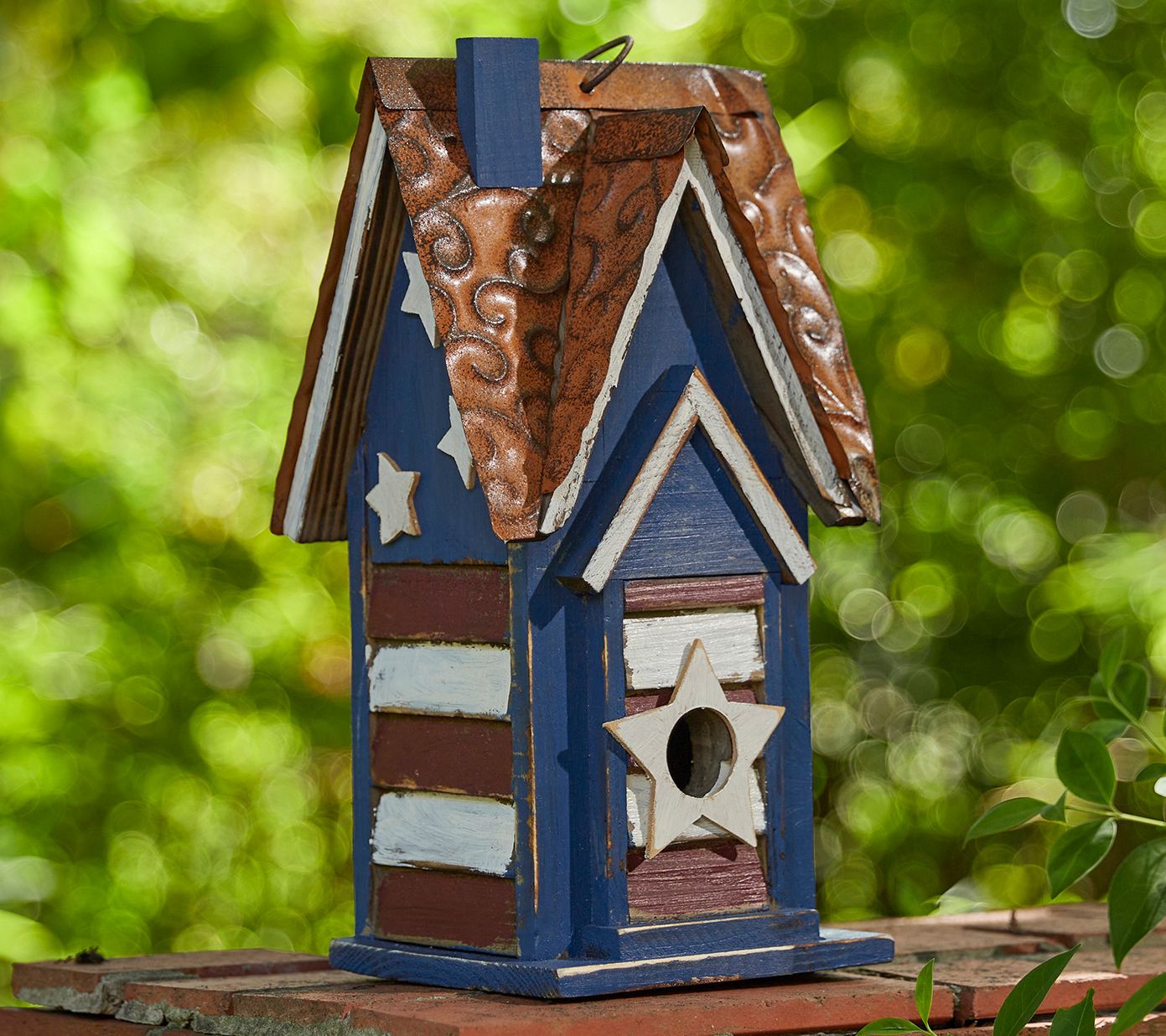 Add patriotic charm to your garden with this villa garden birdhouse. Inspired by the American flag, it features a whimsical 3D star design on the roof, window, and door, creating a delightful spot for your feathered friends to call home. From Glitzhome.