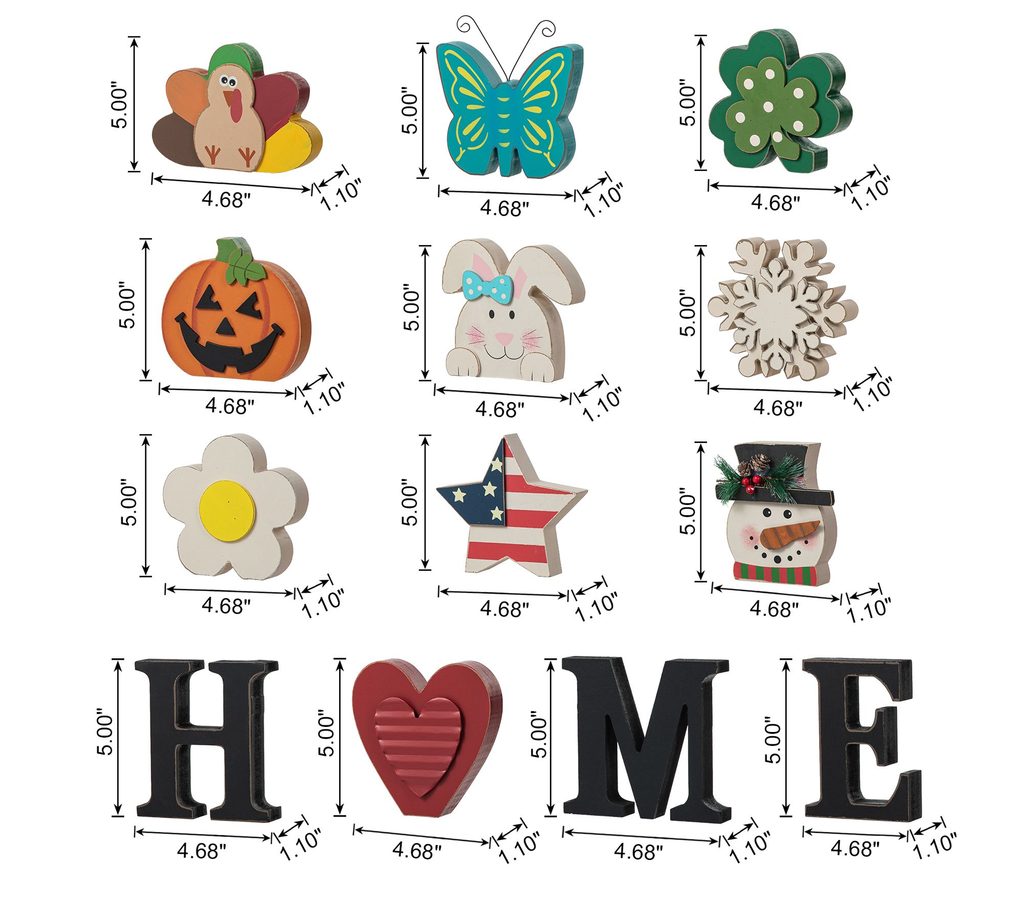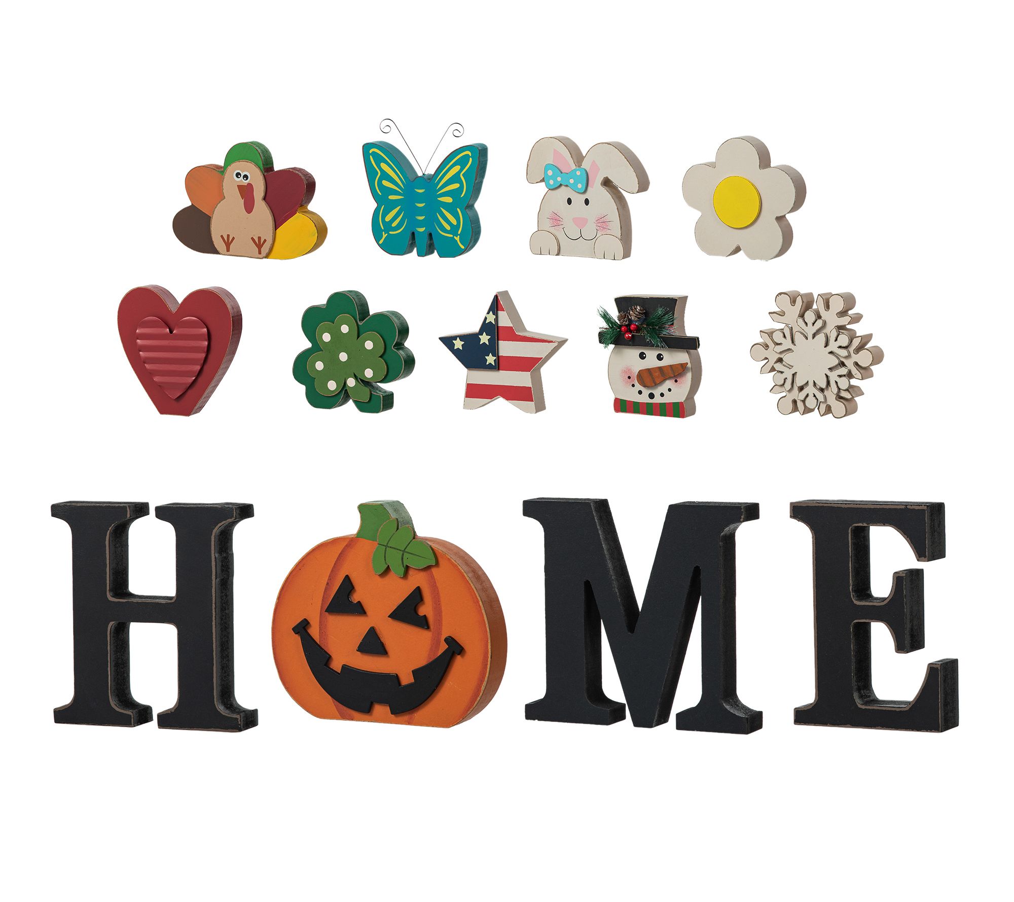 • Includes 13 tabletop decor pieces: H, M, E, pumpkin, snowman, snowflake, turkey, bunny, flower, clover, star, heart, butterfly
