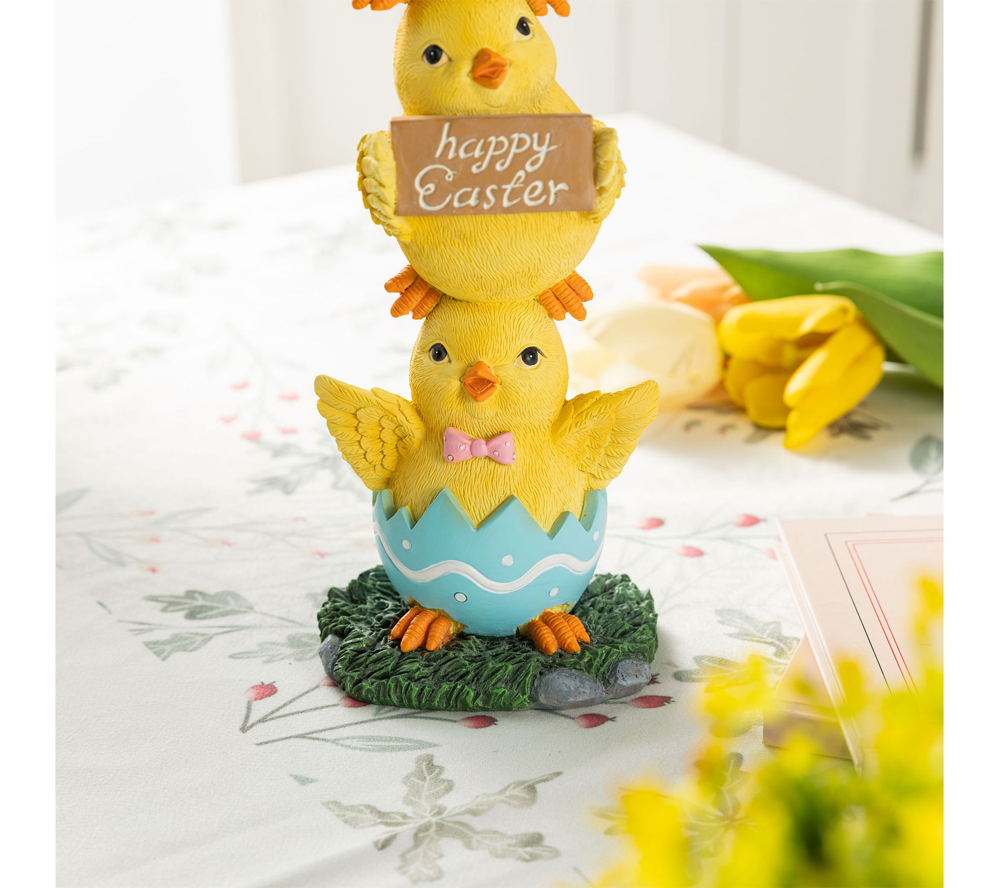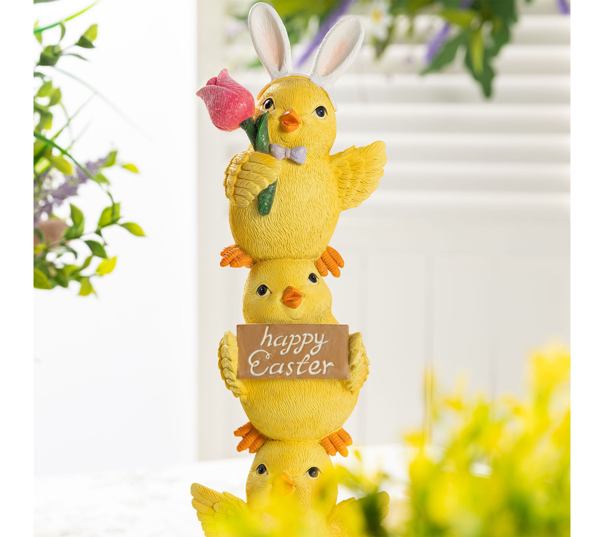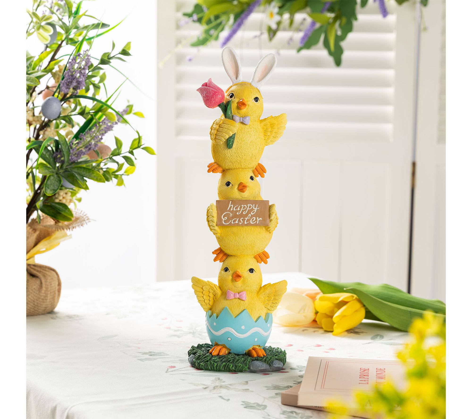 Add a playful touch to your Easter celebrations with this charming table decor featuring three stacked yellow ducks. The cheerful trio -- complete with bunny ears, a tulip, and festive signs -- brings a whimsical vibe to your mantel, tabletop, or entryway and will delight guests of all ages. From Glitzhome.