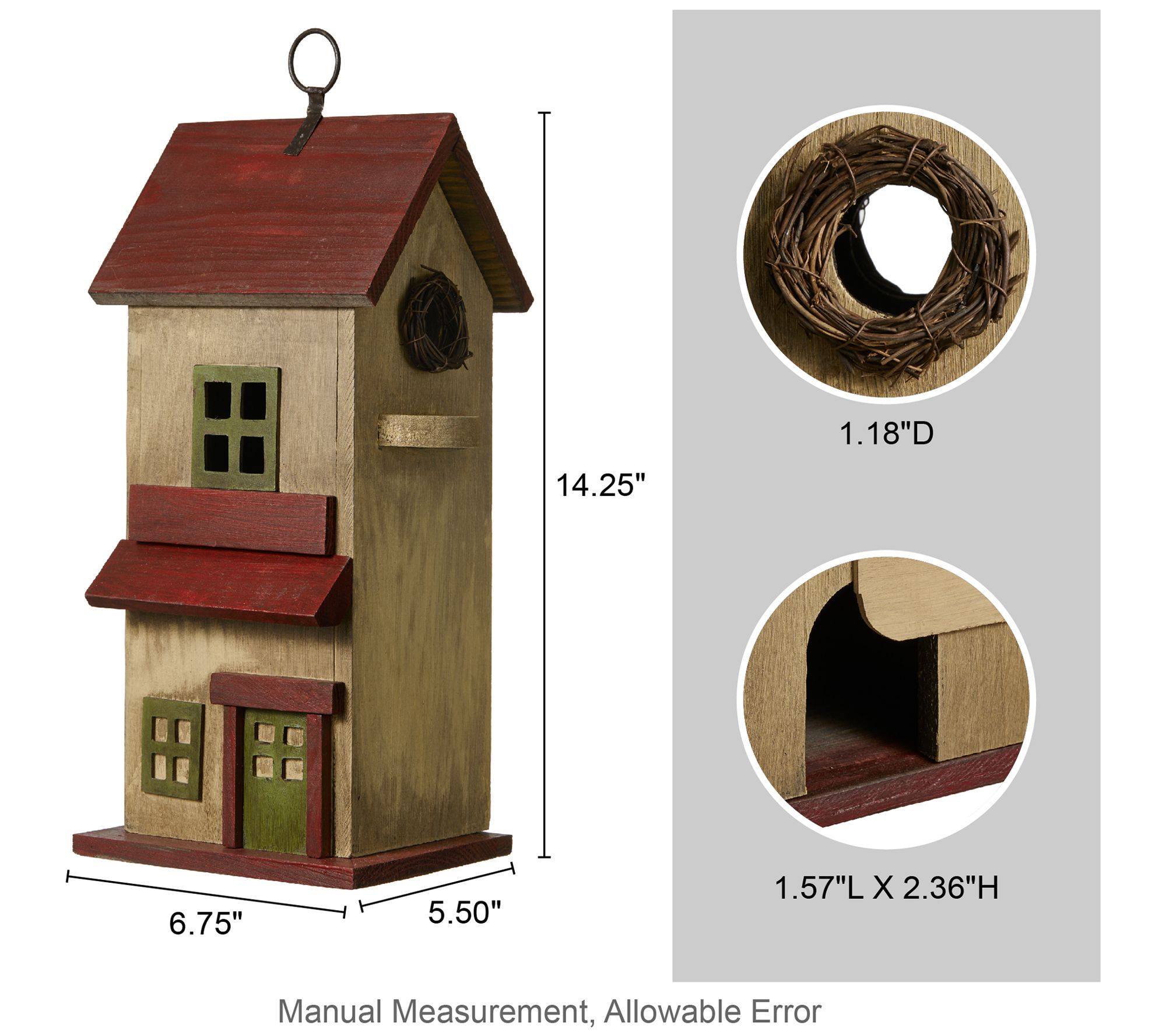 • Measures 6.75"L x 5.5"W x 14.25"H; Entrance hole 1.18"D; Clean out hole 1.57"L x 2.36"H