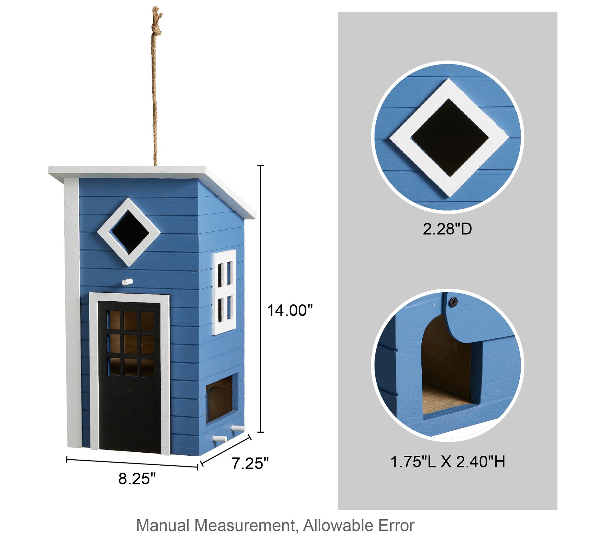 • Measures approximately 8.25"L x 7.25"W x 14"H; Entrance hole 2.28"D; Clean out hole 1.75"L x 2.4"H