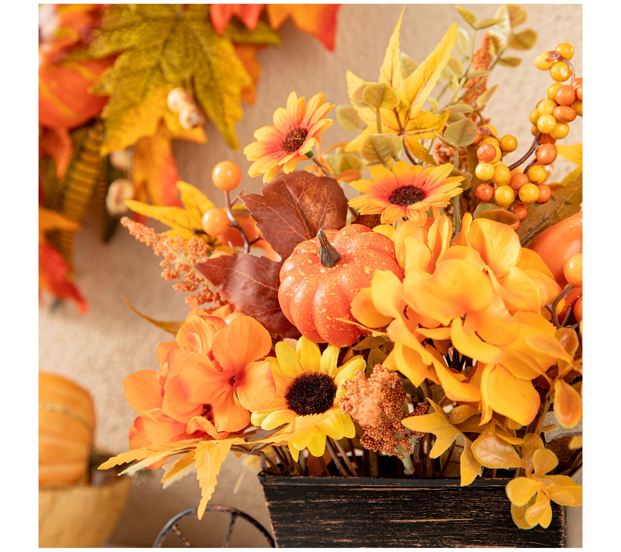 • Features lifelike yellow sunflowers, pumpkins, maple leaves and berries