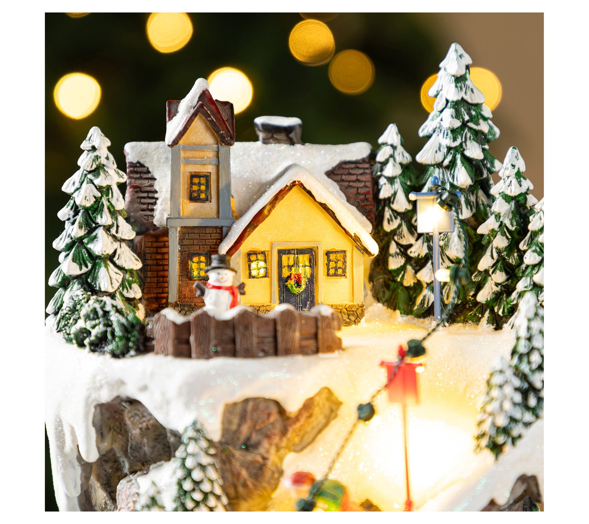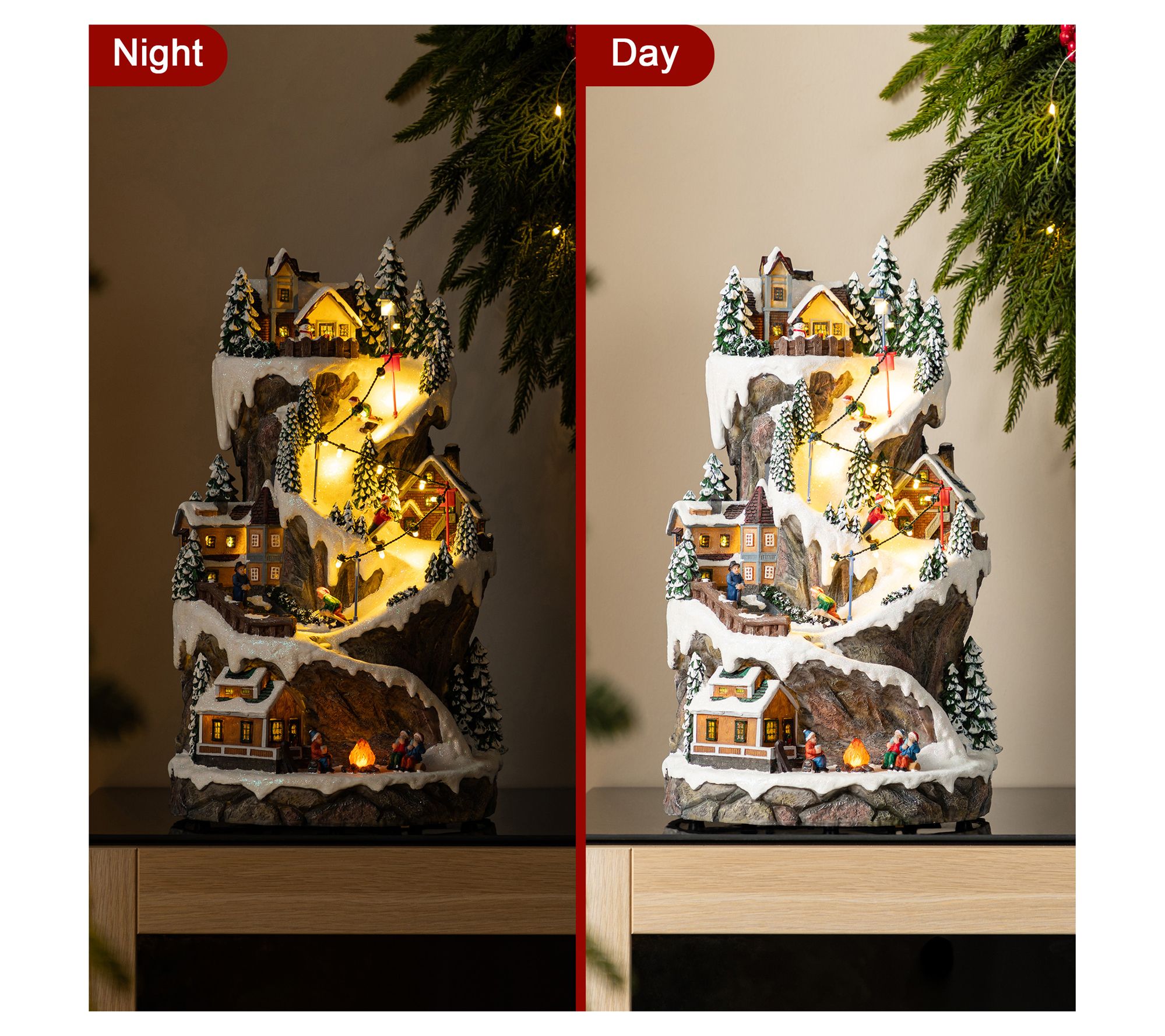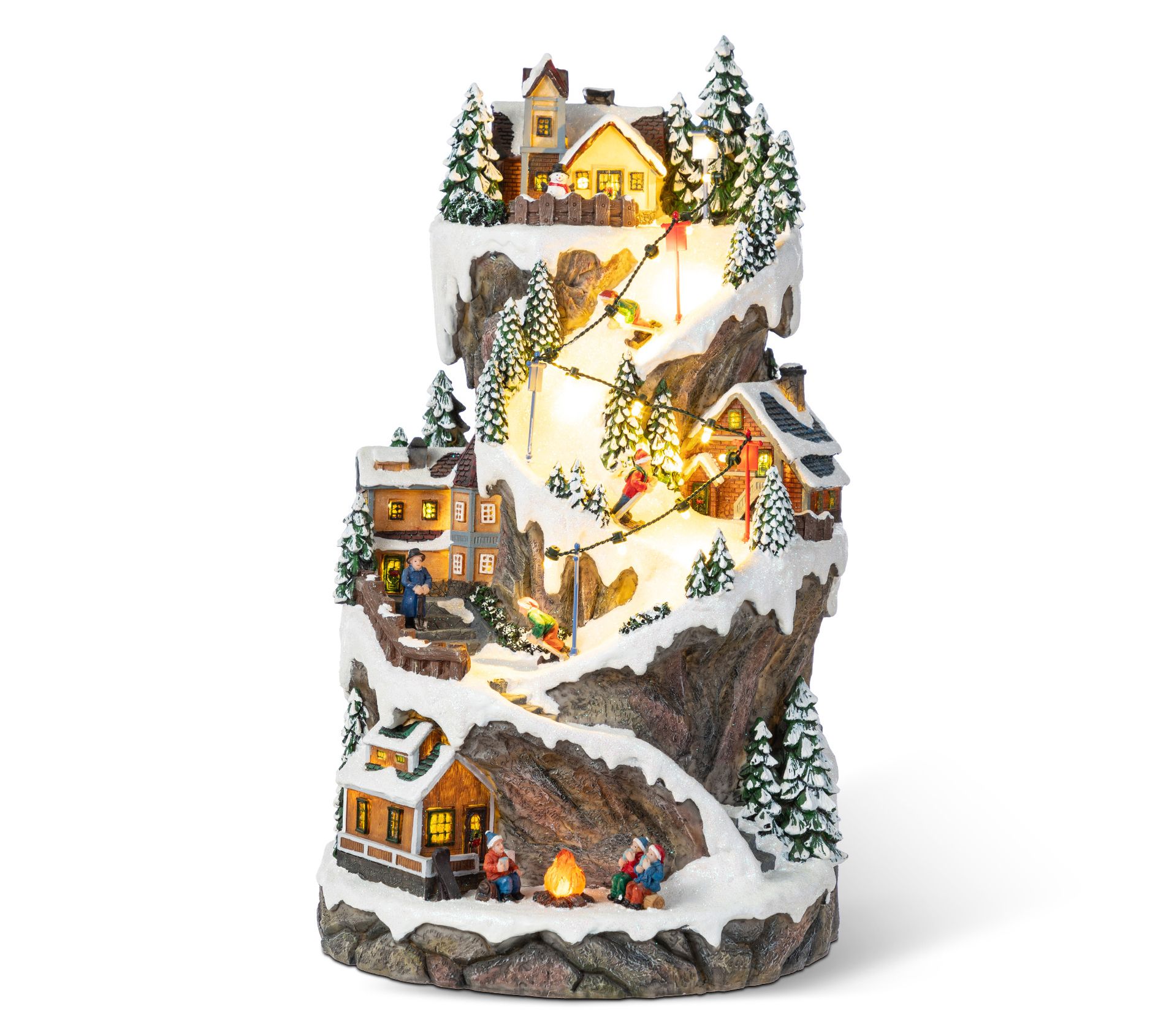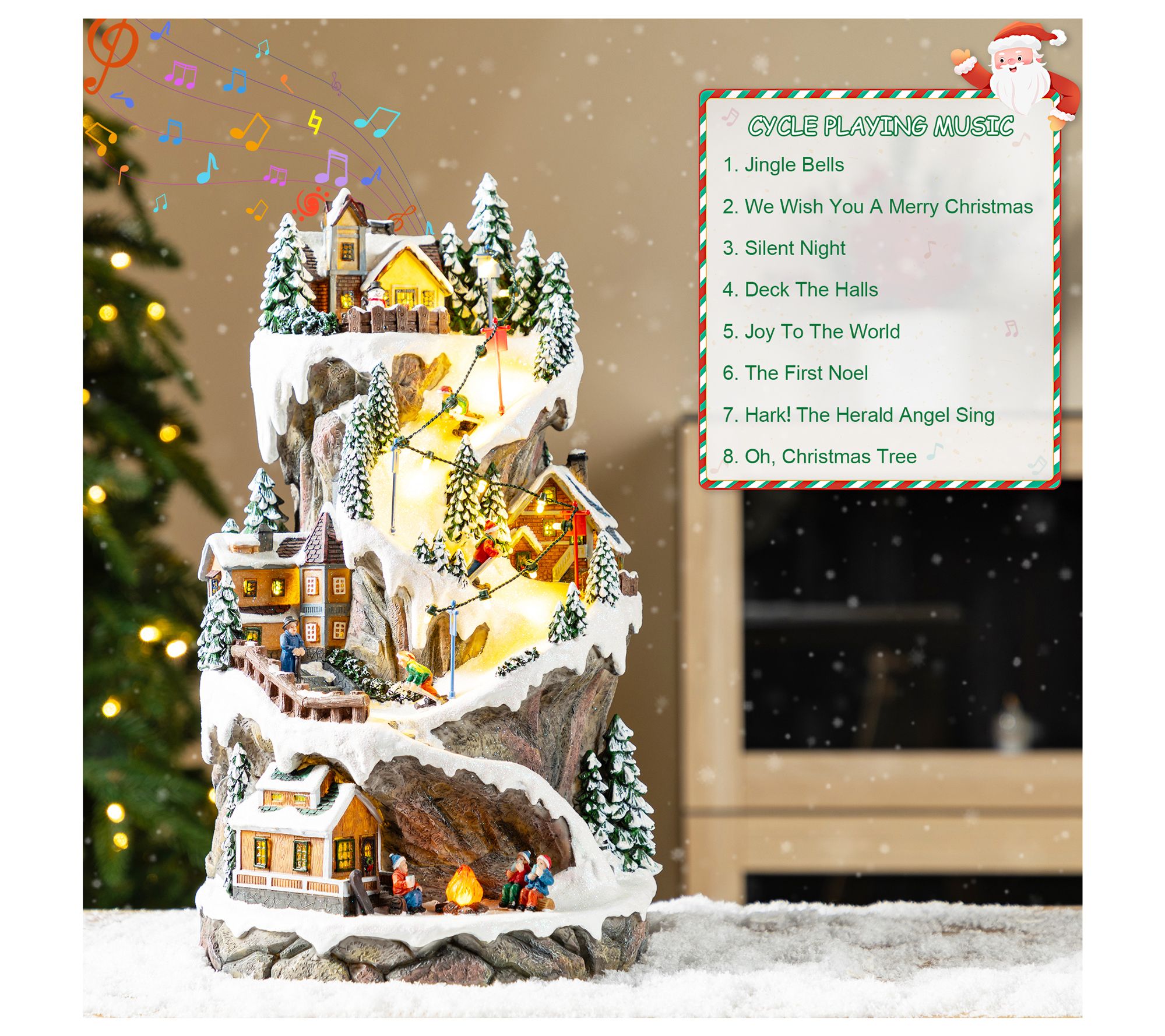 Embrace the holiday spirit with a delightful skiing mountain village that captures the magic of Christmas right indoors. This lit miniature town plays cheerful melodies, ensuring the atmosphere is filled with warmth and joy. Place it on your table or shelf for a charming addition to your festive decor, and watch as it lights up the season with its enchanting glow and intricate details. From Glitzhome.