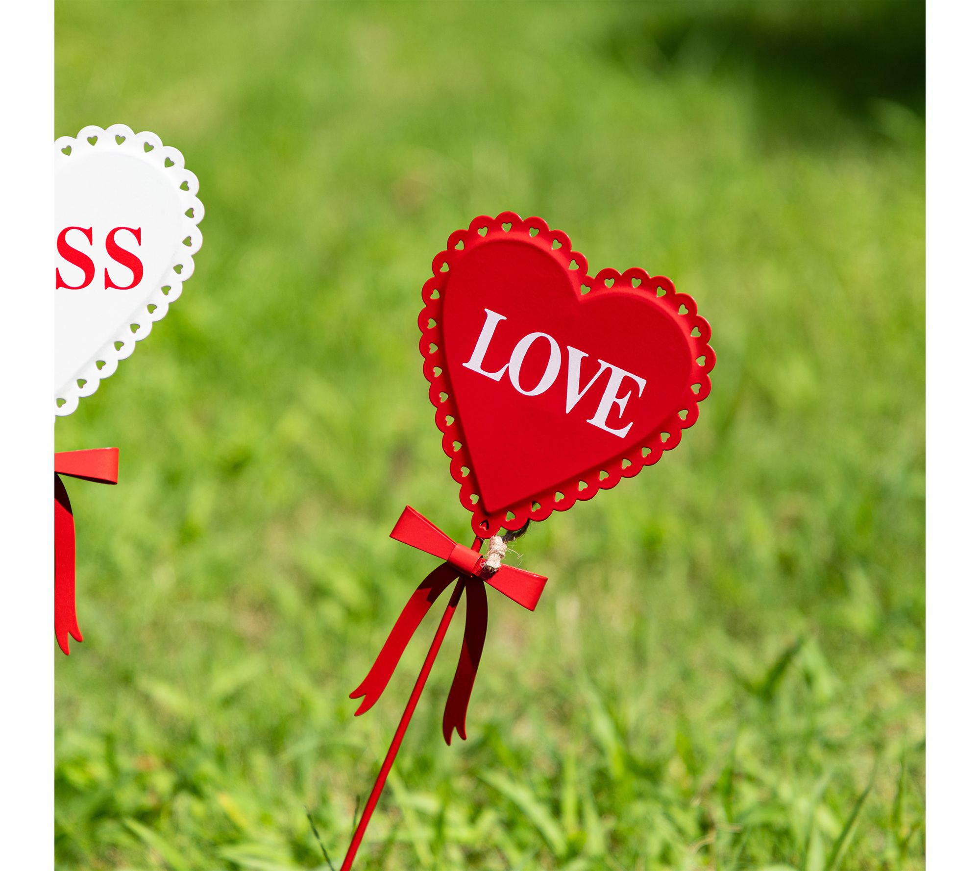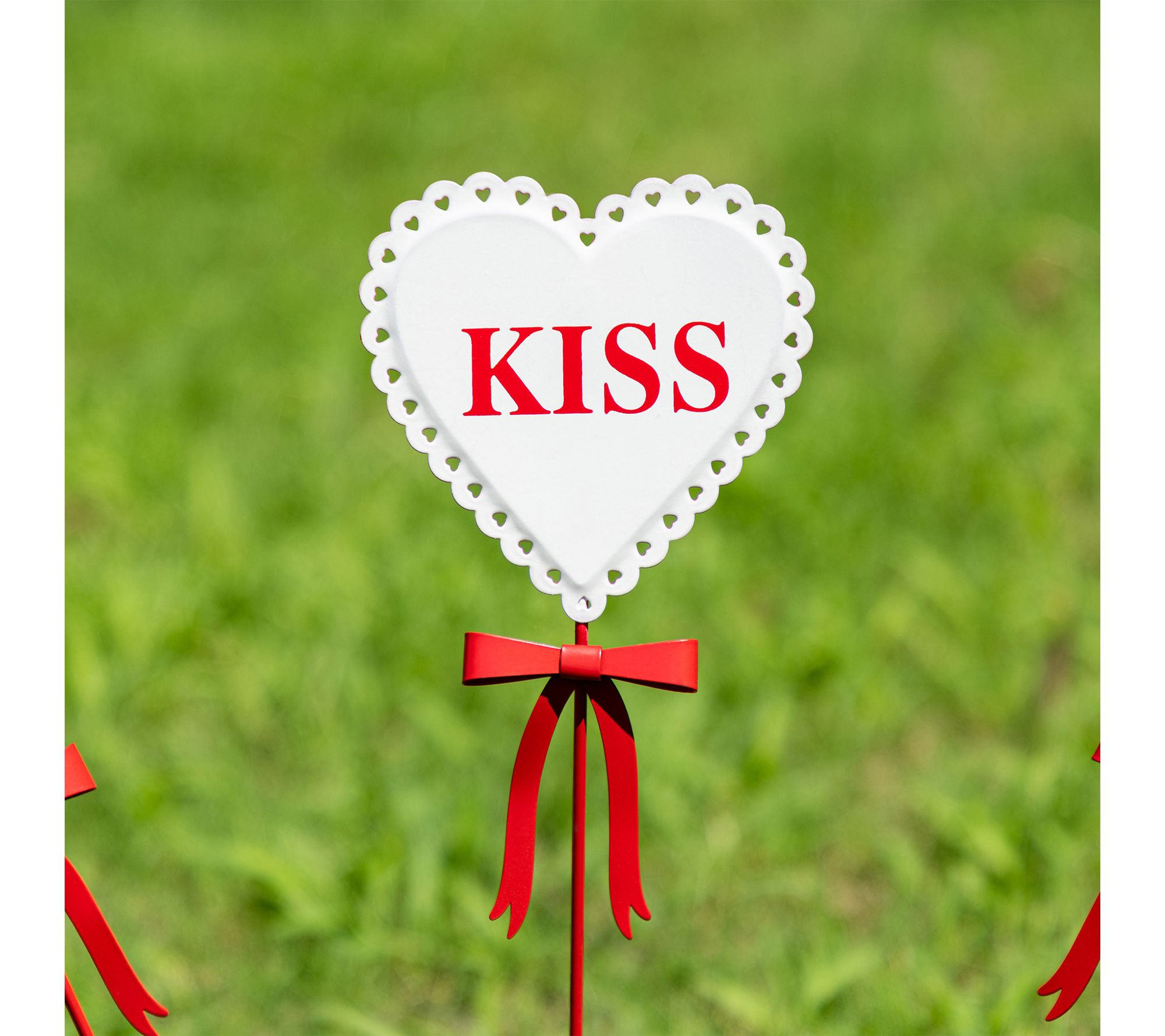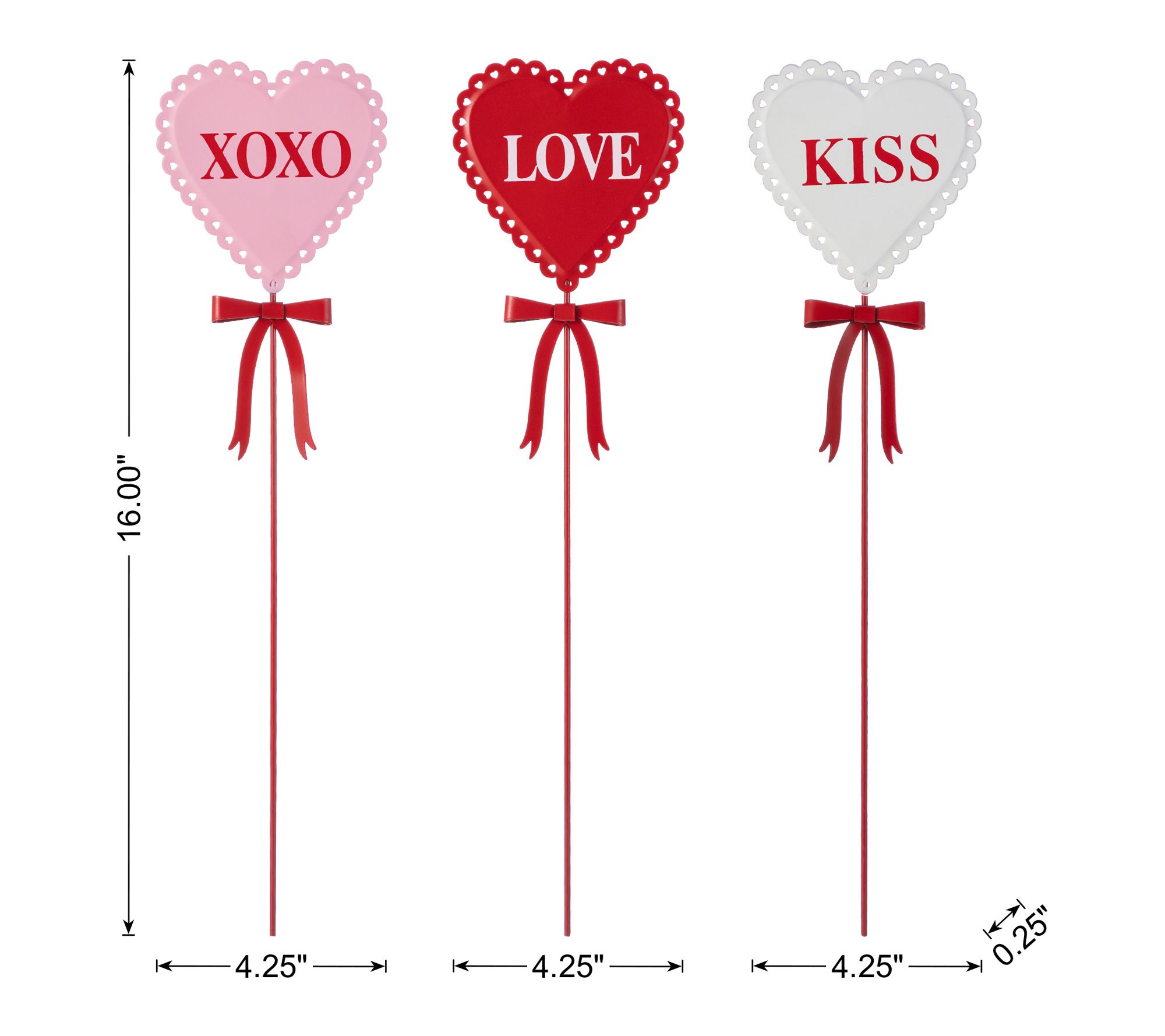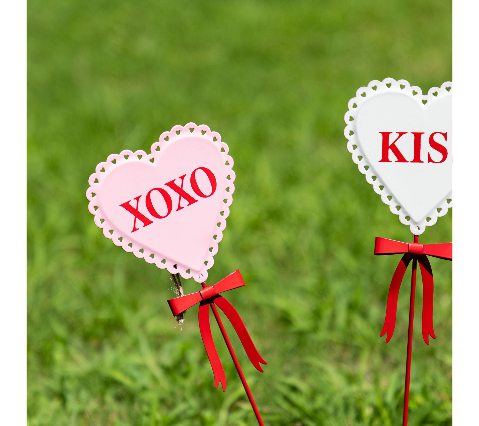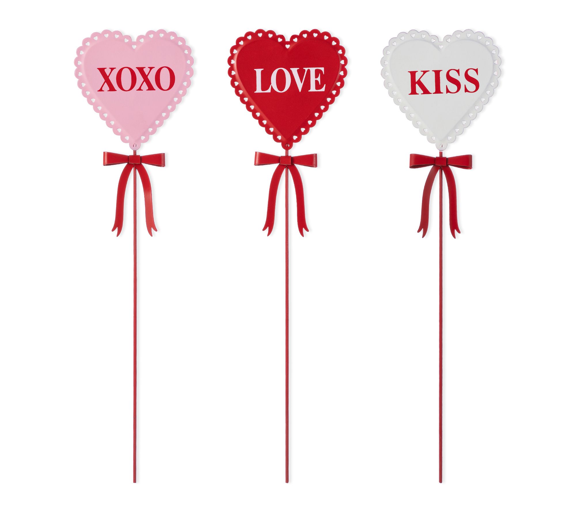 Brighten up your yard, garden, or patio for Valentine's season with this cheerful set of three heart-shaped garden stakes. Each metal stake features charming phrases like XOXO, LOVE, and KISS, topped with a red bow to bring a heartfelt touch of romance and warmth to your outdoor space. From Glitzhome.