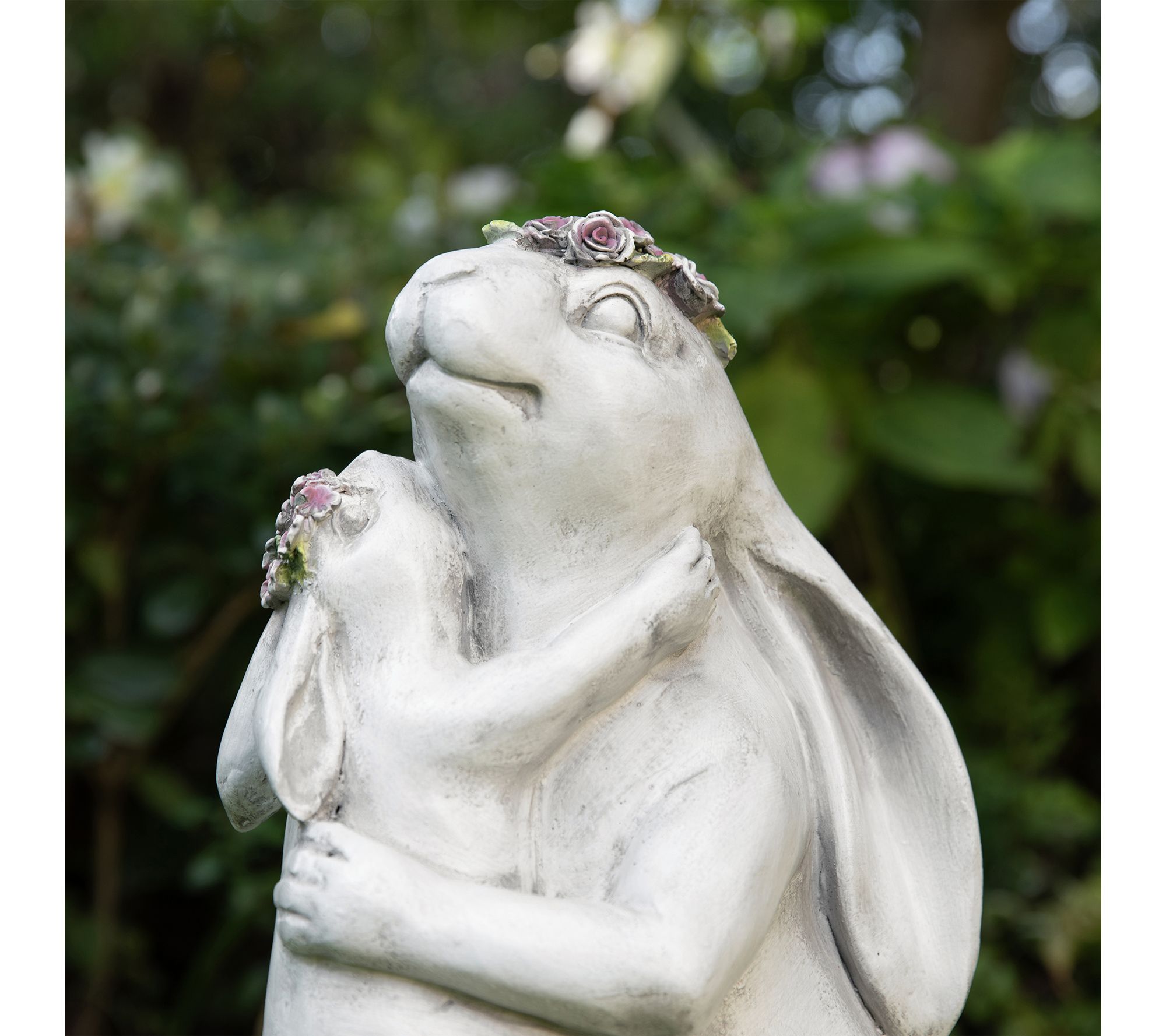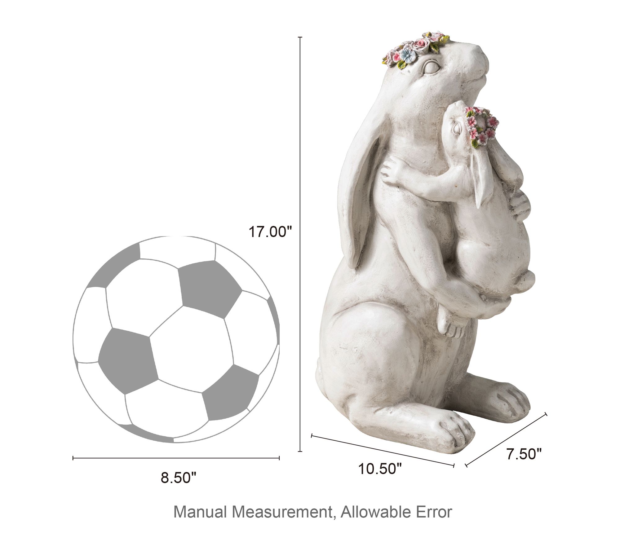 Share a heartwarming moment in your garden or patio with this 17" hugging mom and baby rabbit statue. The charming scene of a mother rabbit embracing her little one, both adorned with floral crowns, brings a touch of whimsy and gentle beauty to any outdoor space. The weathered finish and loving details blend effortlessly into springtime beds and shaded corners for a delightful accent. From Glitzhome.