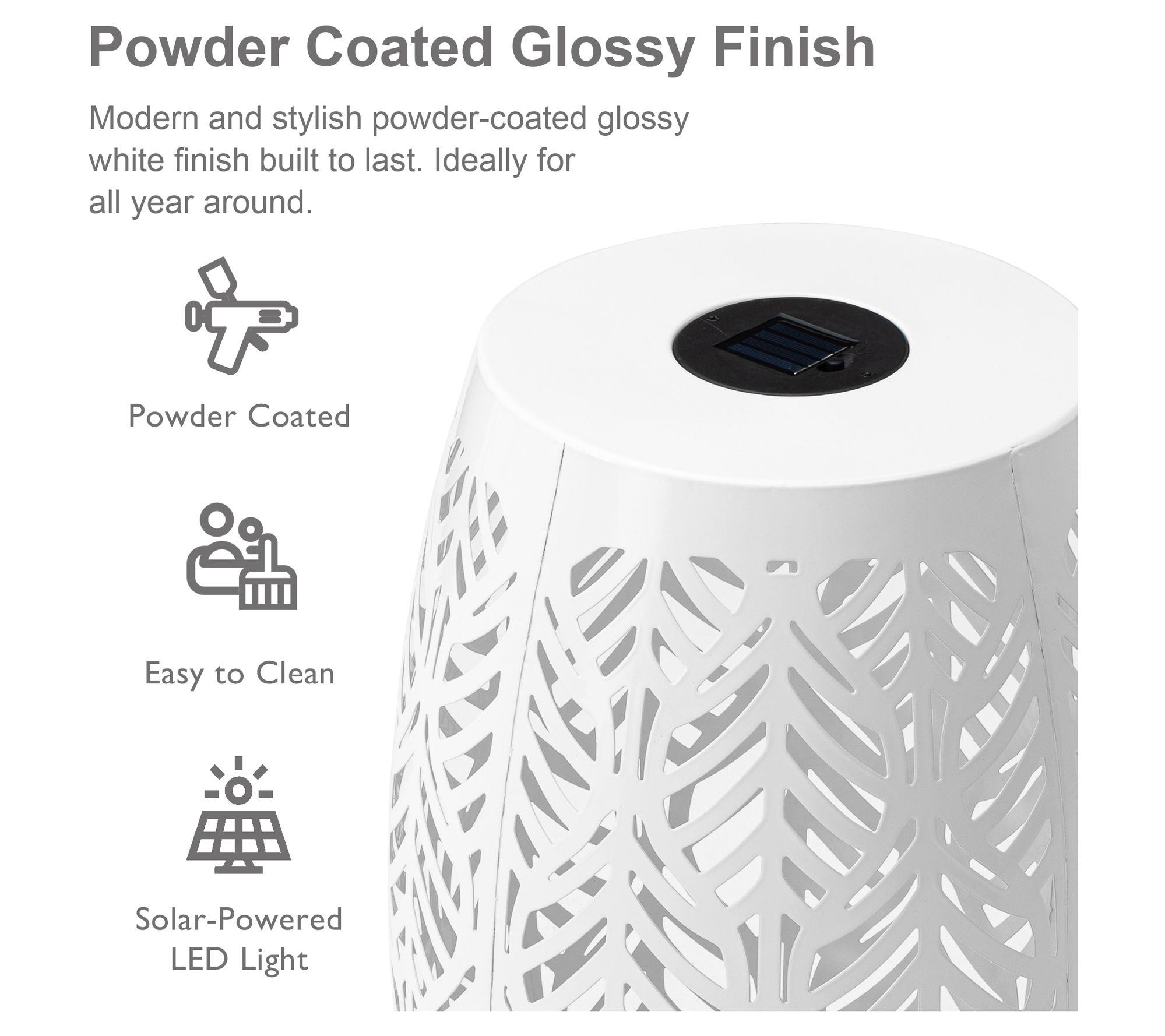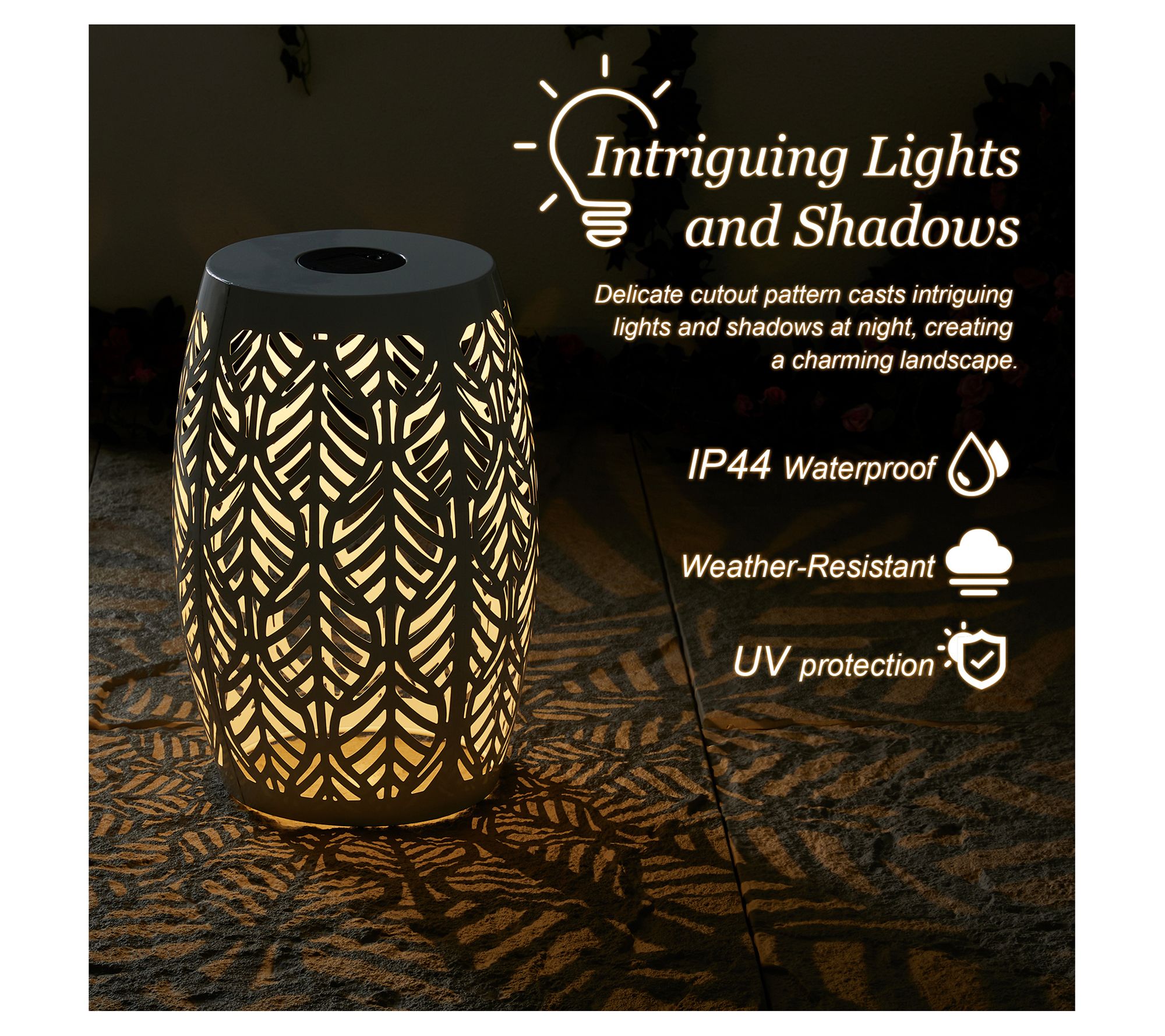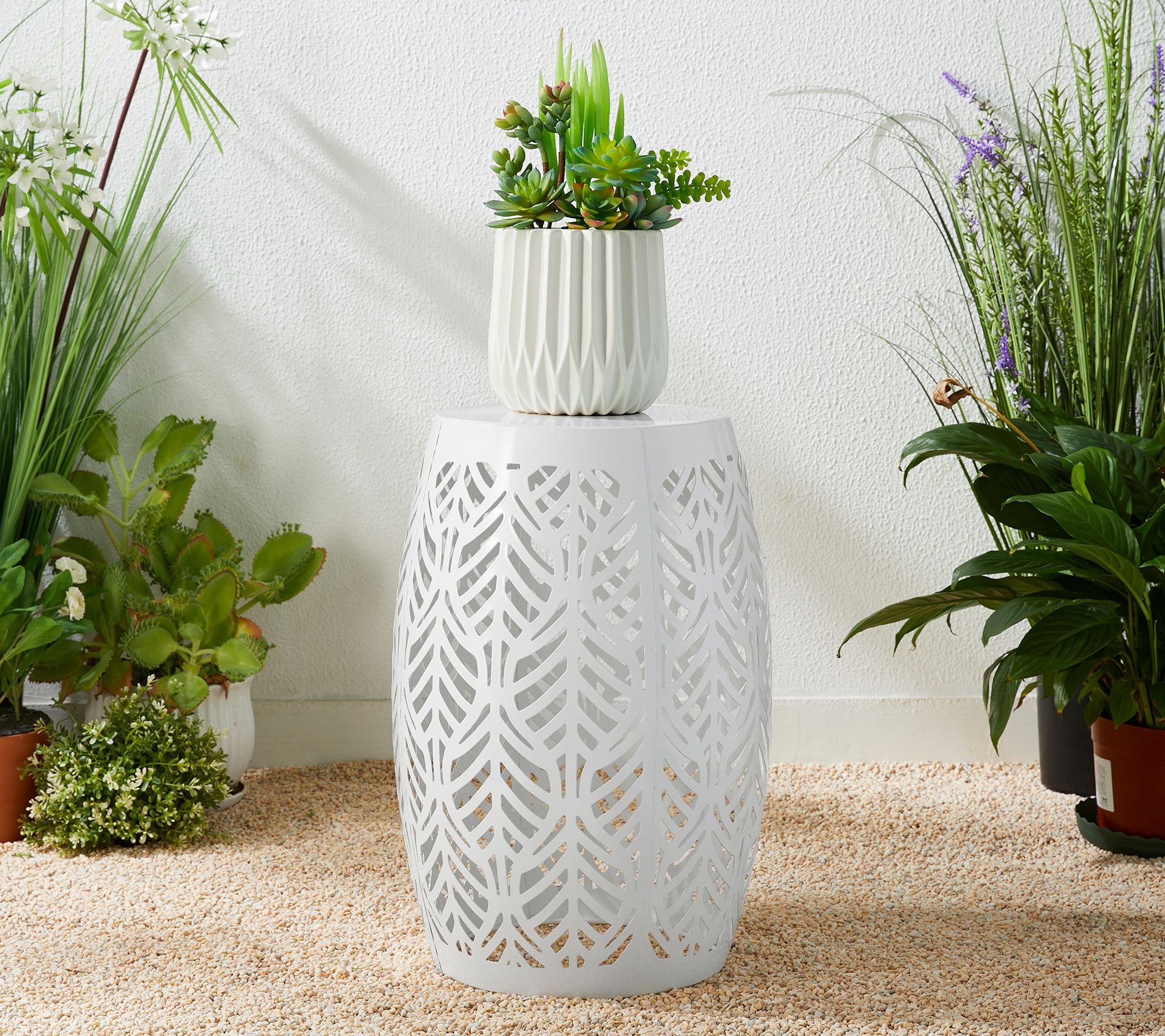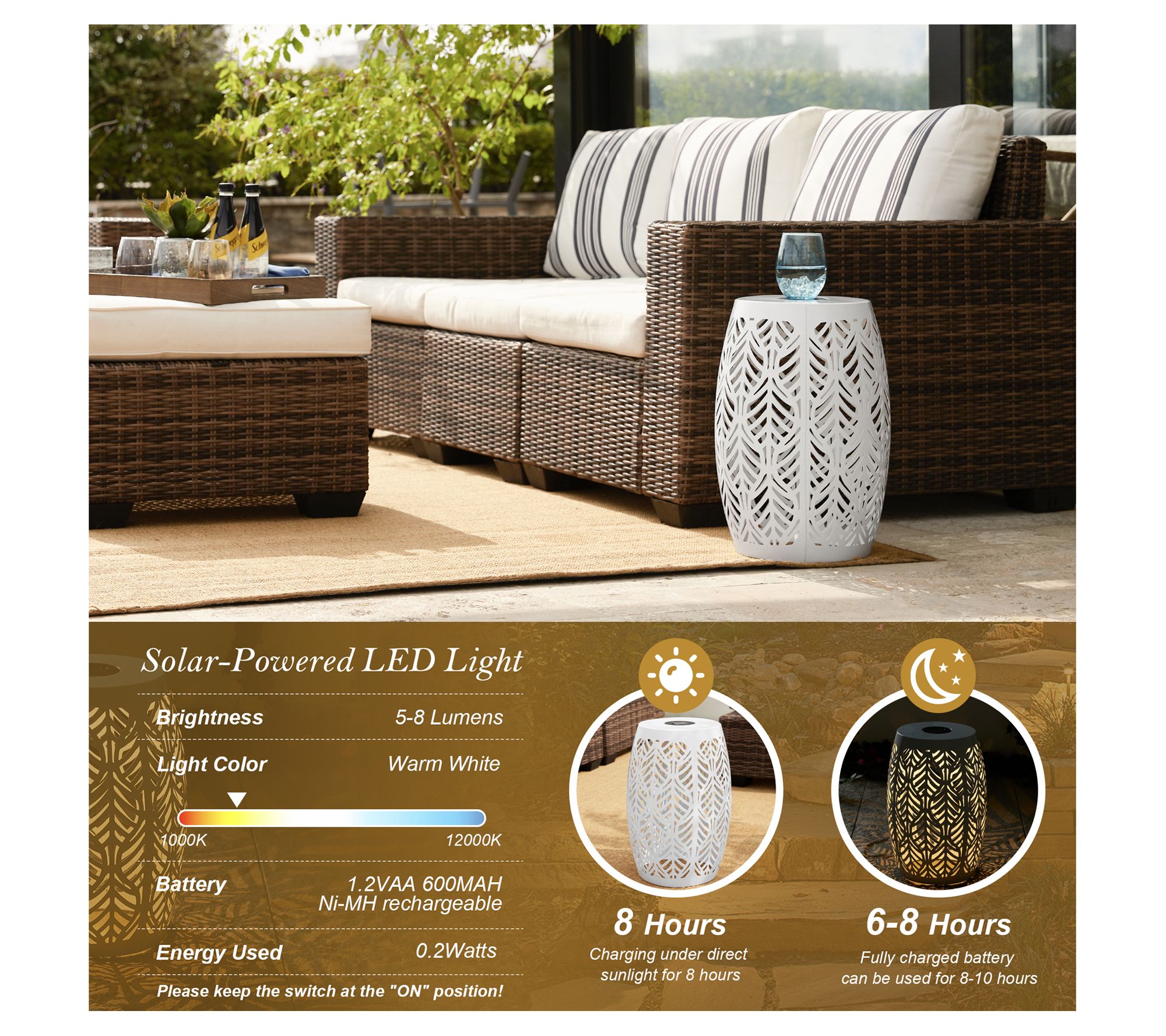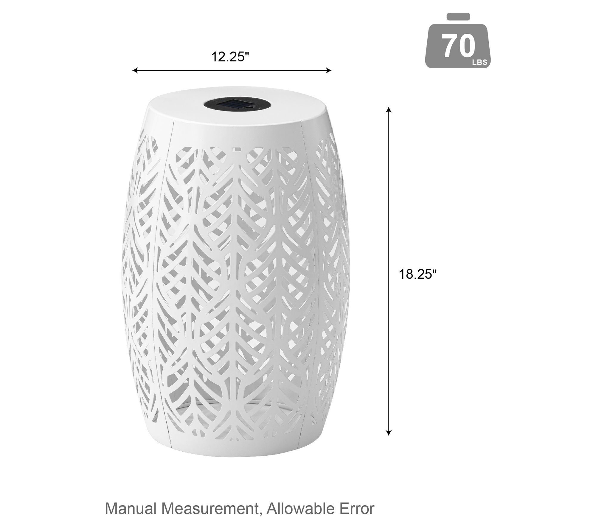 Enhance your outdoor gatherings with this charming Boho-style garden stool. Featuring a classic drum silhouette and beautiful cutout patterns, it includes a warm white LED light that casts intriguing shadows. Use it as a solar lantern, planter stand, or side table to create a delightful and relaxing ambiance. From Glitzhome.