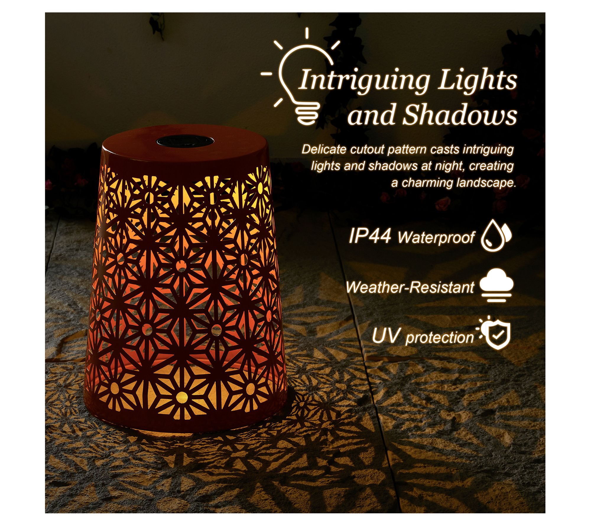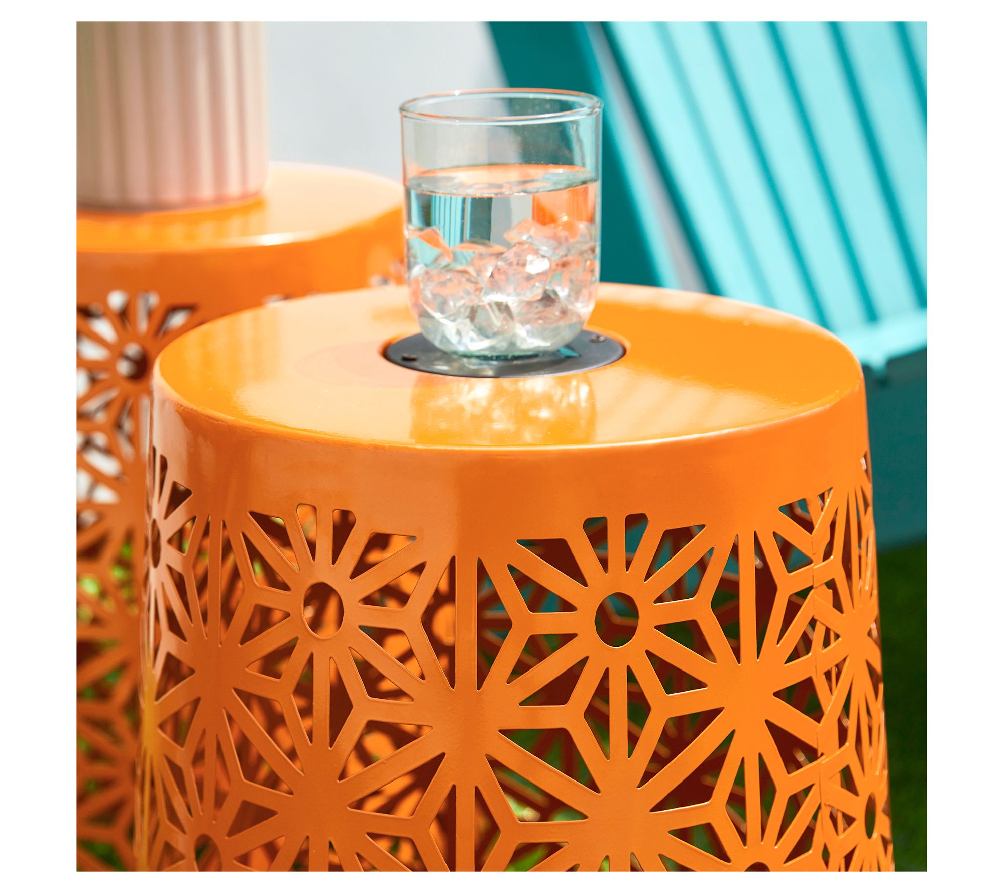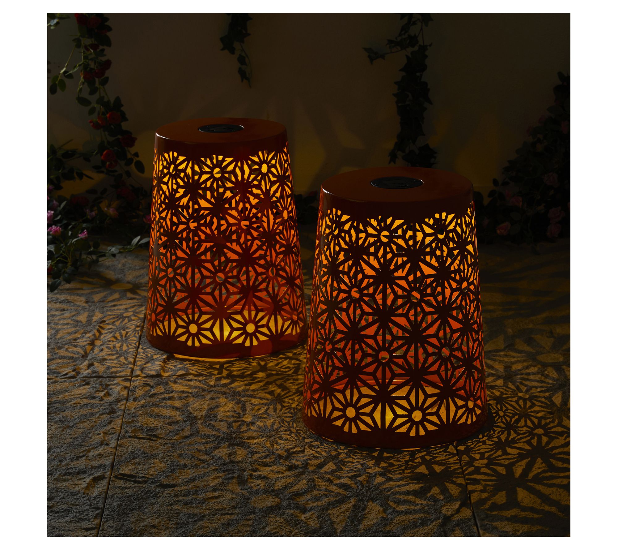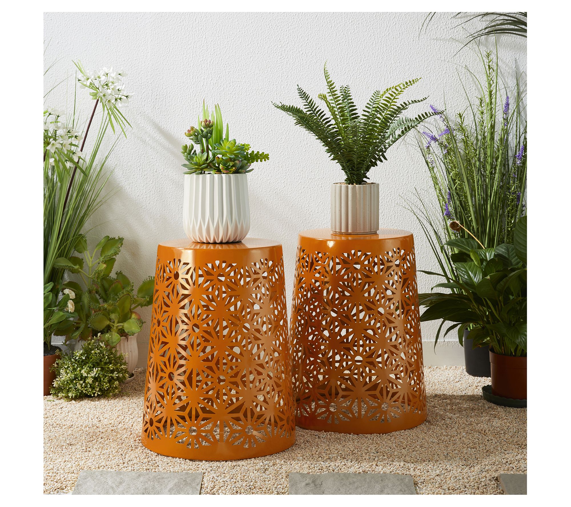 Evoke a serene and inviting ambiance in your garden or patio with these exquisite Geo Cutout LED Solar Lighted Garden Stools. The intricate geometric patterns combined with a glossy orange finish create a captivating warm glow that enhances your outdoor gatherings. Versatile in use, they can serve as lanterns, planter stands, or side tables, making them perfect for any occasion. Simple elegance at its best! From Glitzhome.