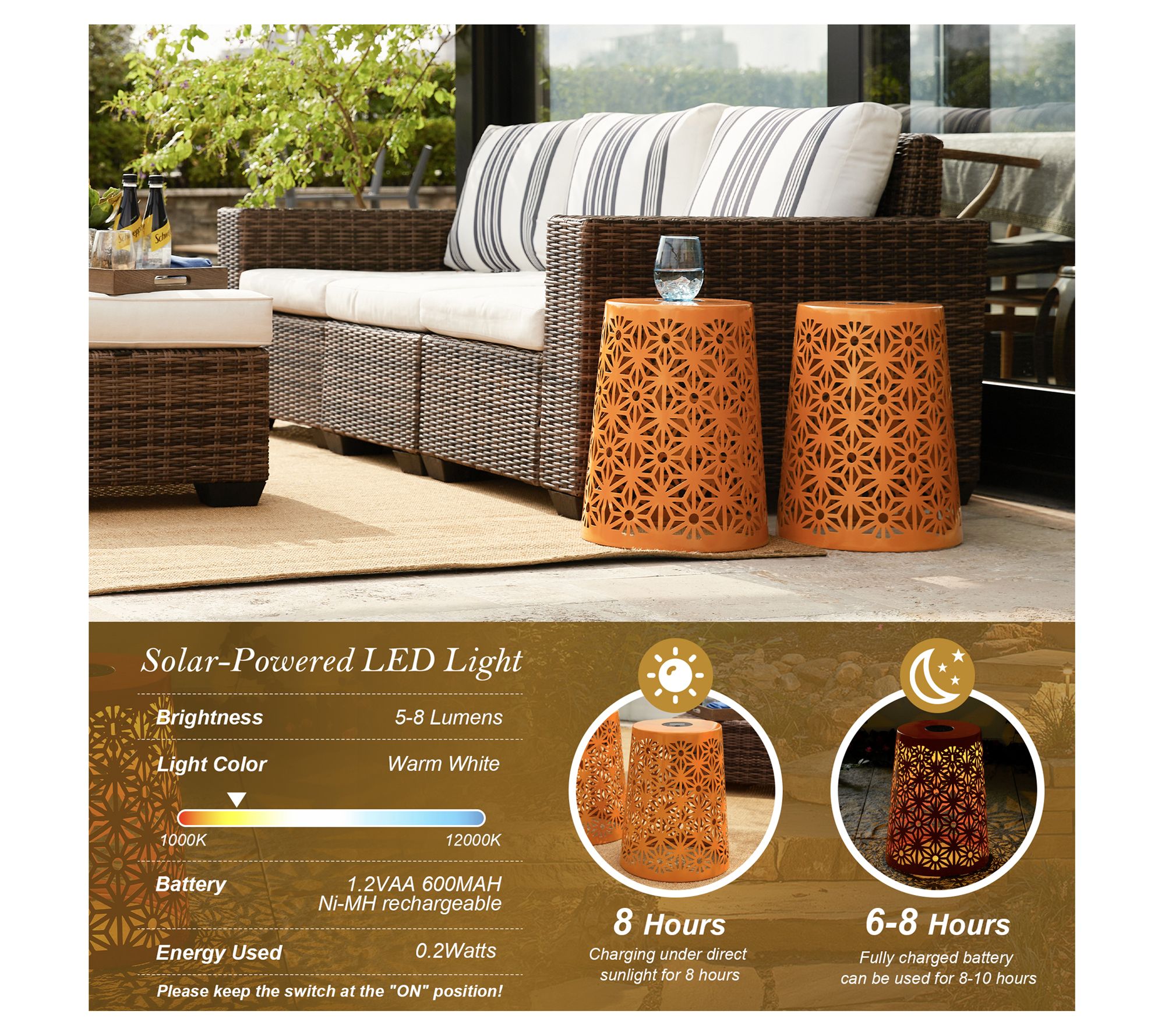 • Includes two garden stools and 2 AA batteries