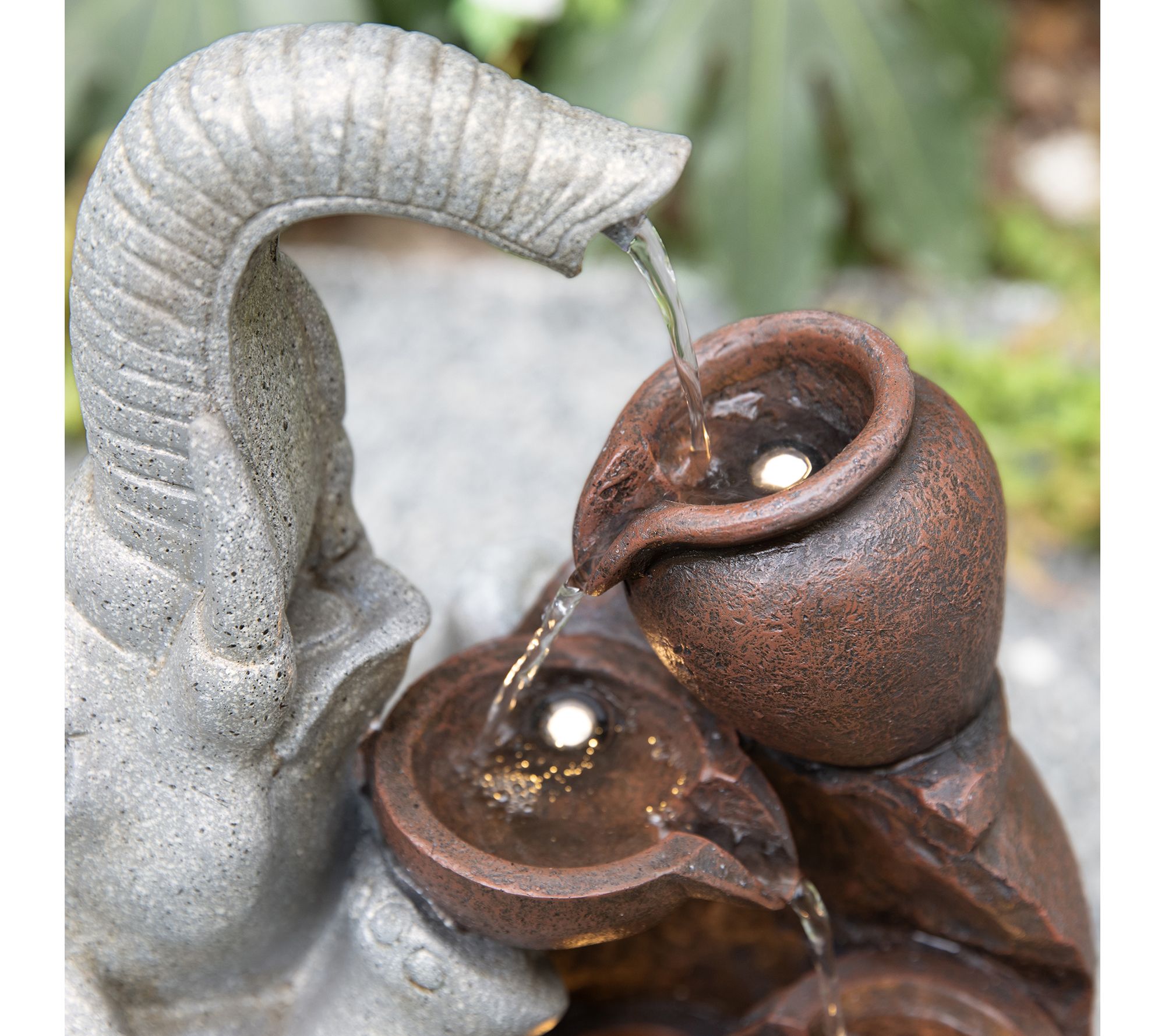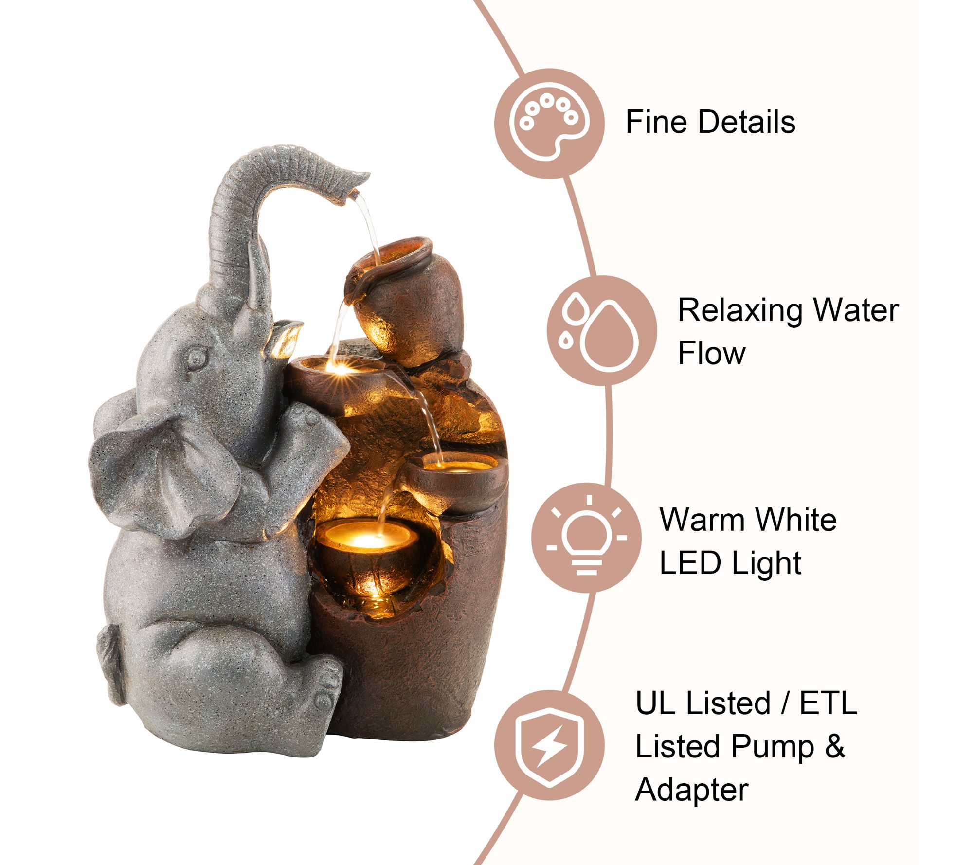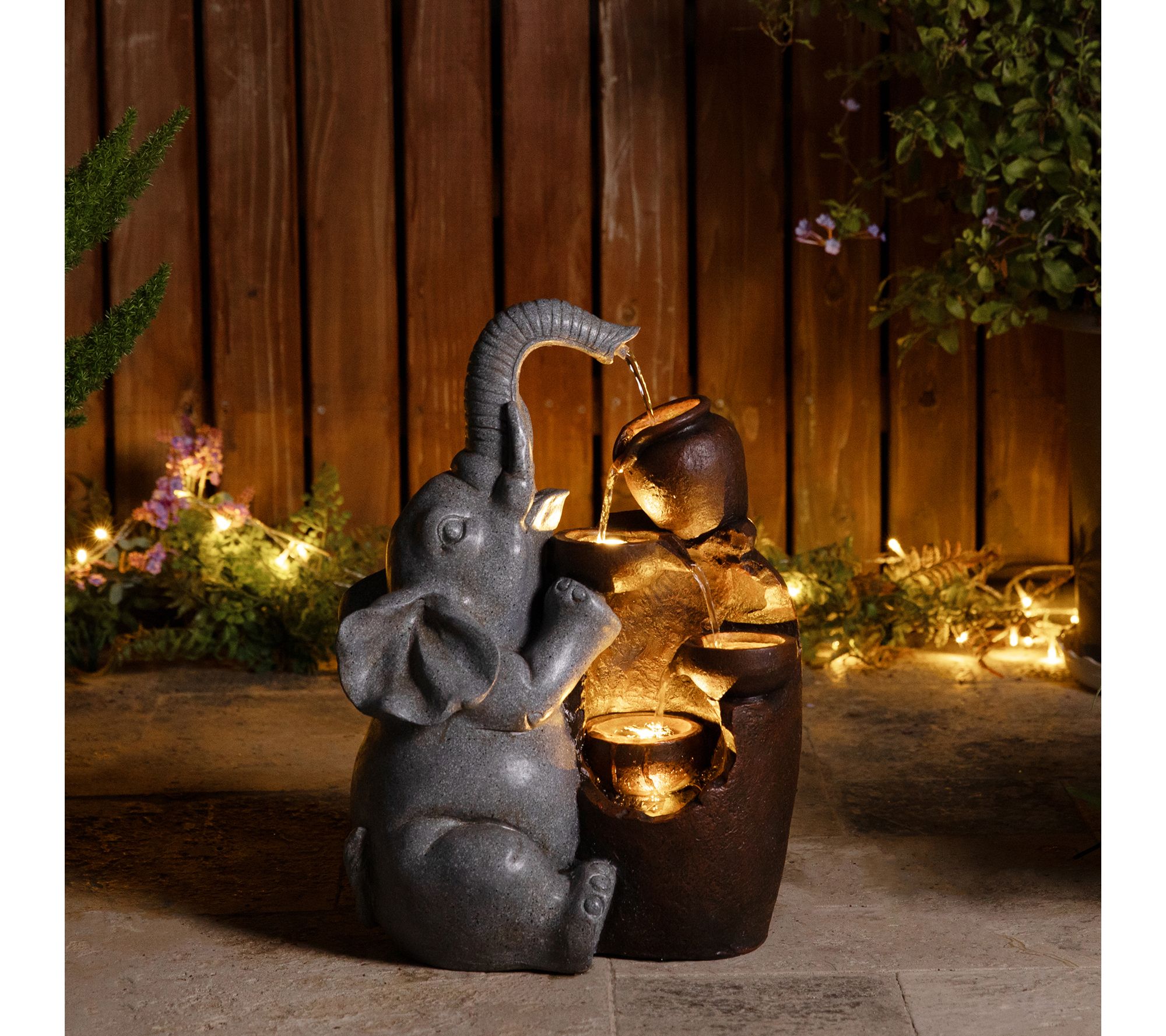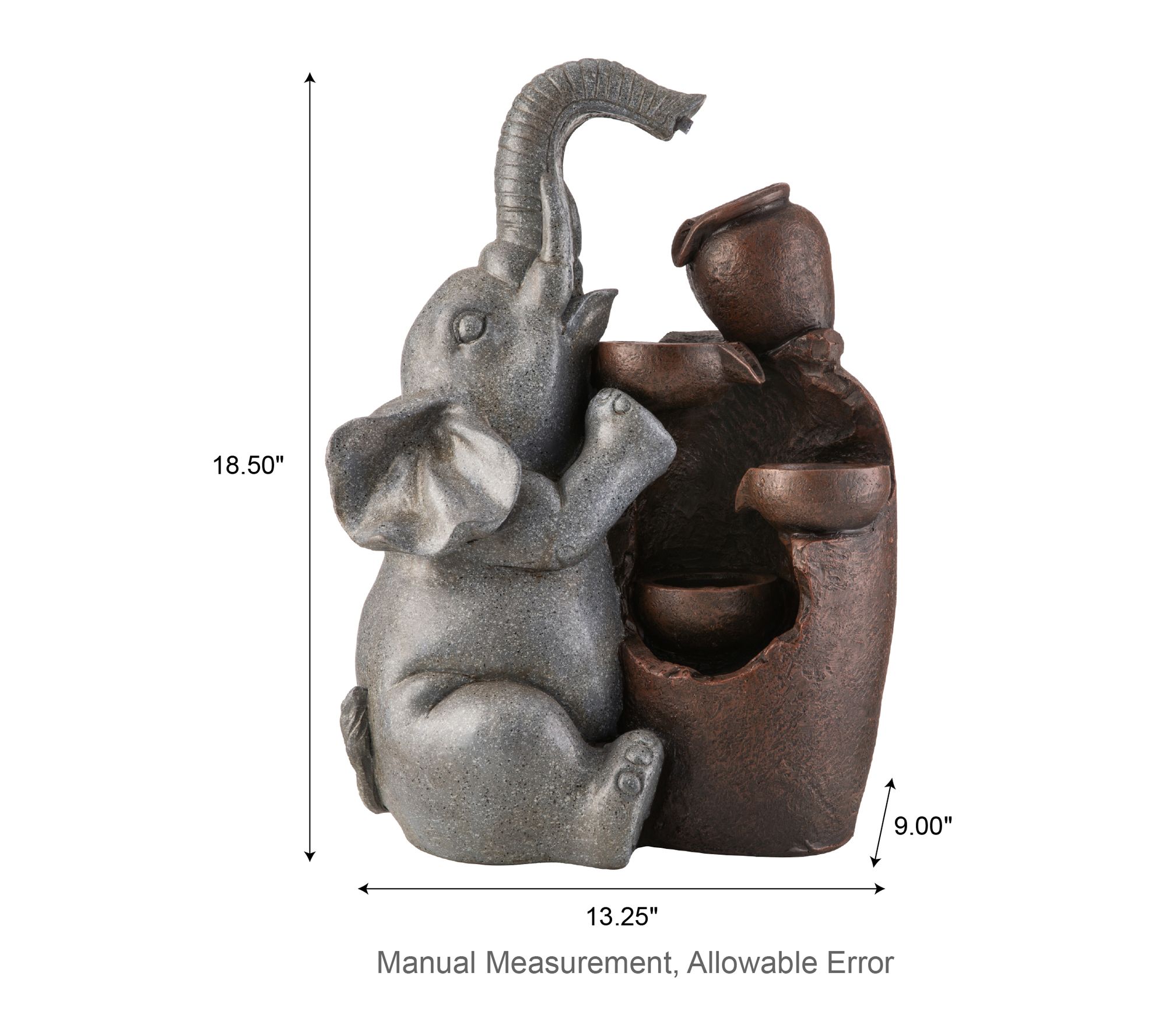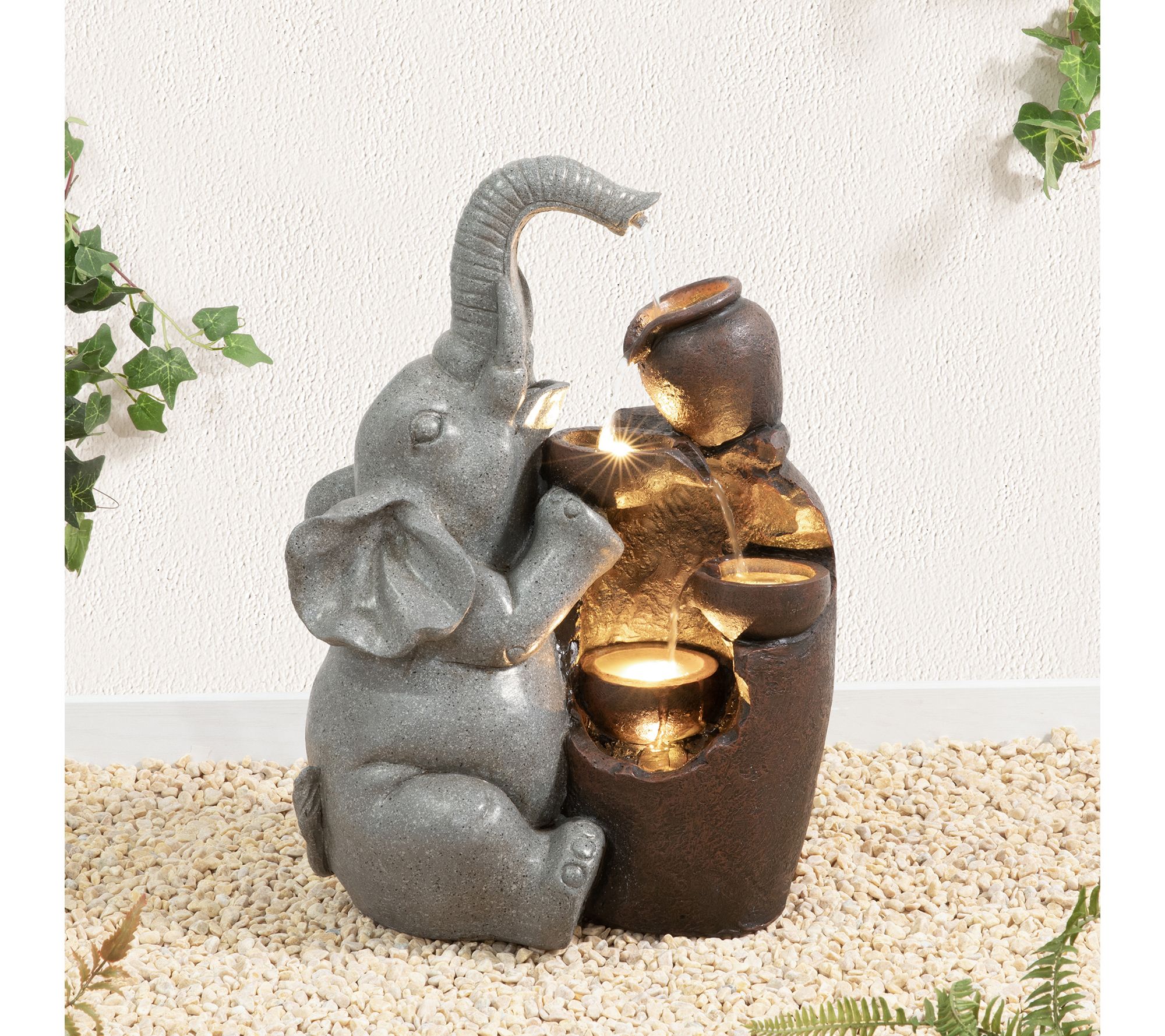 • Features 4-tiered water flow with playful elephant and pot design