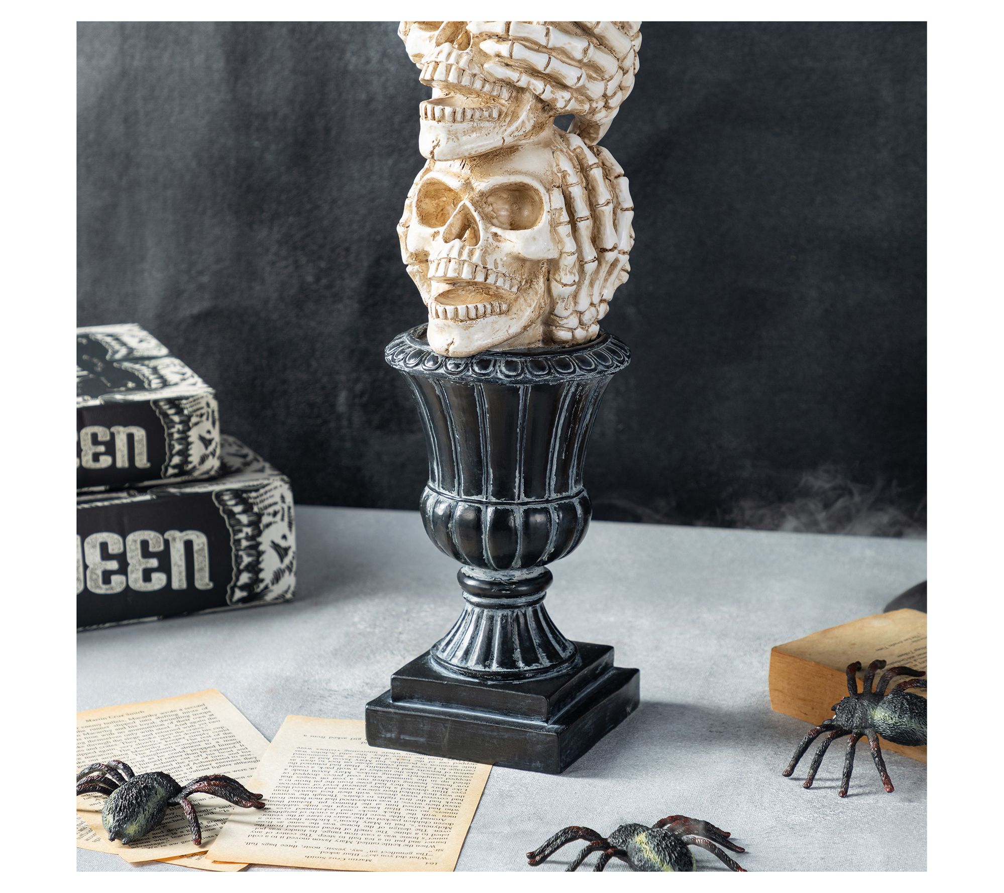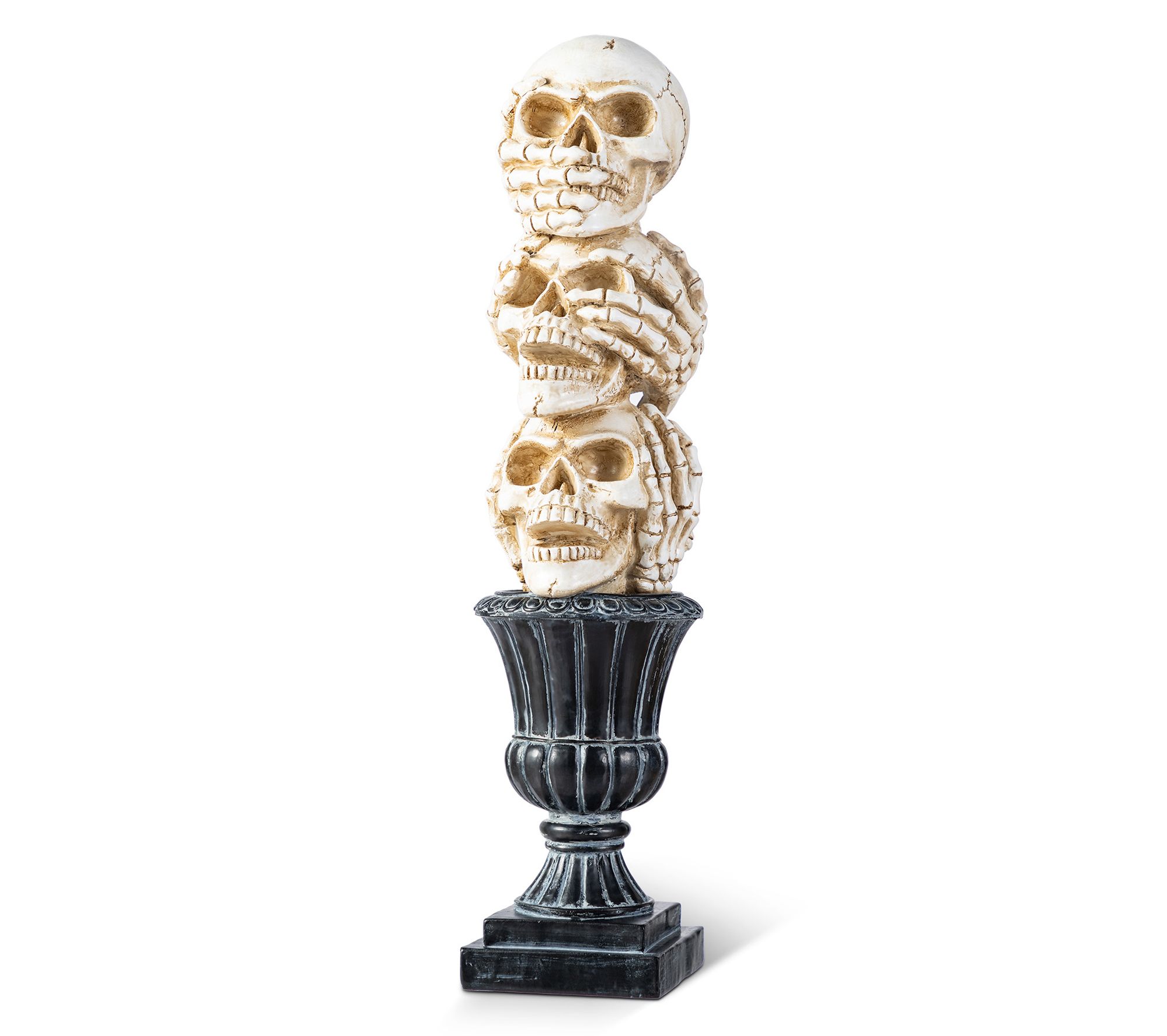 Set a chilling scene at your next Halloween gathering with this whimsically eerie stack of expressive skulls. Resting atop a classic urn-shaped base, this gothic accent adds instant intrigue, whether anchoring a buffet or making a dramatic entranceway statement. The detailed carvings beg a closer look -- and spark plenty of conversation. From Glitzhome.