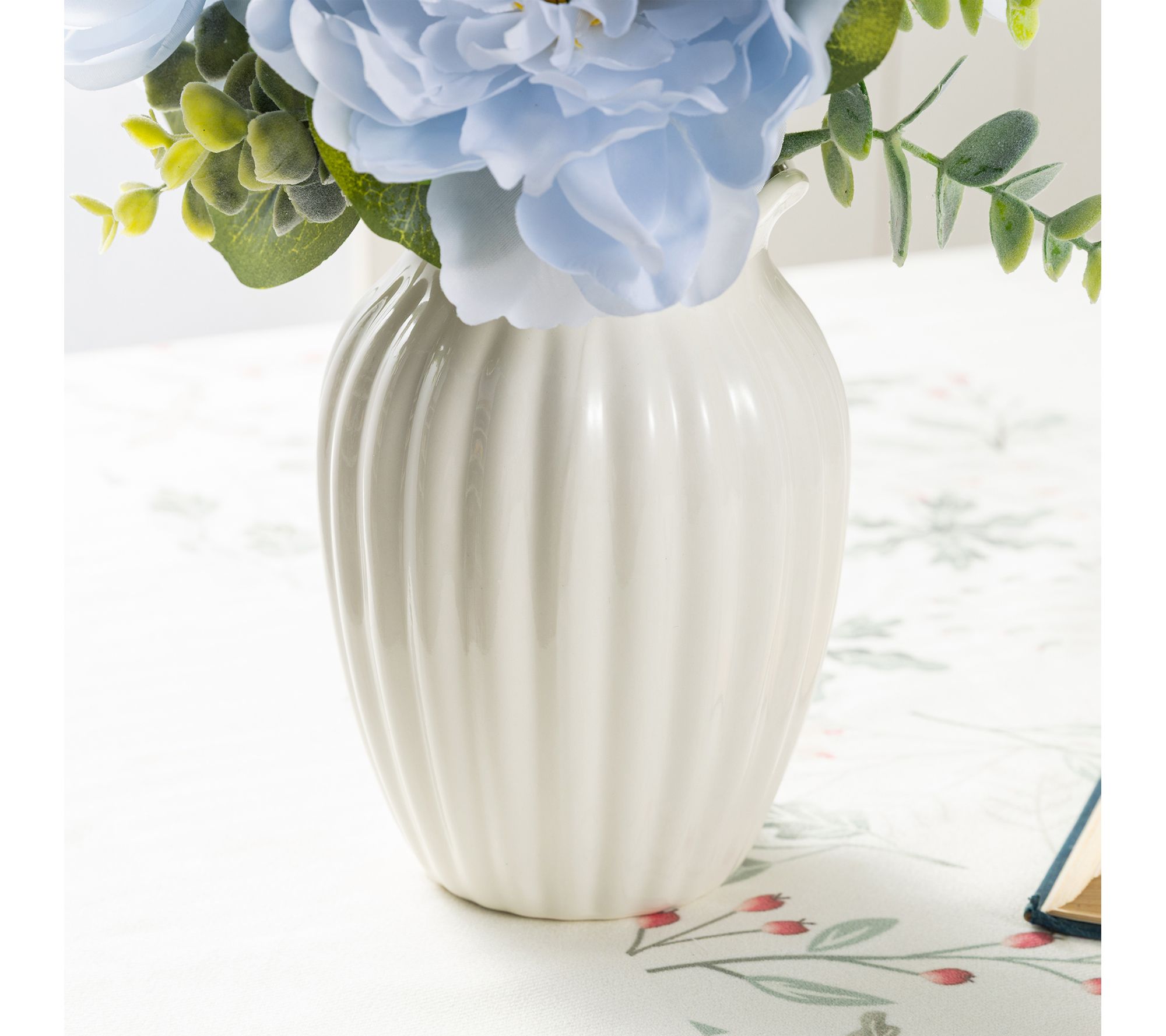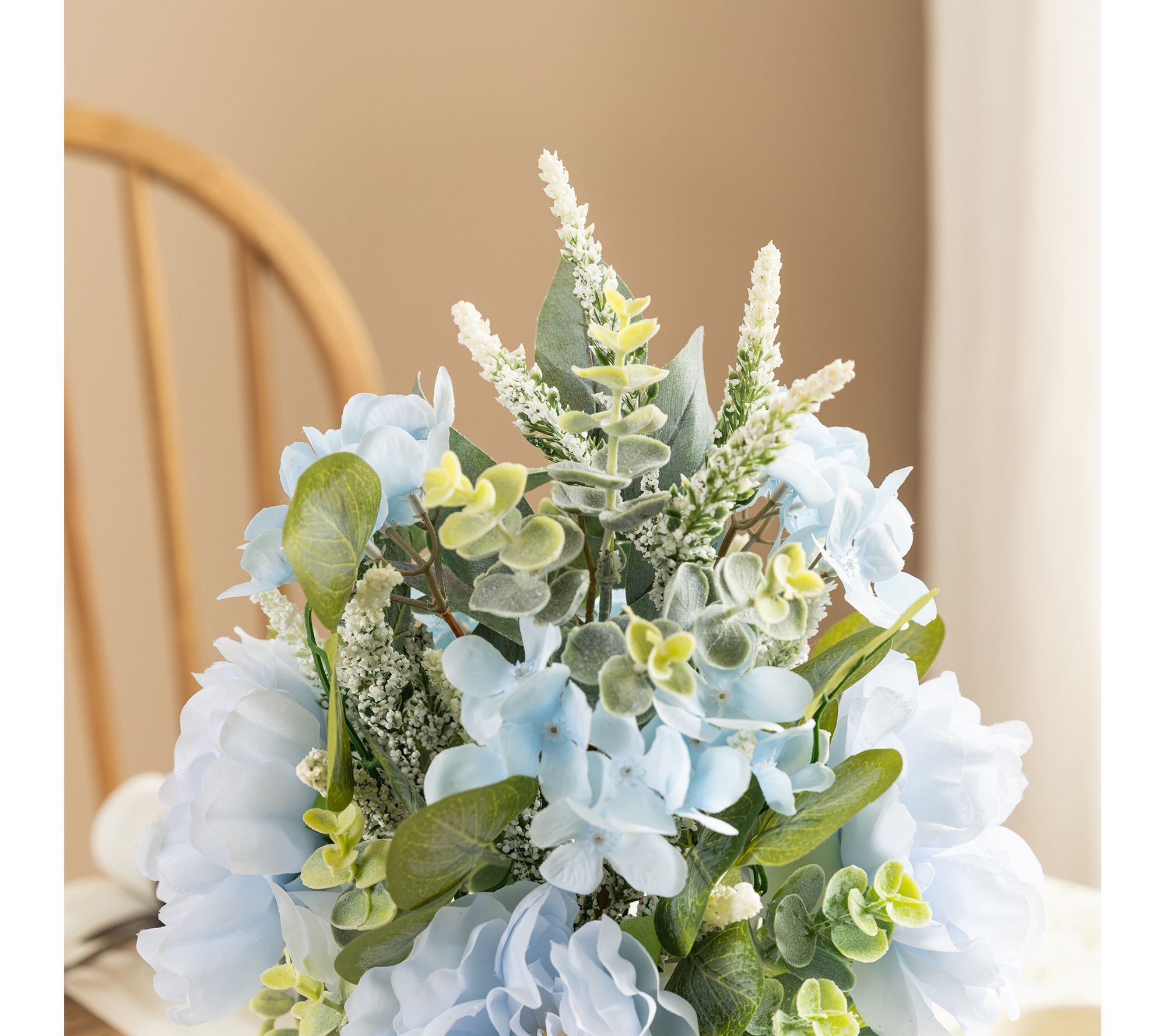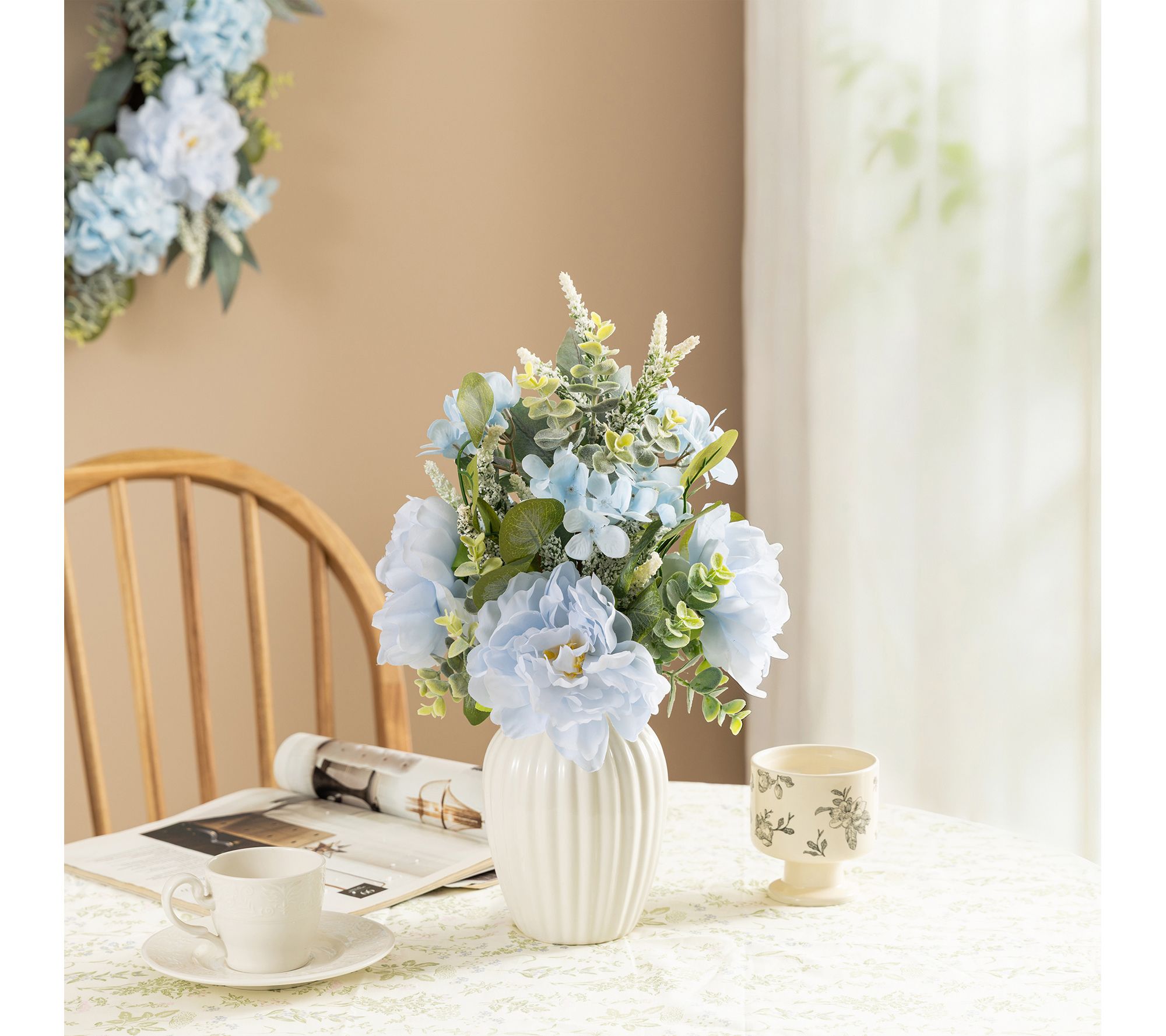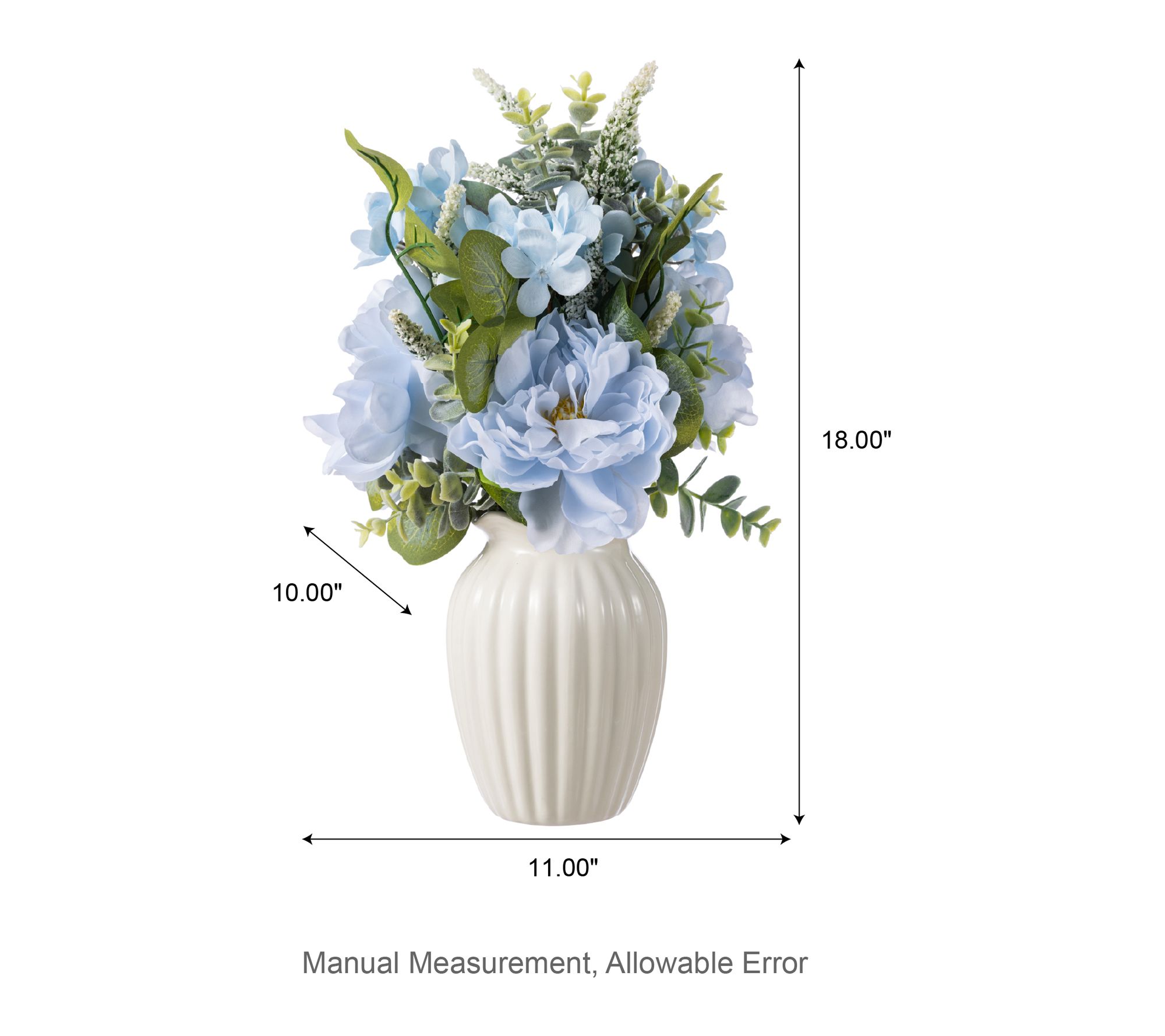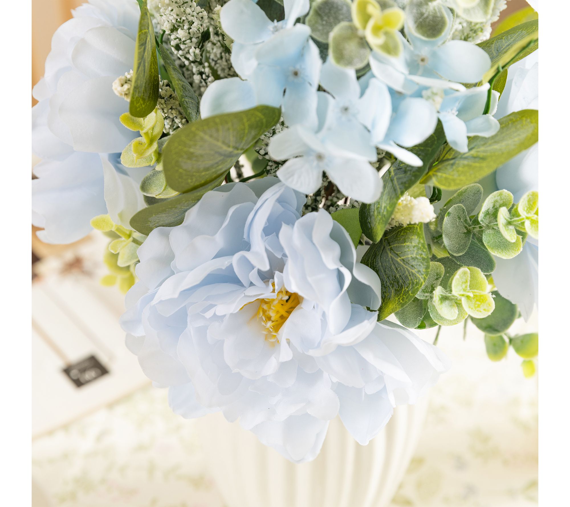 • Includes centerpiece with lifelike blue peonies, hydrangeas, green foliage, and white ceramic vase