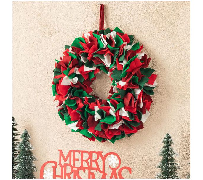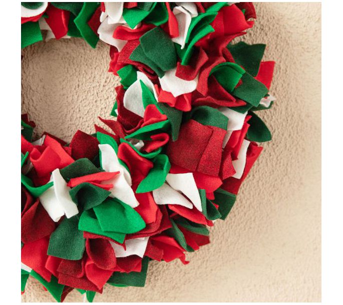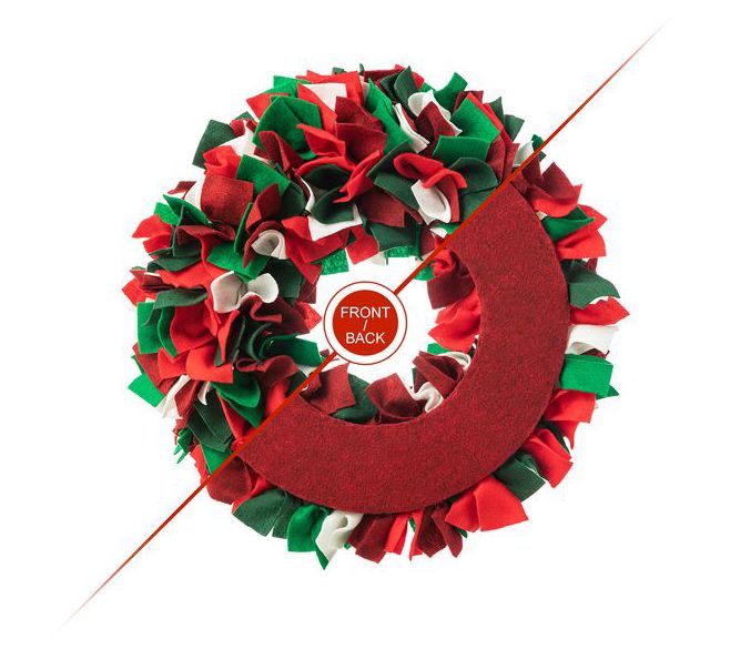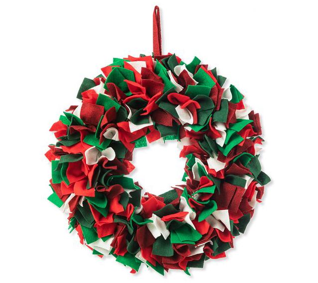 Here's a whimsical way to dress up your door! This fluffy wreath is crafted from red, green, and white felt to give a cheery pop of color to your decor. From Glitzhome.