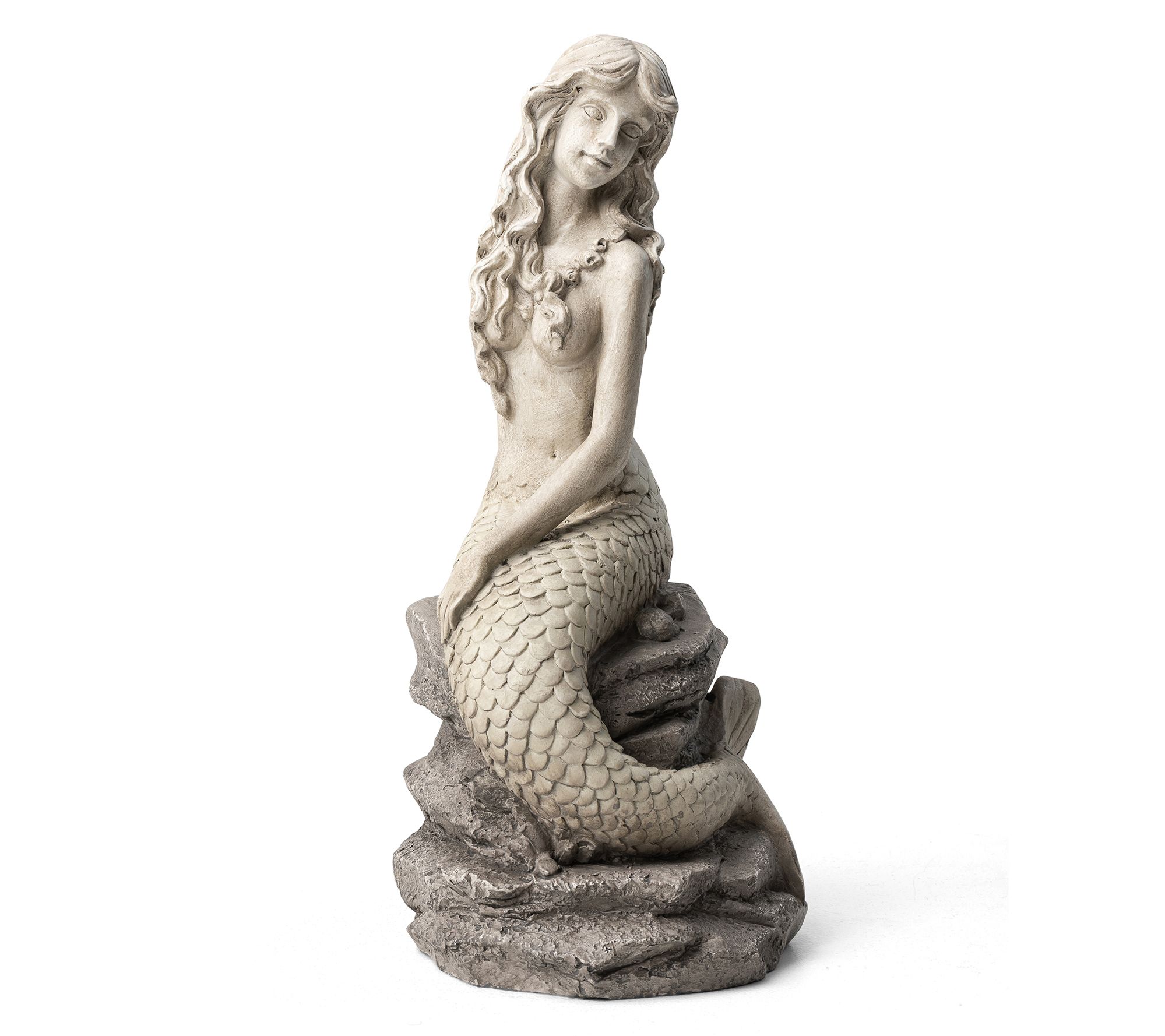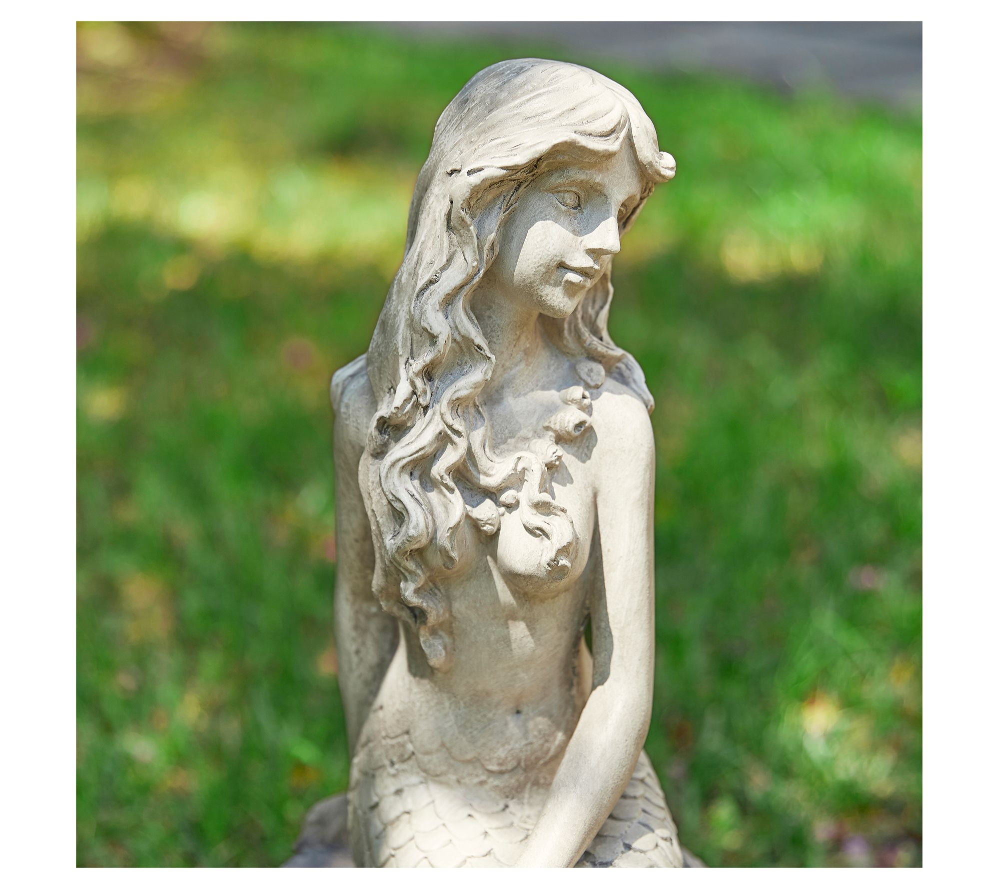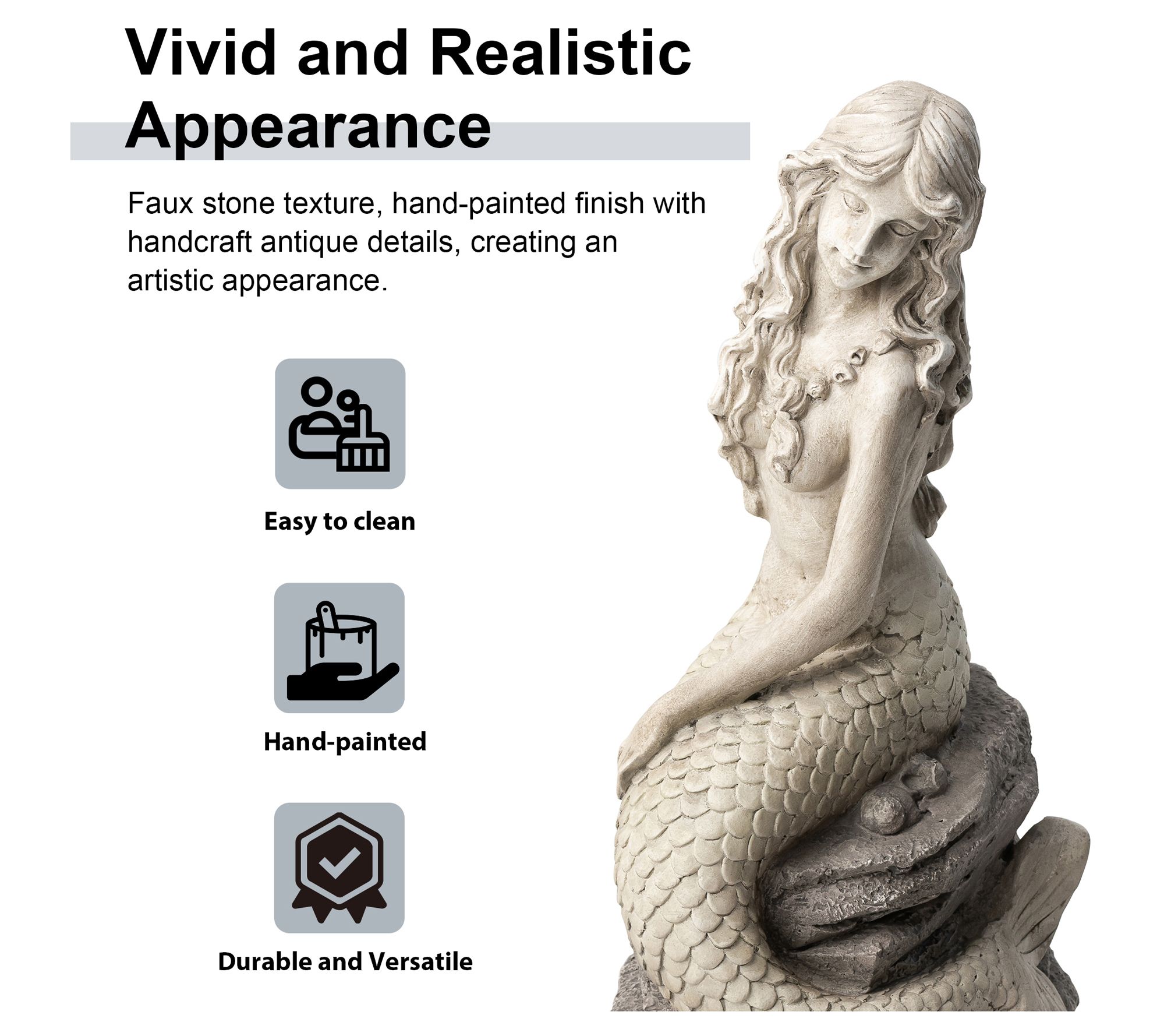 Enhance your home or garden with this classic and elegant mermaid statue. Seated gracefully upon a rock, the mermaid exudes a serene and enchanting aura. Its faux stone texture and artistic antique details make it blend effortlessly into various landscapes, creating a playful ambiance. Perfect for adding a unique touch to your garden, patio, or indoor spaces. From Glitzhome.