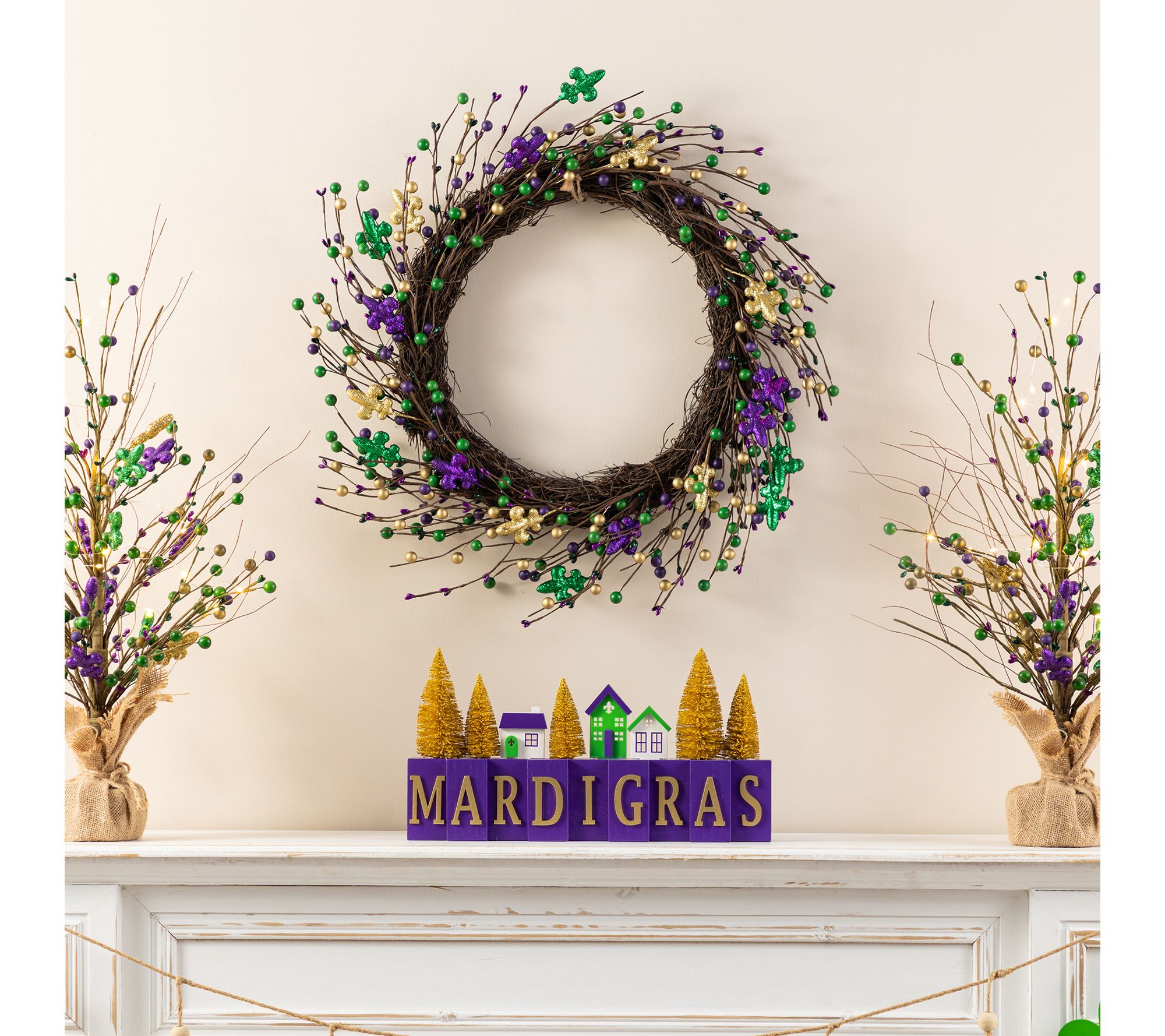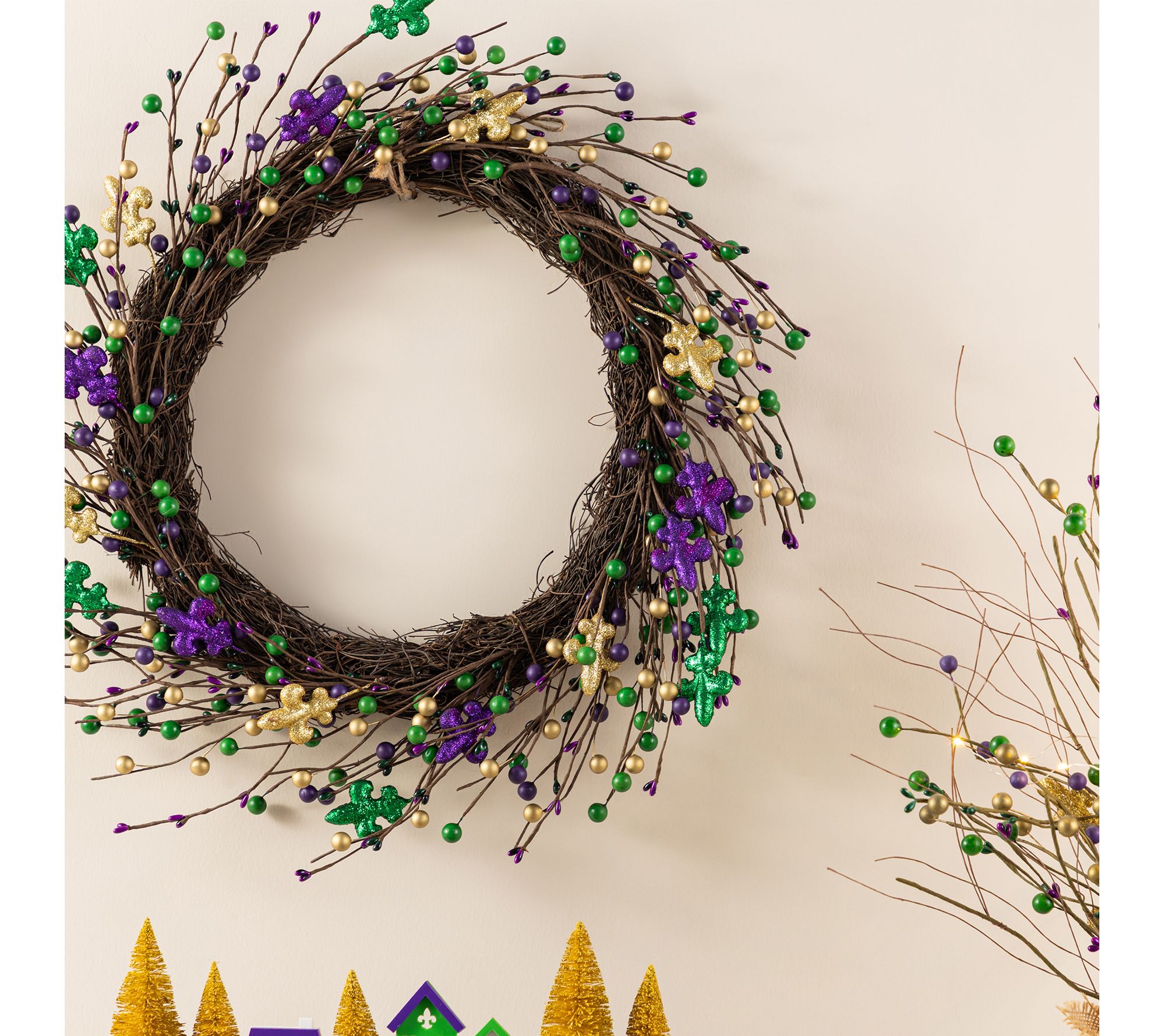 • Lifelike berry accents and fleur-de-lis design create a festive Mardi Gras look
