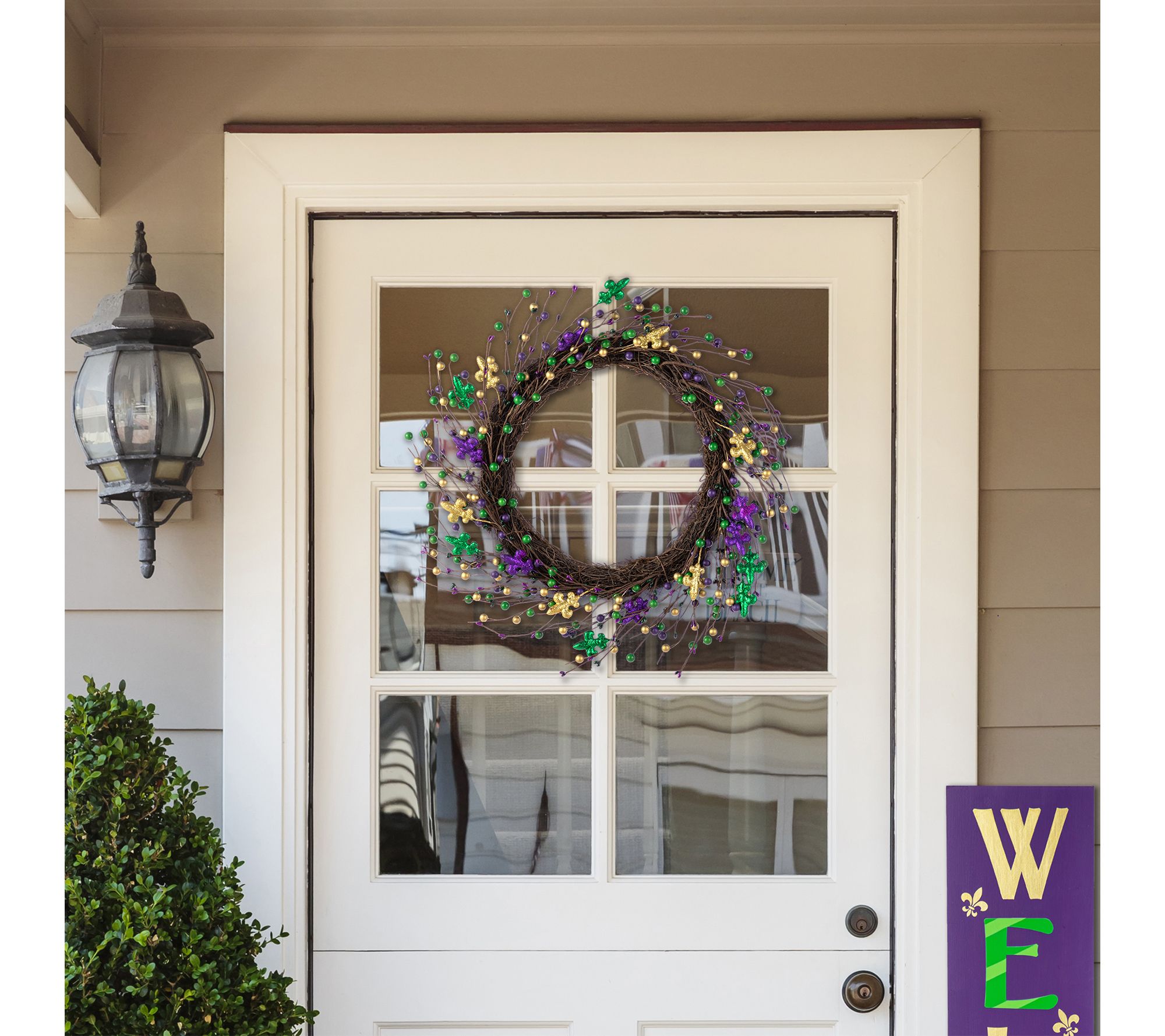 Welcome guests and celebrate the spirit of Mardi Gras with this vibrant faux wreath, featuring festive berry accents and a bold fleur-de-lis design. Perfect for brightening your front door or adding a pop of color to your mantel, this eye-catching decoration brings joyful charm to any space all season long. From Glitzhome.