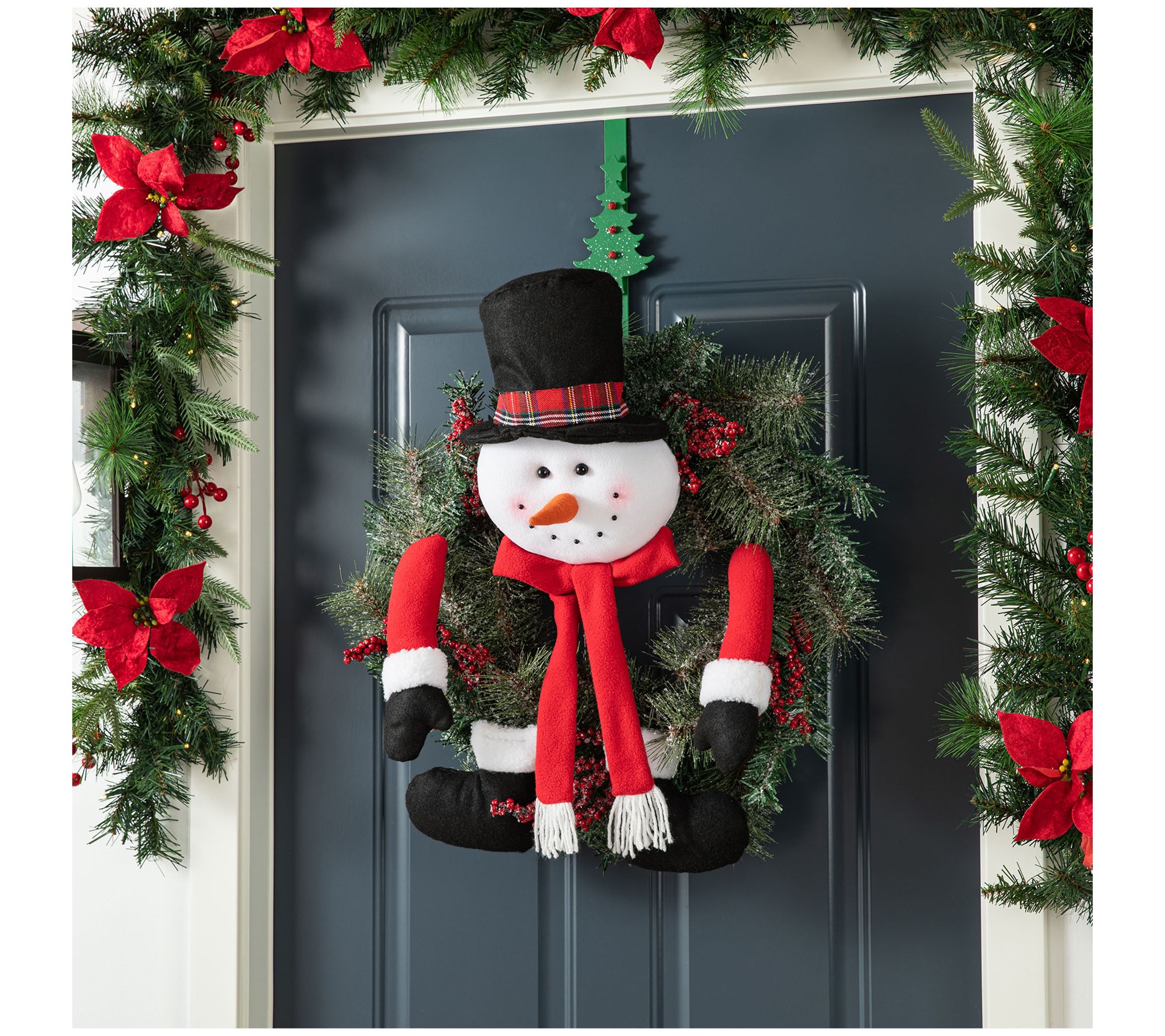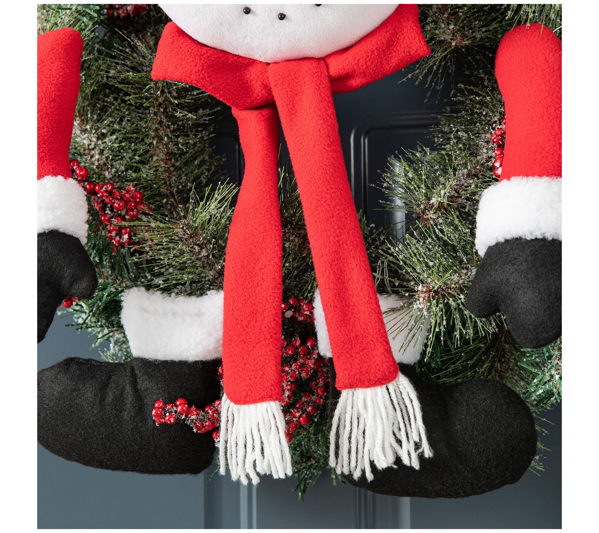 • Lifelike pine wreath with red berries and DIY fabric snowman ornament