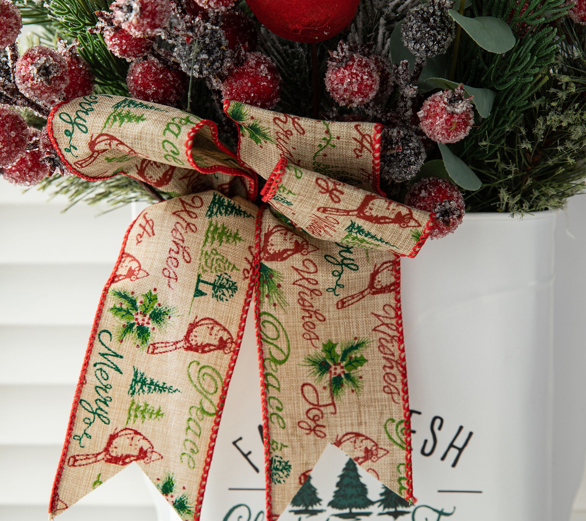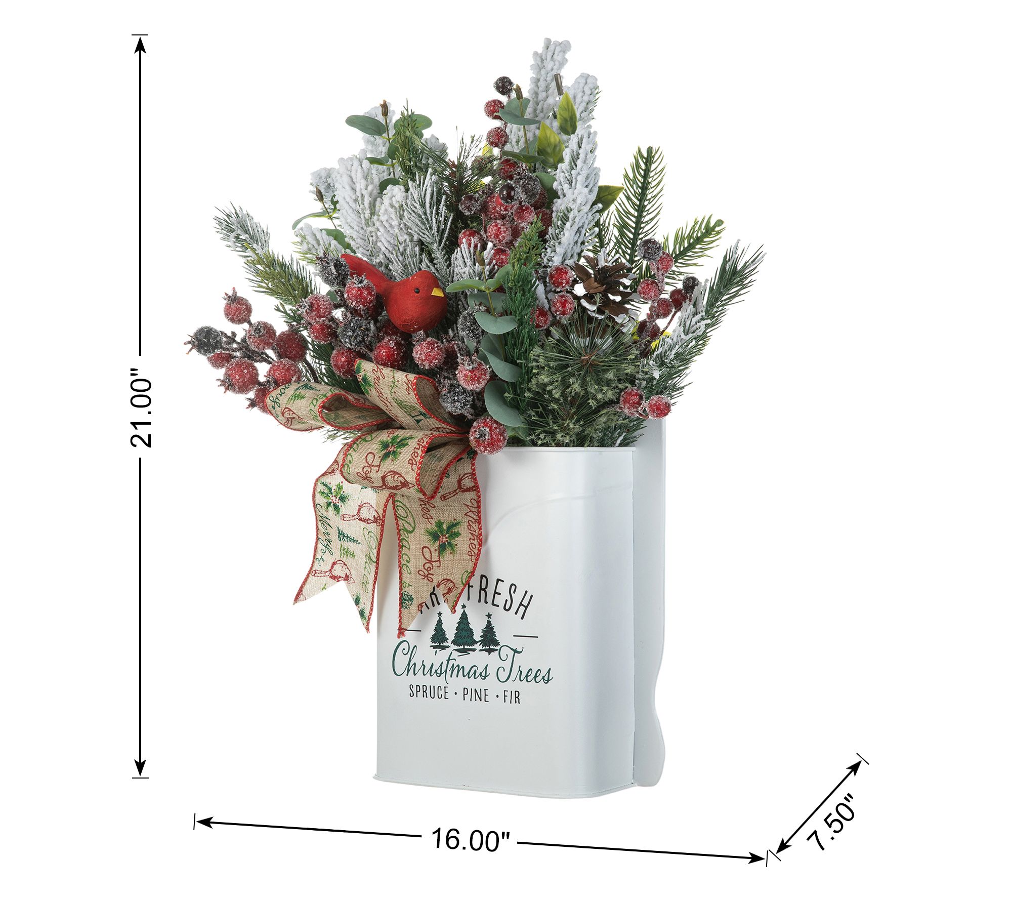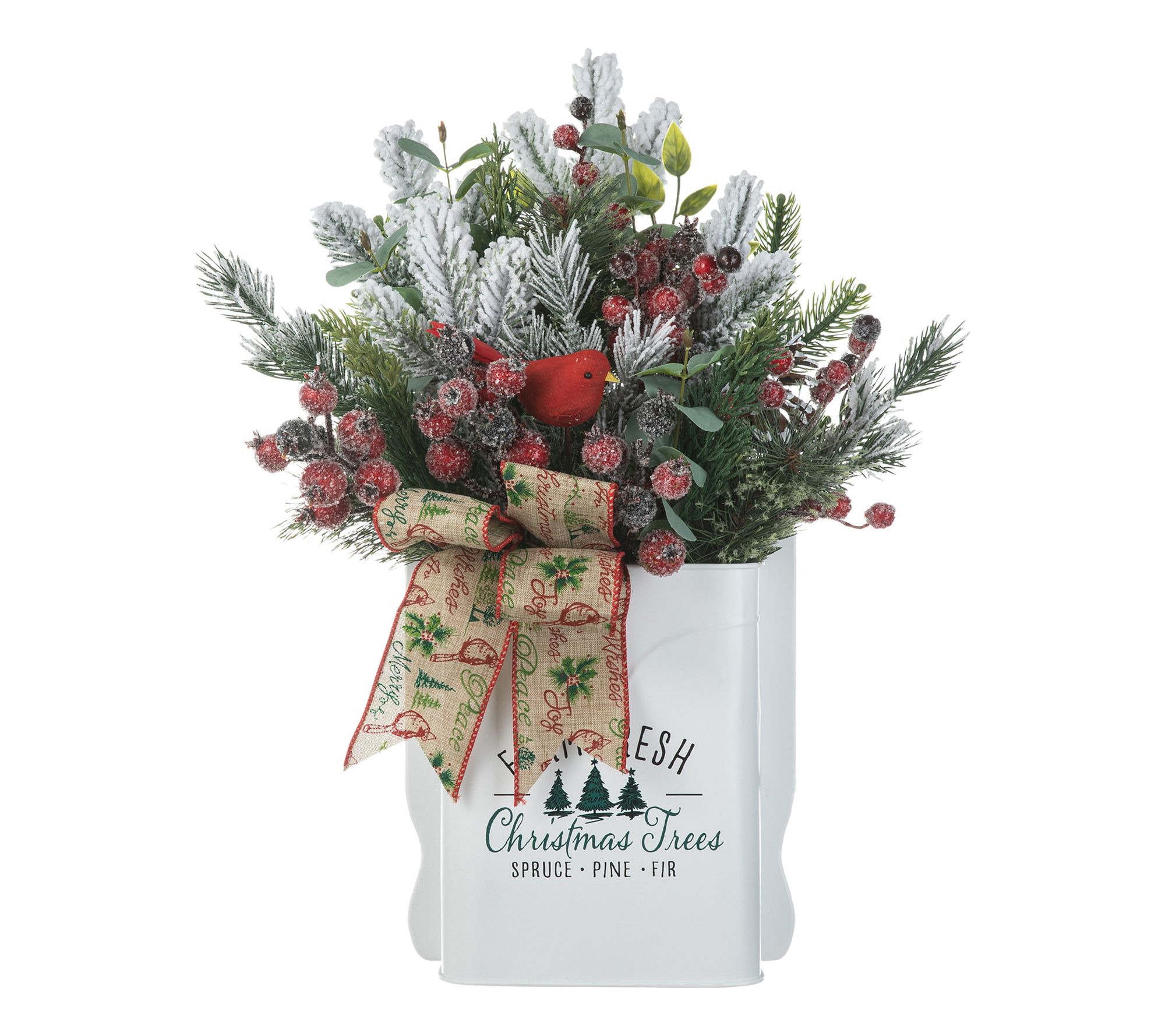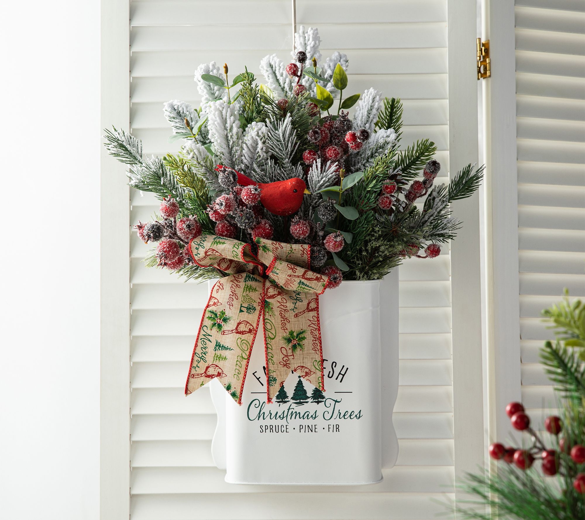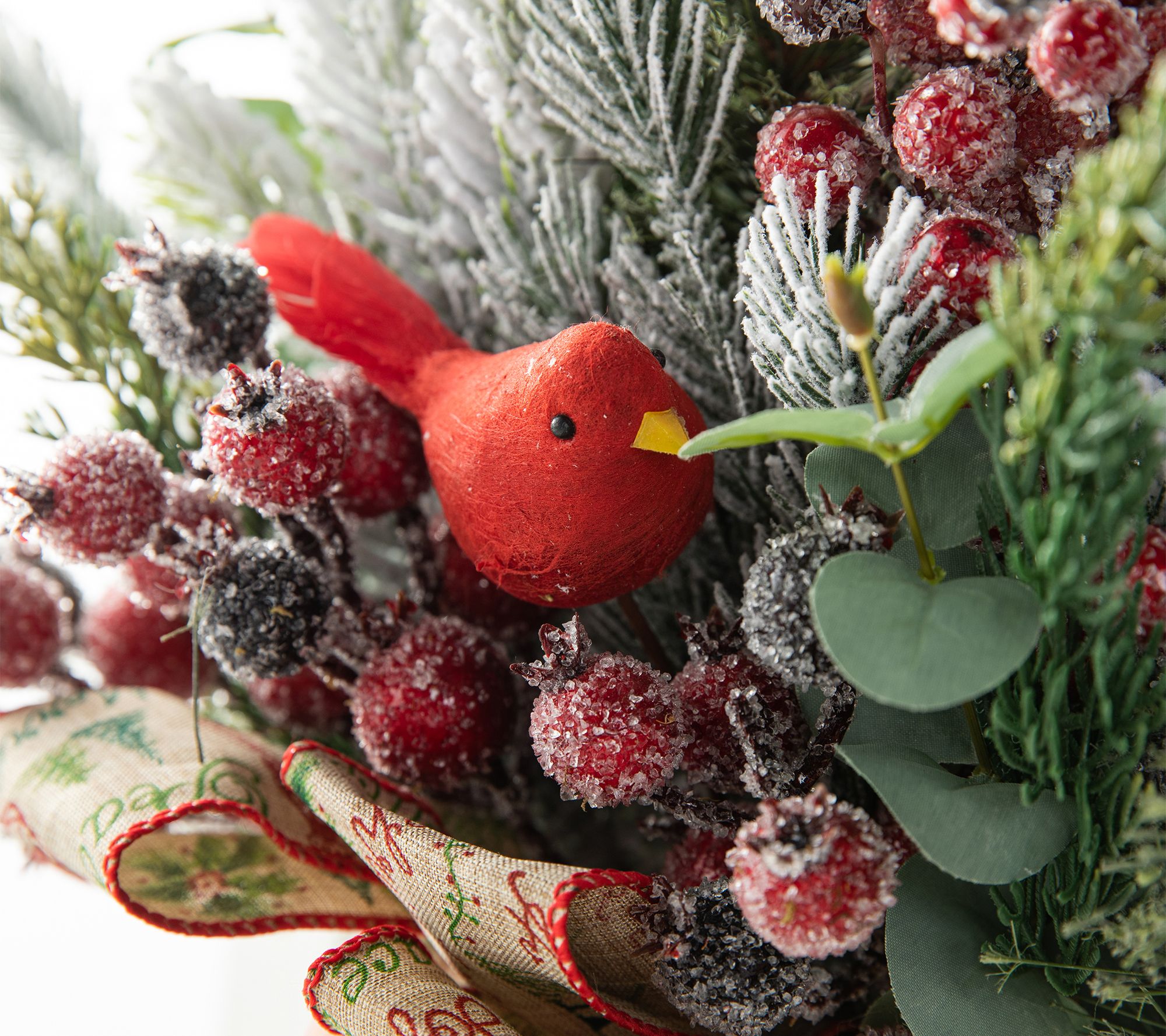 Add a touch of holiday spirit to your home with this faux pine needle and berry ribbon centerpiece. Featuring a charming cardinal perched among lifelike red and green flowers, this centerpiece creates a festive atmosphere perfect for any celebration. From Glitzhome.