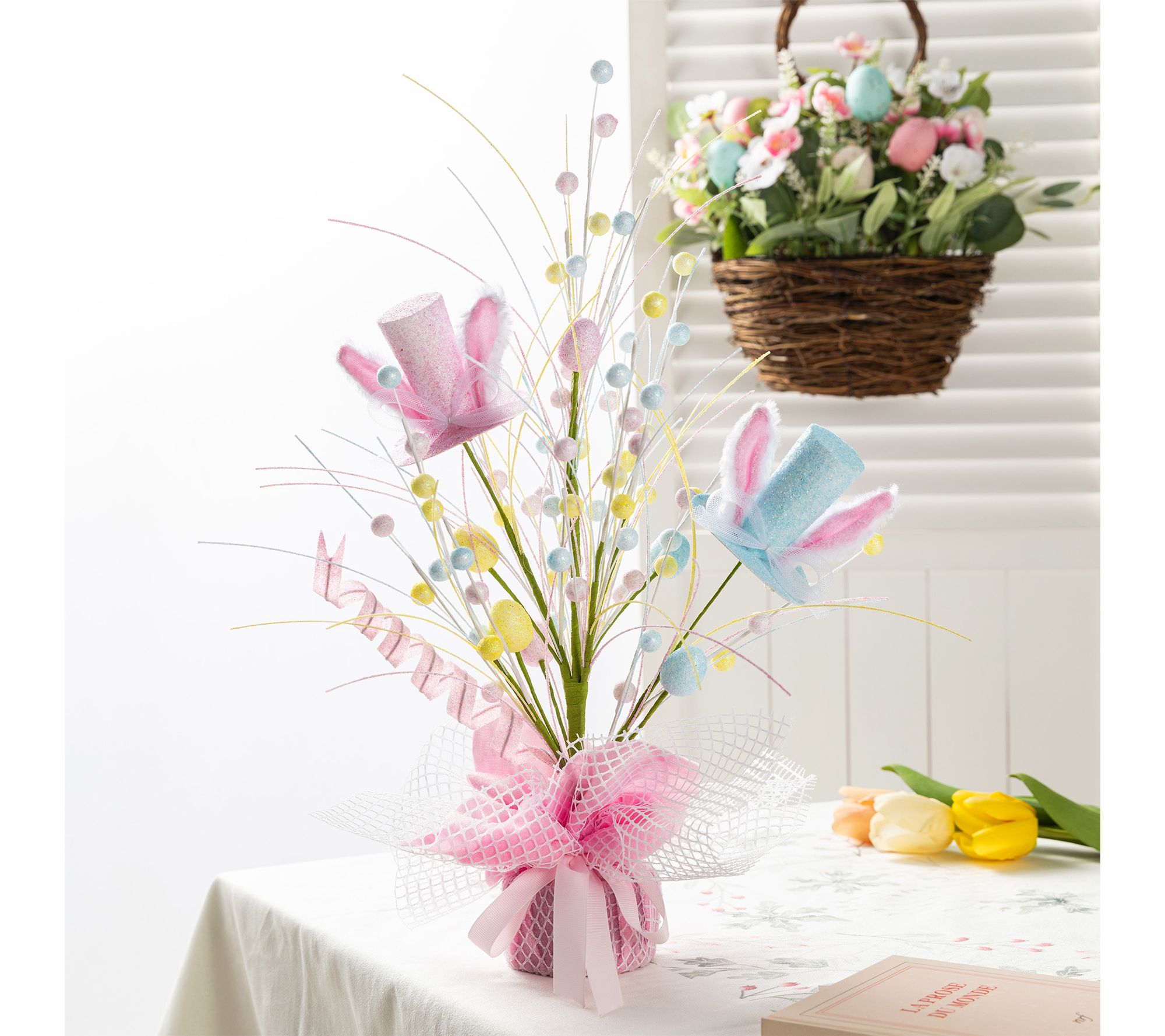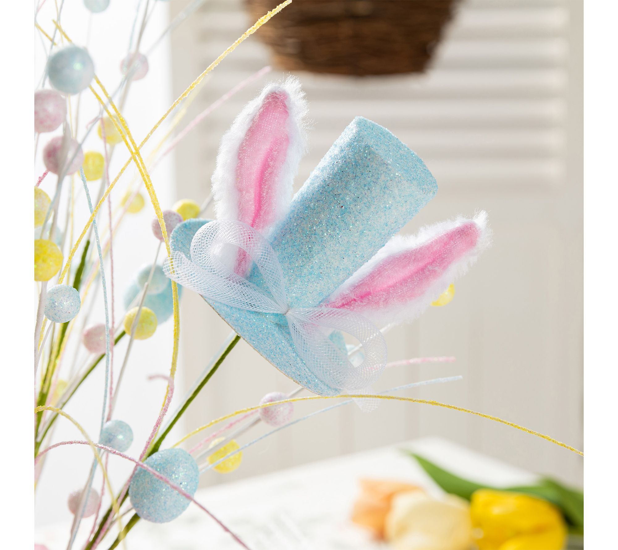 Celebrate the joy of spring and Easter gatherings with this festive table tree, adorned with pastel glitter eggs, playful top hats featuring bunny ears, and delicate sprigs. Nestled on a pink wrapped base with a bow, this whimsical decorative accent brings a cheerful pop of color to mantels, side tables, and entryways. From Glitzhome.