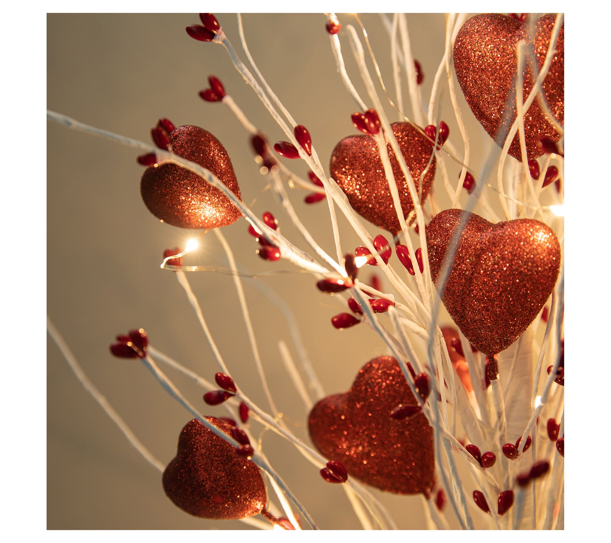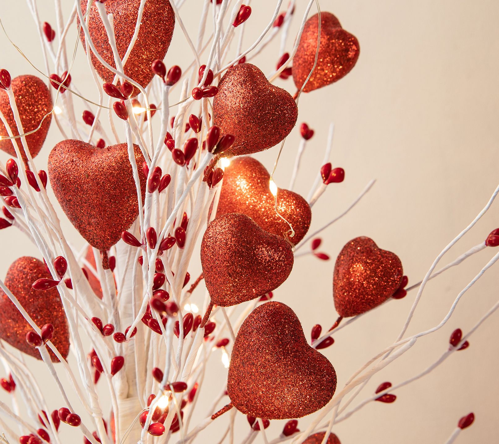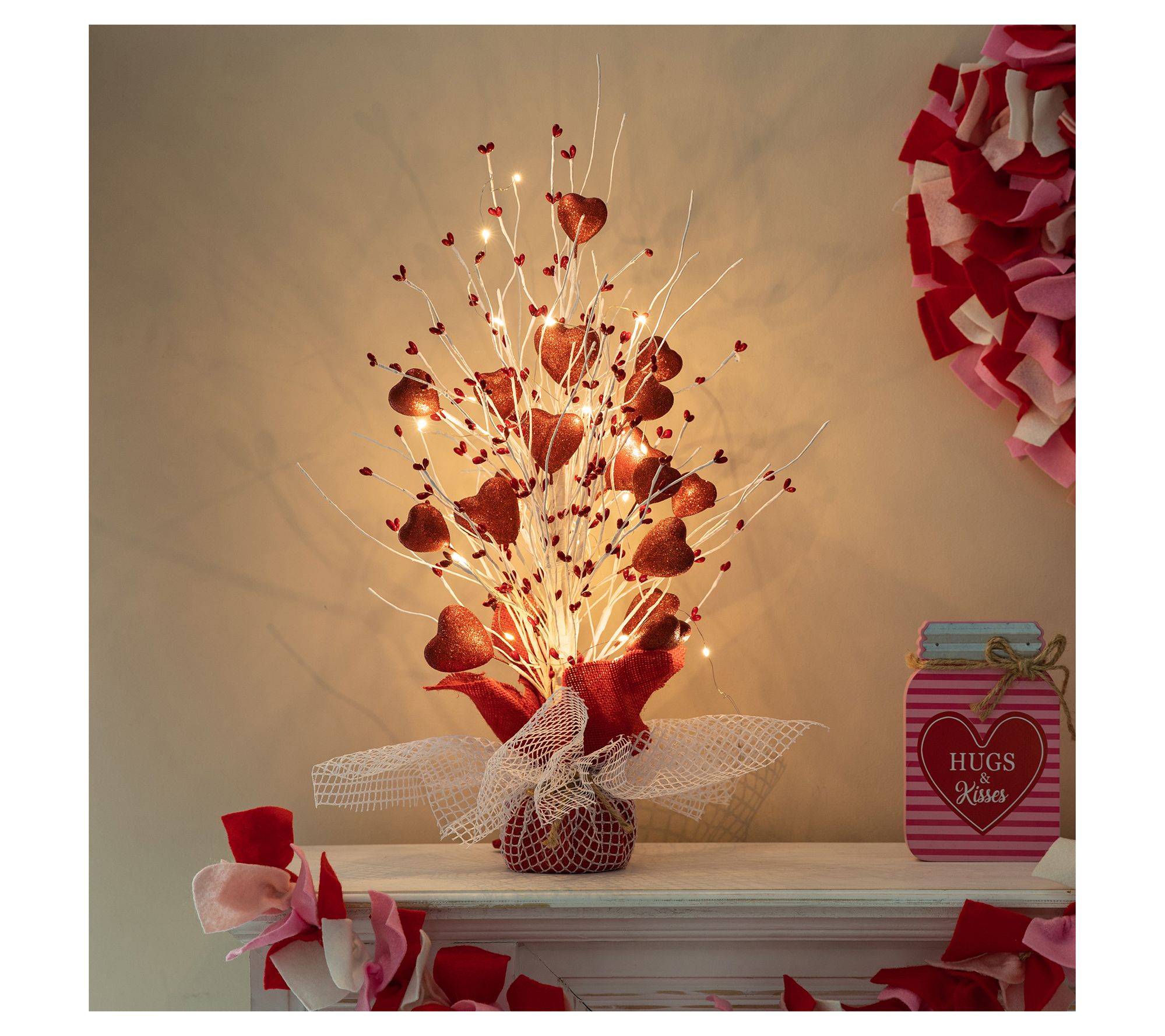 Create a romantic ambiance with this illuminated Valentine's heart table tree. Adorned with artificial hearts of various sizes, the warm white LED lights offer an intimate glow, perfect for a celebration of love. Its sturdy cement base ensures it stands proudly on desks or shelves, making it an ideal gift for loved ones. From Glitzhome.