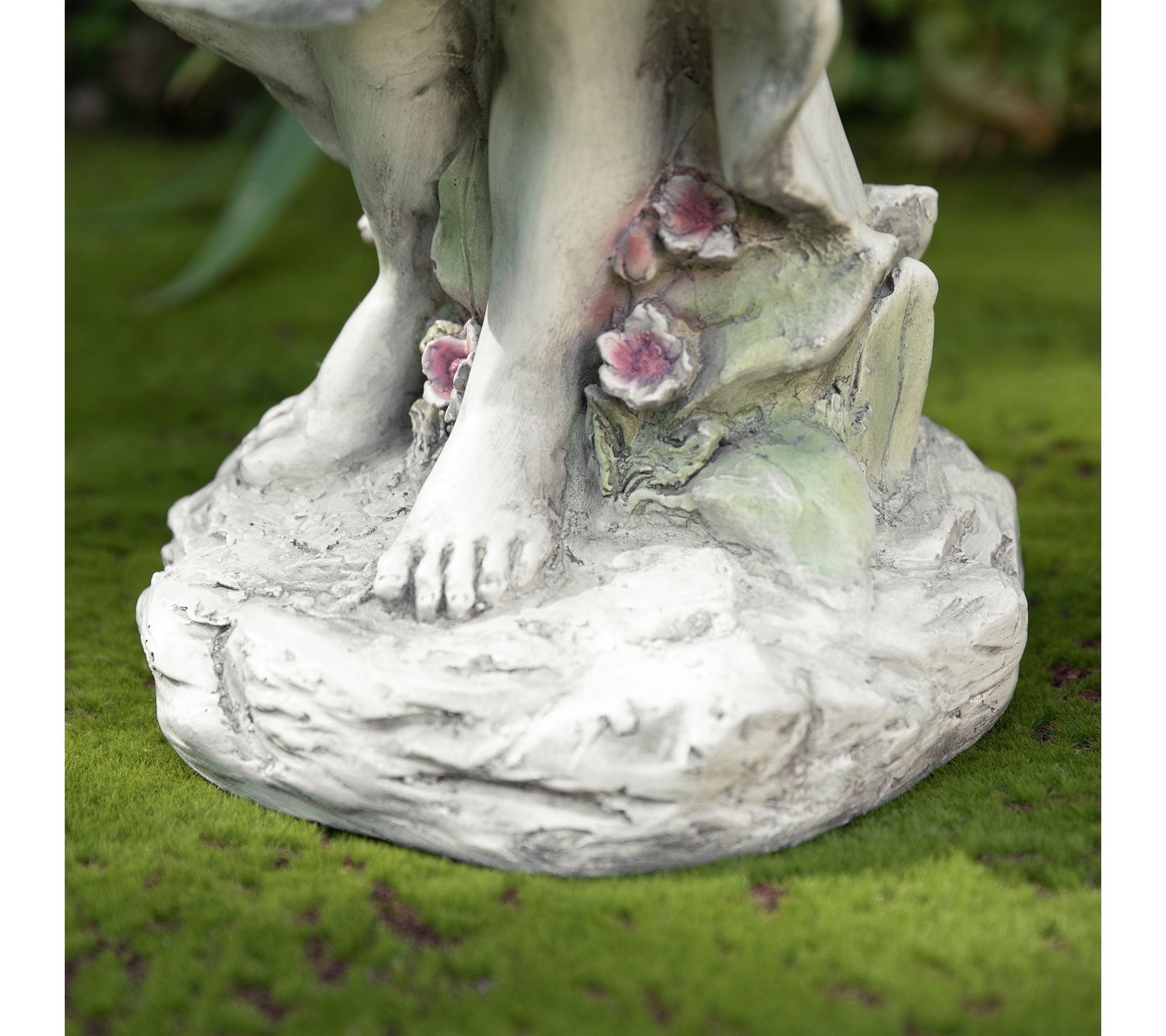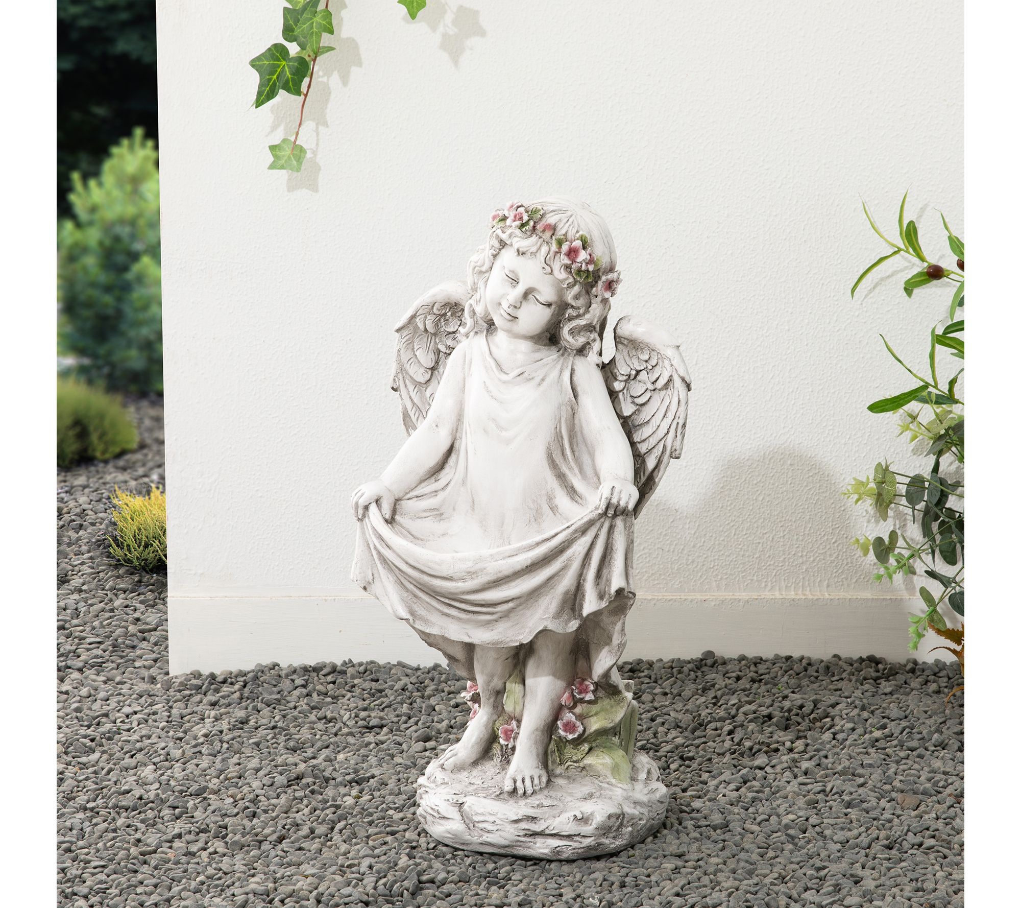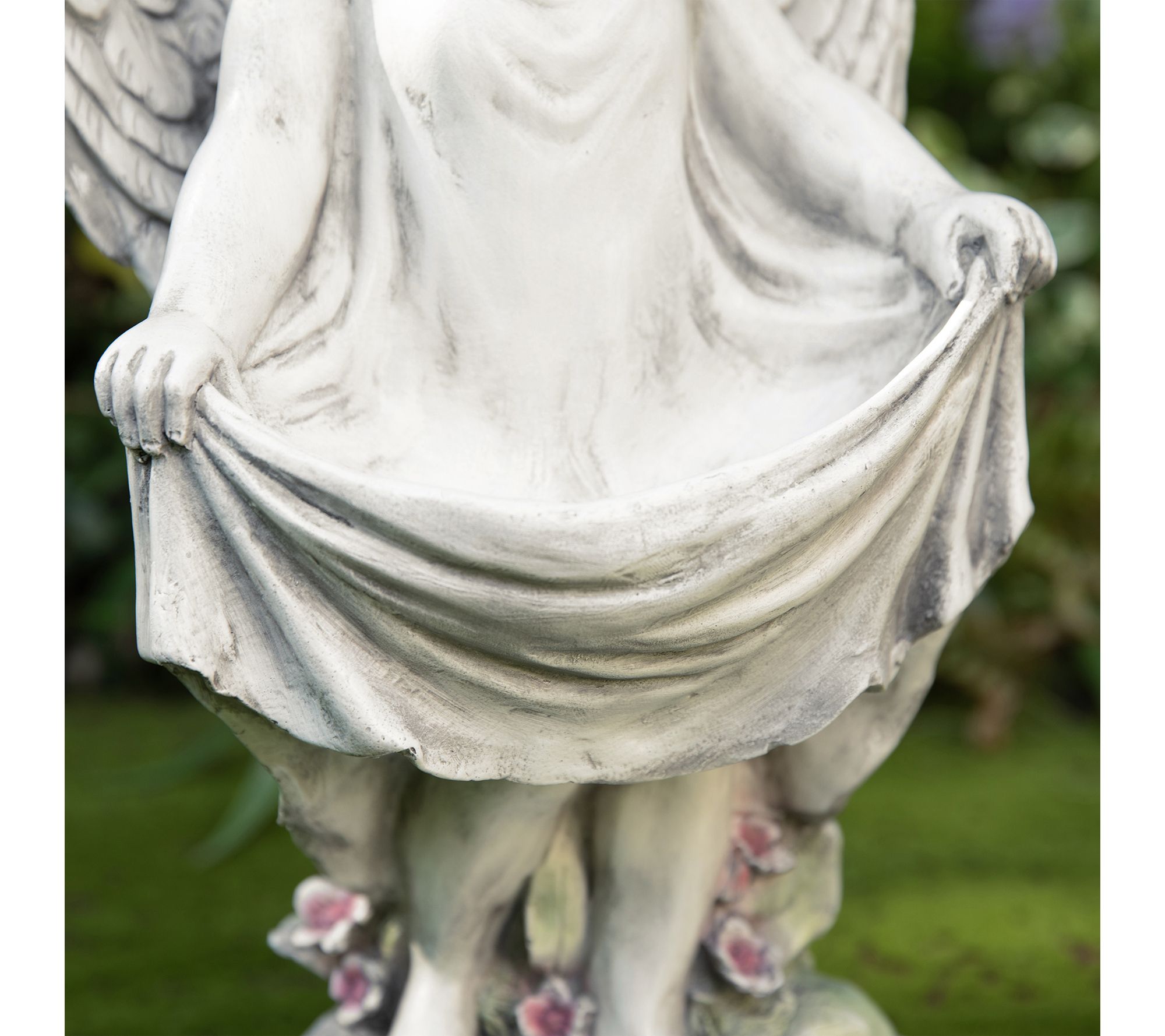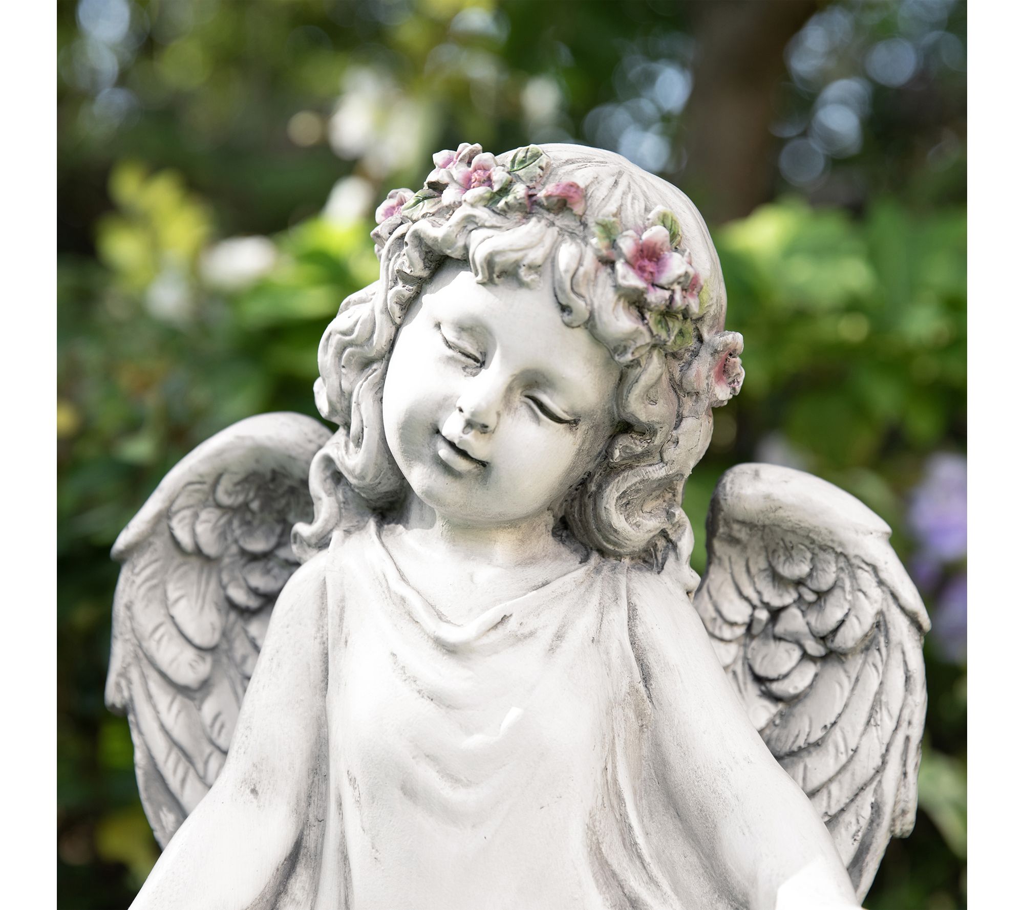 • Angel with floral crown and intricately detailed wings doubles as a birdfeeder