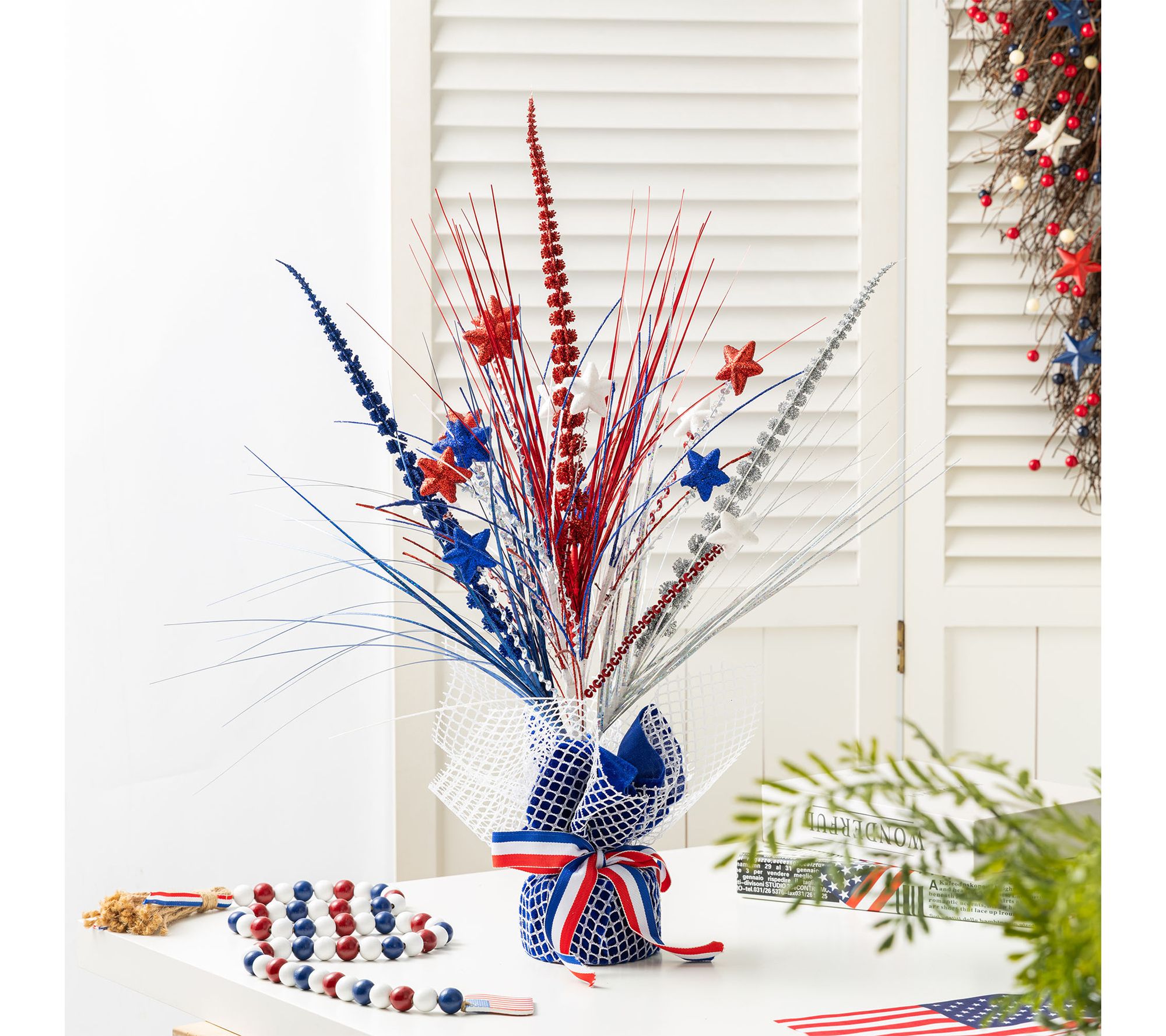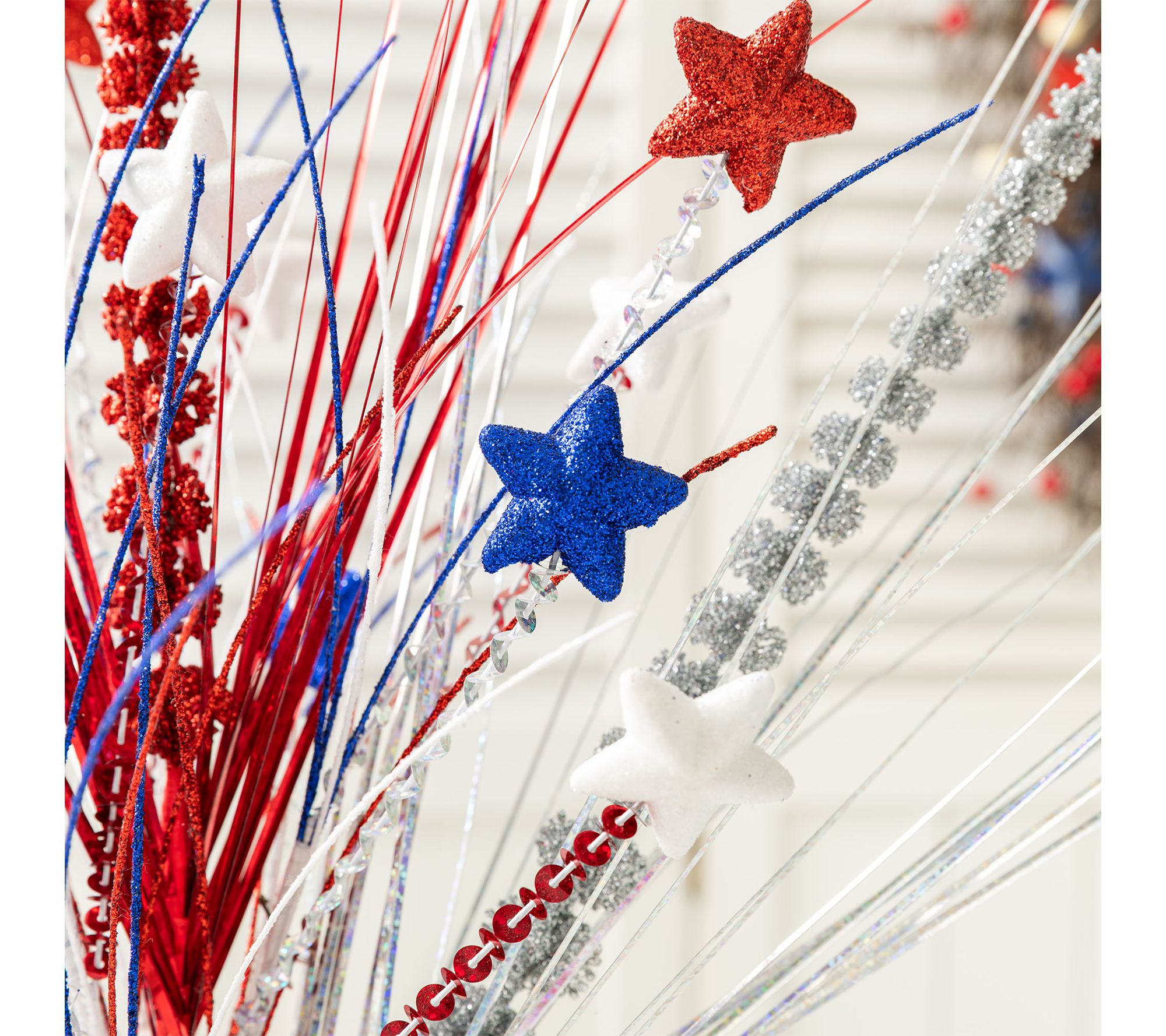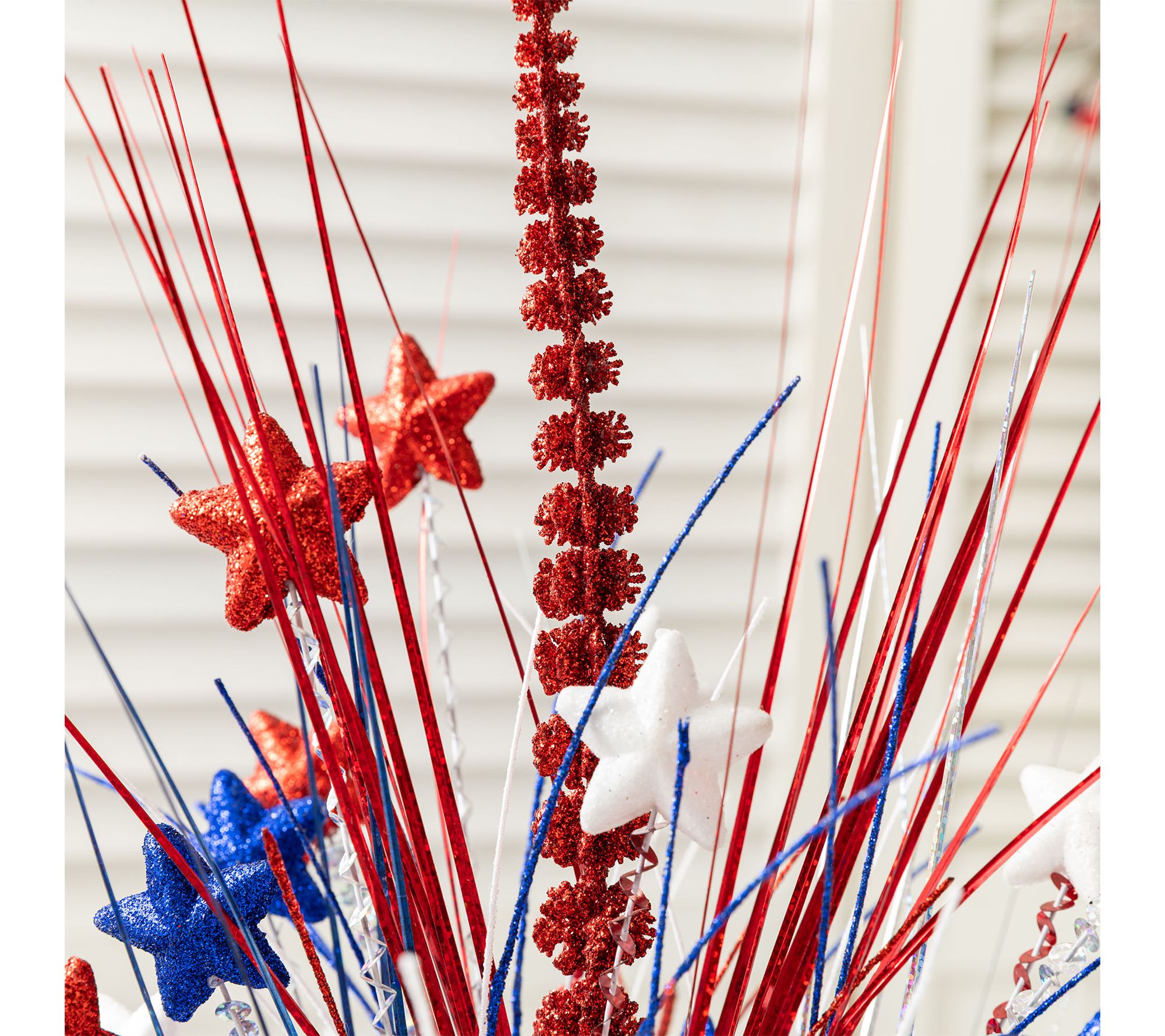 Bring a cheerful celebration of Americana to your home with this 21"H tabletop tree. Vibrant red, white, and blue stars mingle with wheat-like accents, creating a festive focal point for your Independence Day table or a year-round display of national pride on your shelf or mantel. From Glitzhome.