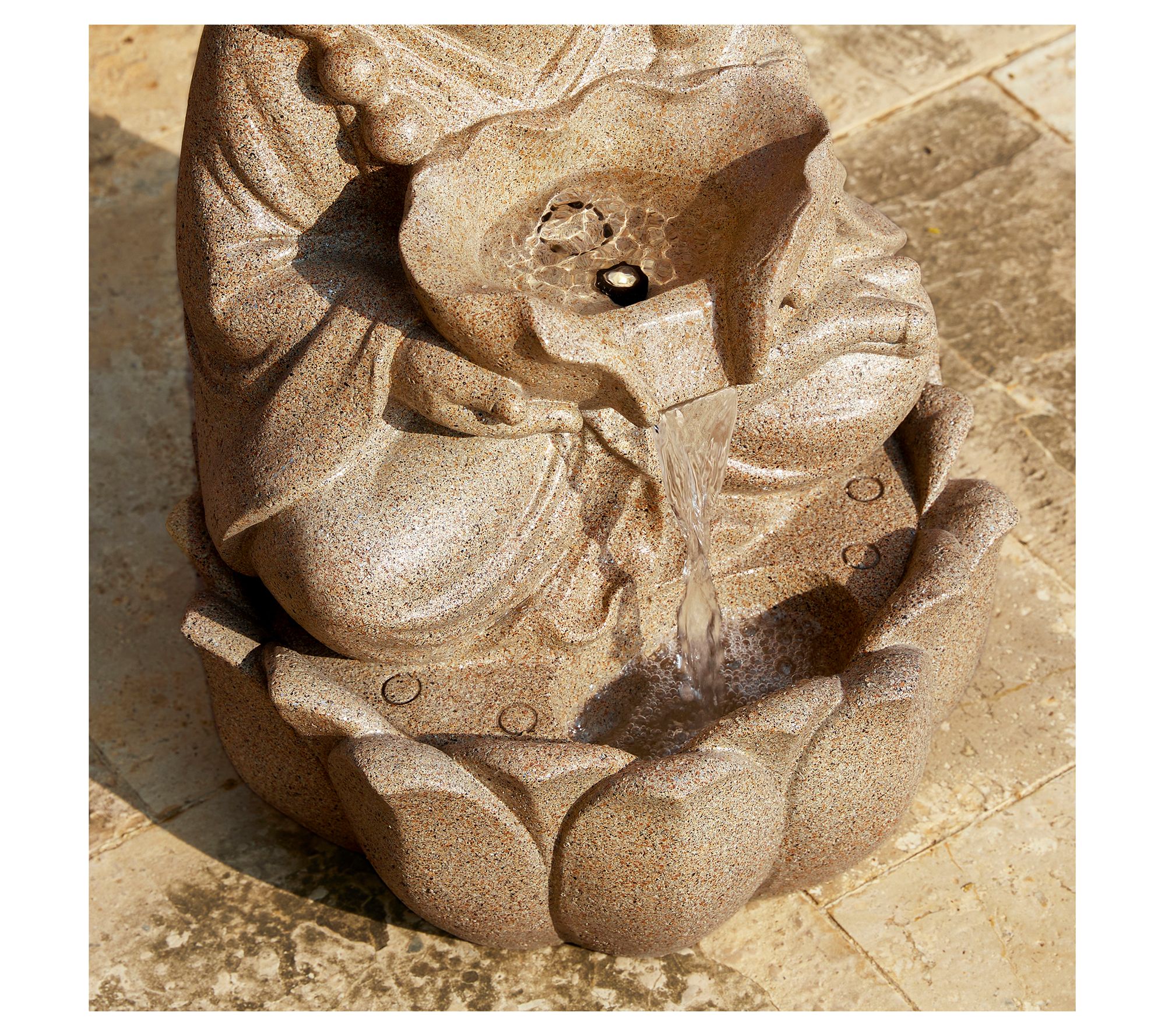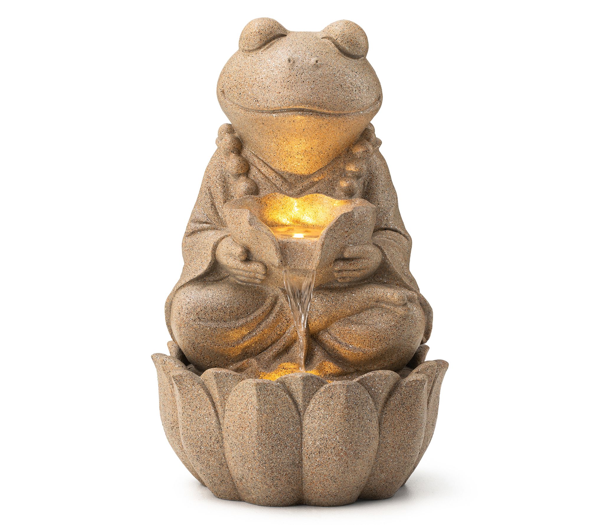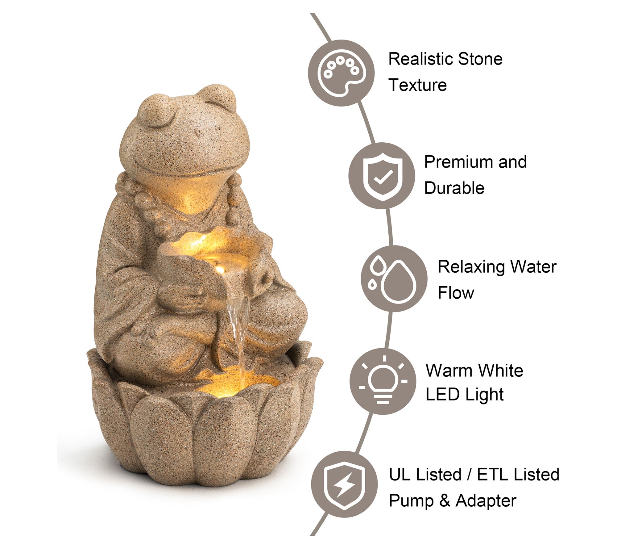 Enhance your garden or patio with this Zen-style fountain featuring a meditative animal design. The soothing sound of cascading water paired with warm white LED lights creates a tranquil ambiance. The lifelike embossed detail adds artistic charm, making it a beautiful focal point in any outdoor space. From Glitzhome.