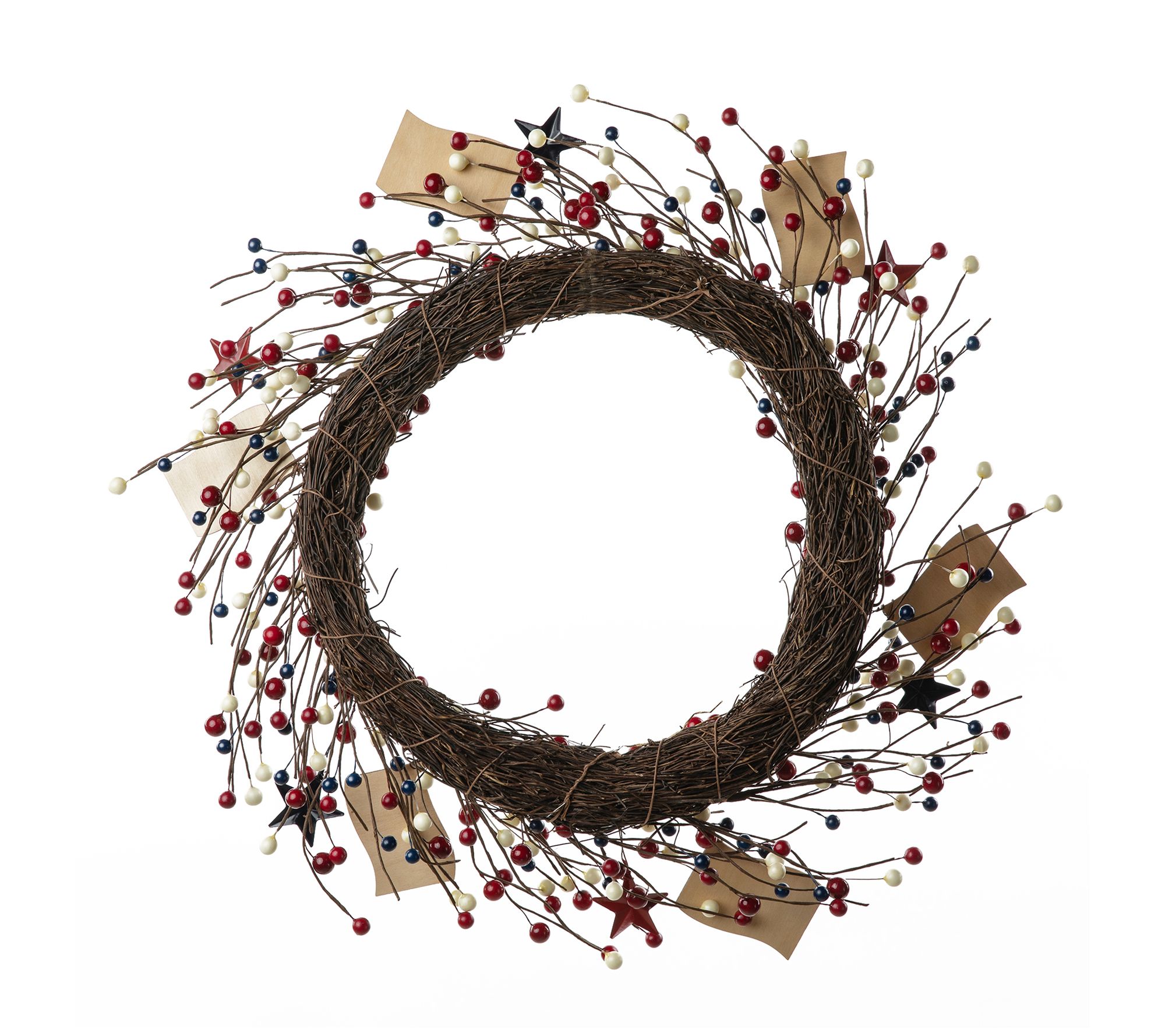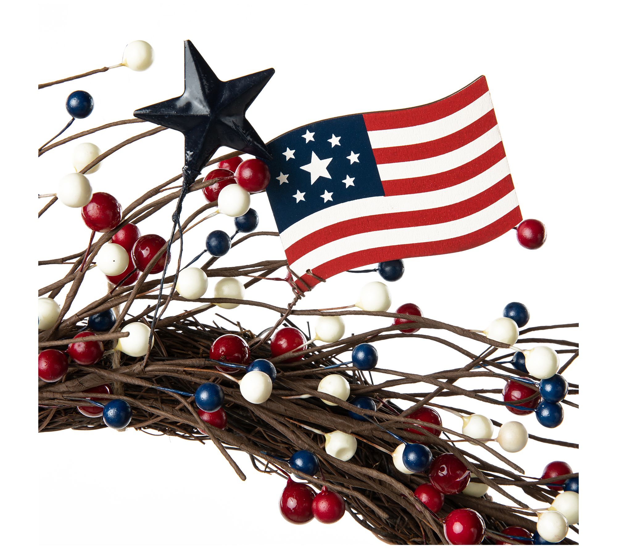 Celebrate your patriotic spirit with a natural take on Americana decor, this fun wreath incorporates faux berries, stars, and six wooden flags. From Glitzhome.