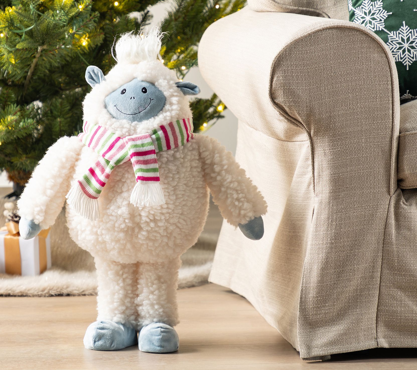 Bring a smile to your festive celebrations with this whimsical Christmas fabric standing yeti, dressed in a cozy red and green striped scarf and ready to warm up any holiday scene. Whether greeting guests at your entryway or adding a playful touch to the living room, this plush figure serves as a heartwarming accent for the season. From Glitzhome.