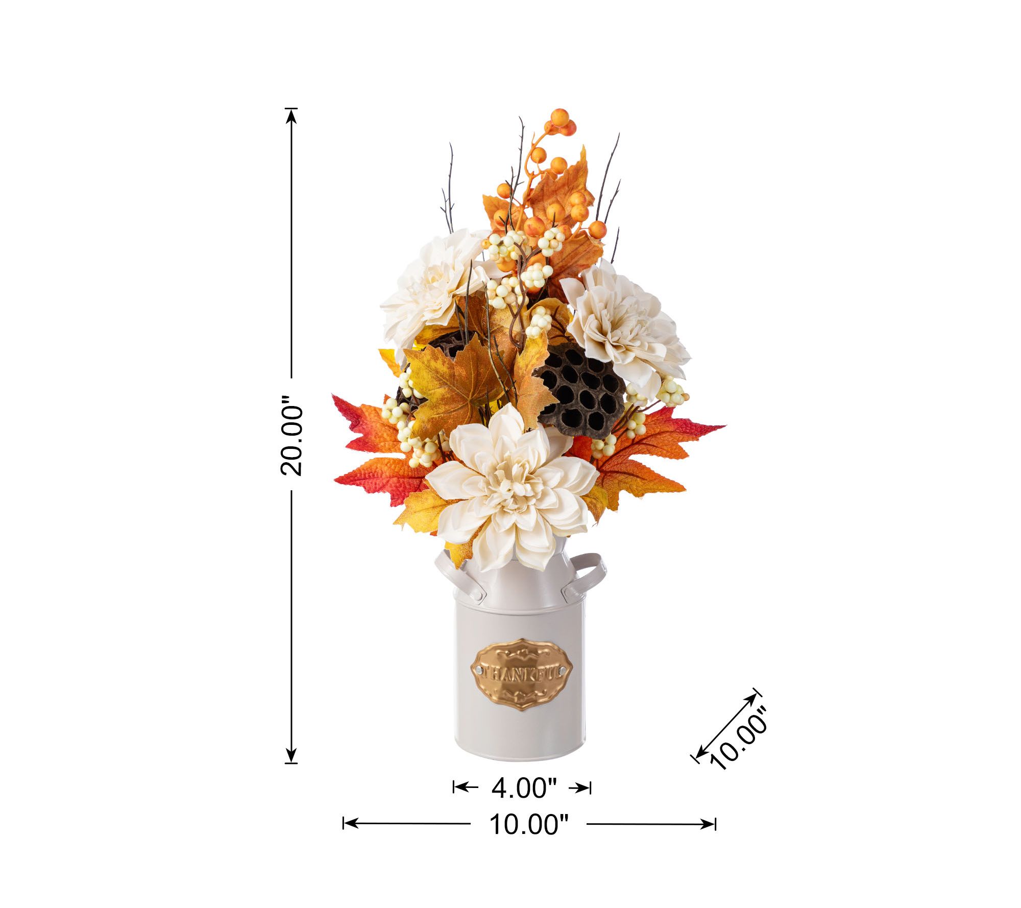 • Includes faux lotus pod berry centerpiece in metal pitcher vase