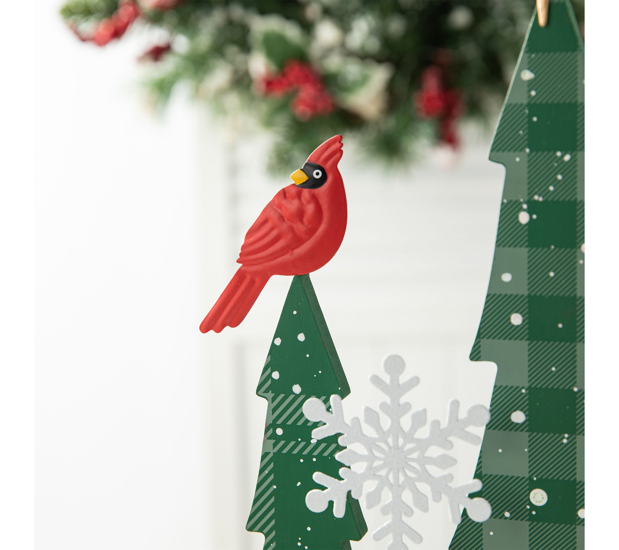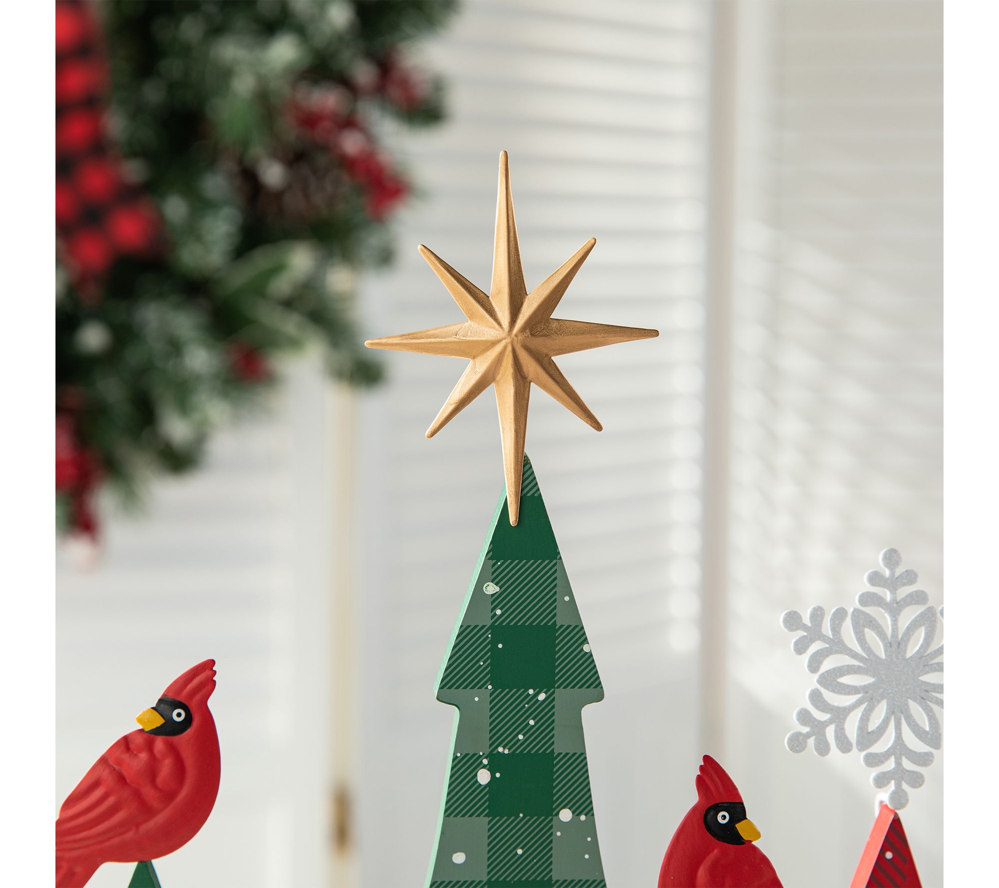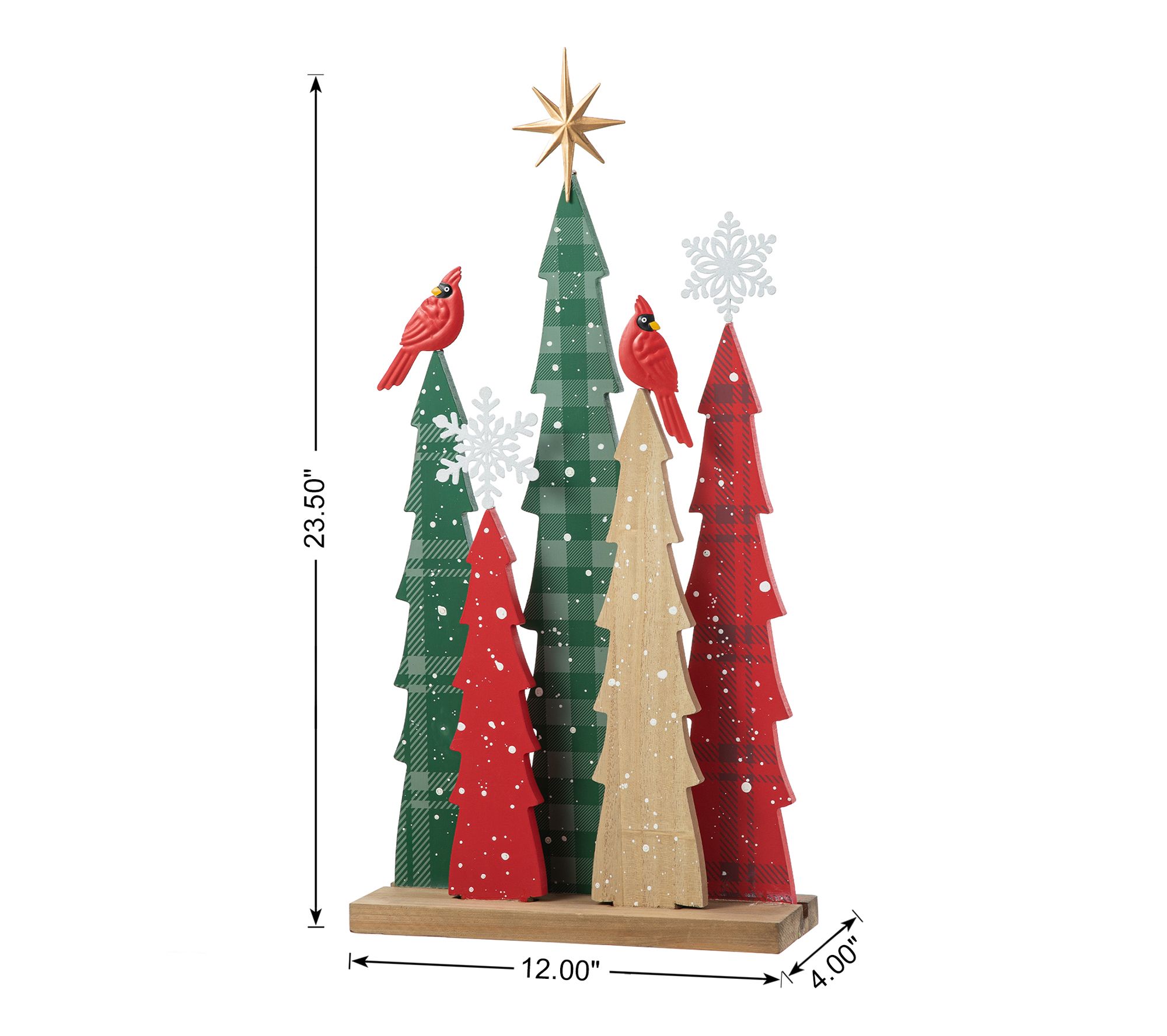 Add a touch of festive charm to your home with the Glitzhome wooden Christmas tree table decor. Featuring five whimsical trees adorned with cardinals, snowflakes, and a pole star on top, this piece brings the joyful spirit of the holidays to any space. From Glitzhome.