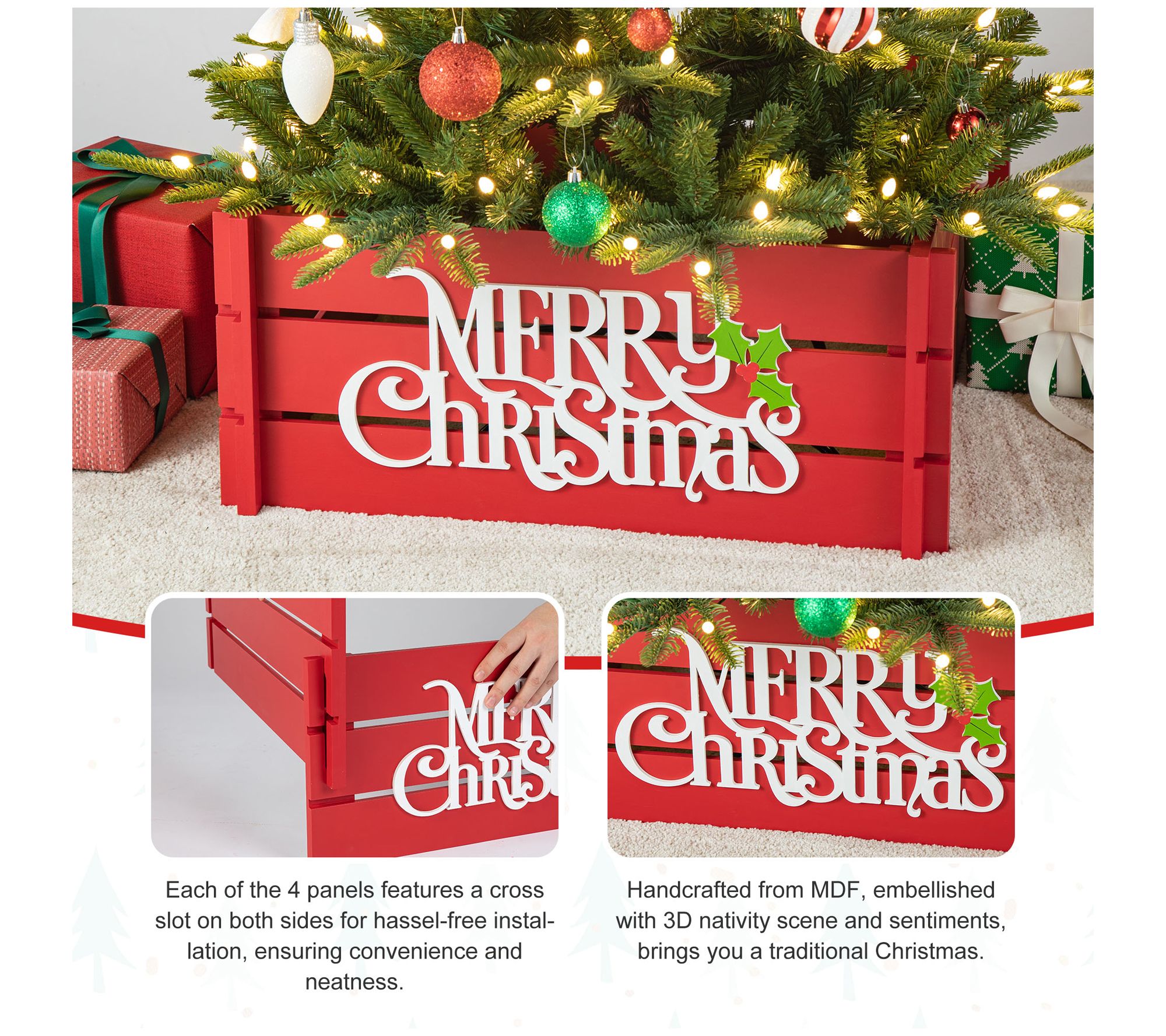 Transform your seasonal setup with this charming wooden crate tree collar, offering a modern farmhouse touch that wraps your tree base in style. Crafted from durable MDF with a unique design, this collar gives you a neat display and hassle-free installation thanks to its cross slot panels. From Glitzhome.