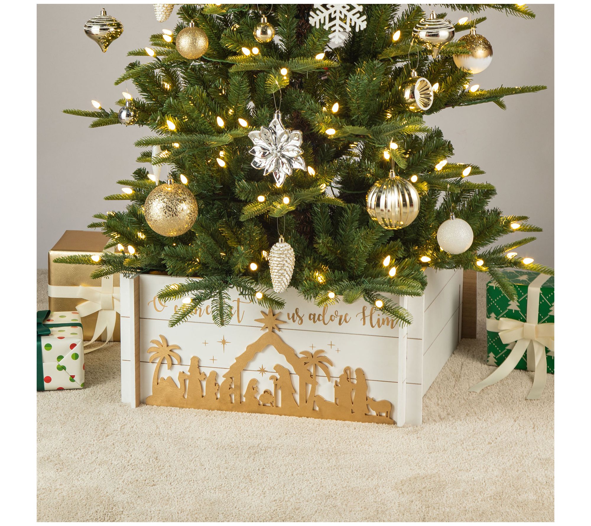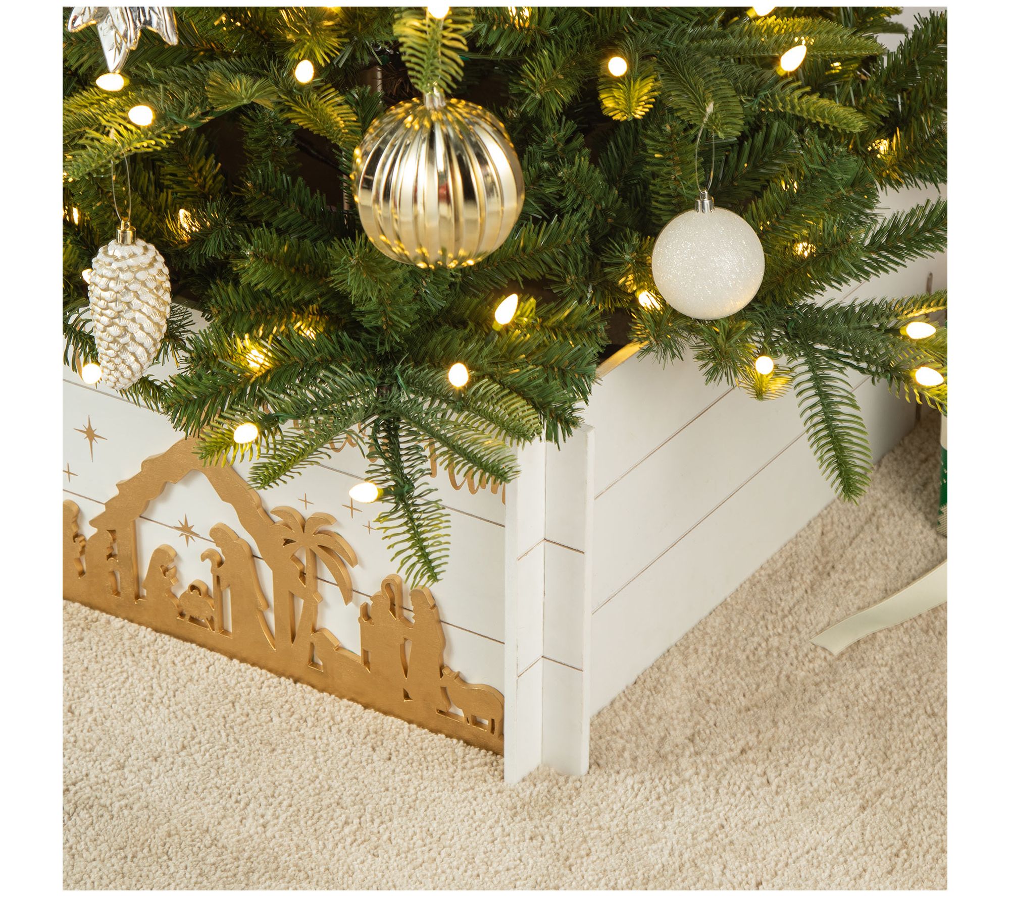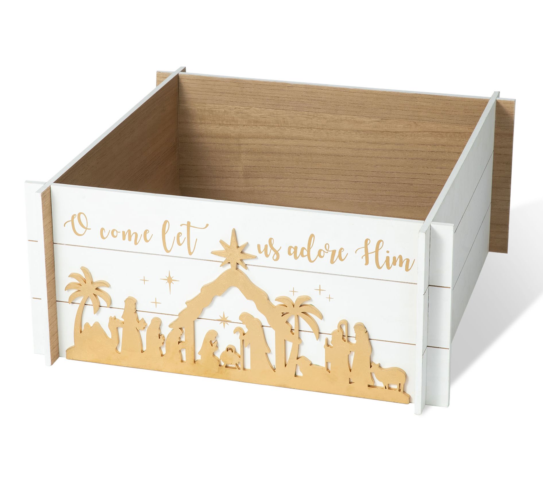 Transform your seasonal setup with this wooden tree collar, a masterpiece that marries modern farmhouse charm with the timeless story of Christmas. Its unique crate design and 3D Nativity scene adds a touch of elegance and spirituality to any space, making it the perfect backdrop for your holiday celebrations. From Glitzhome.