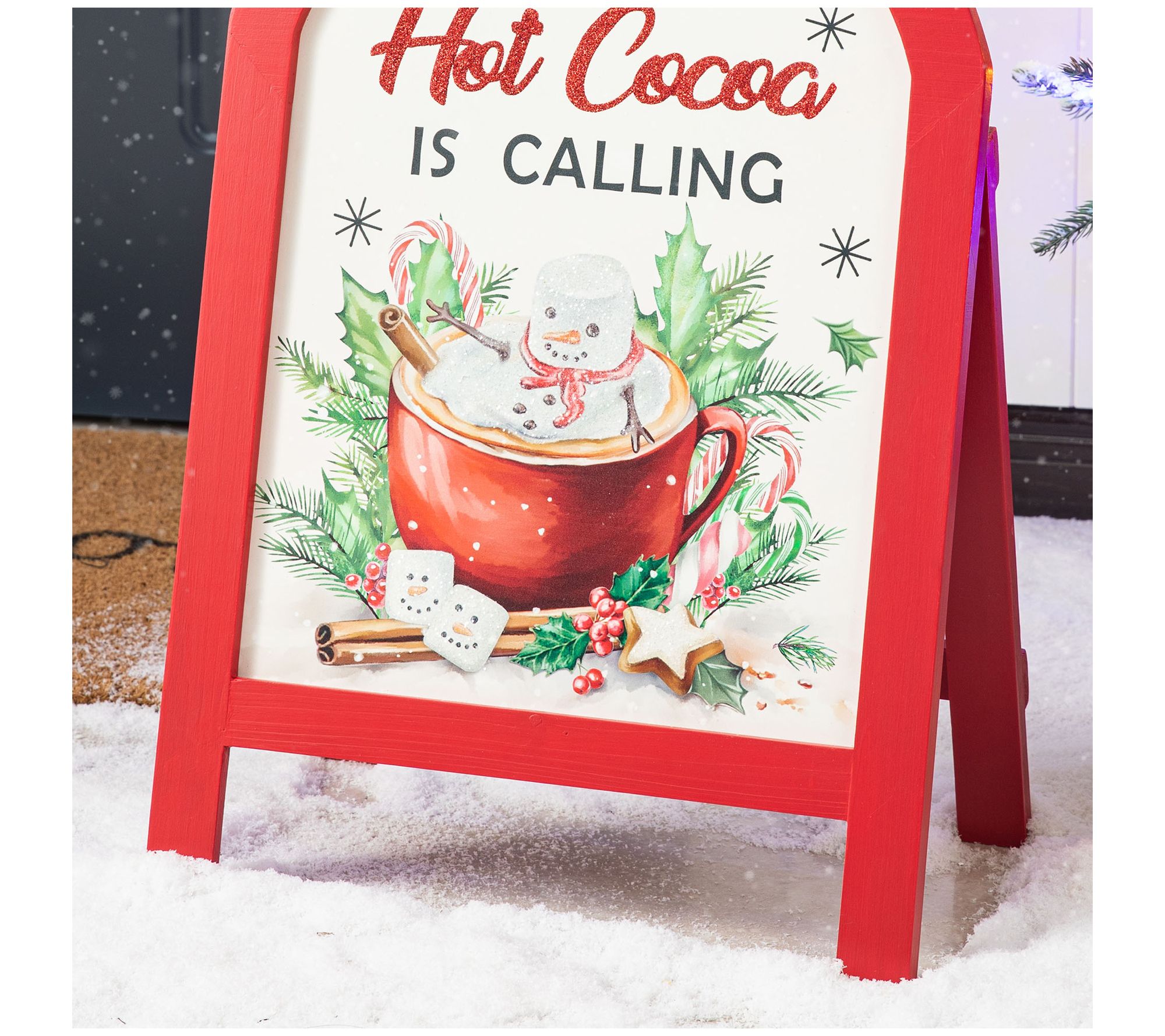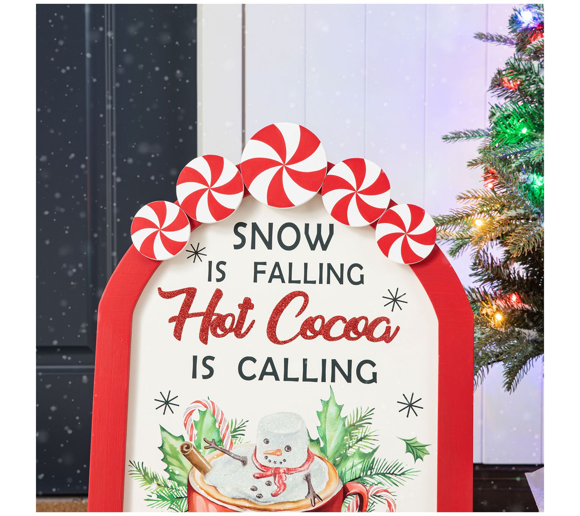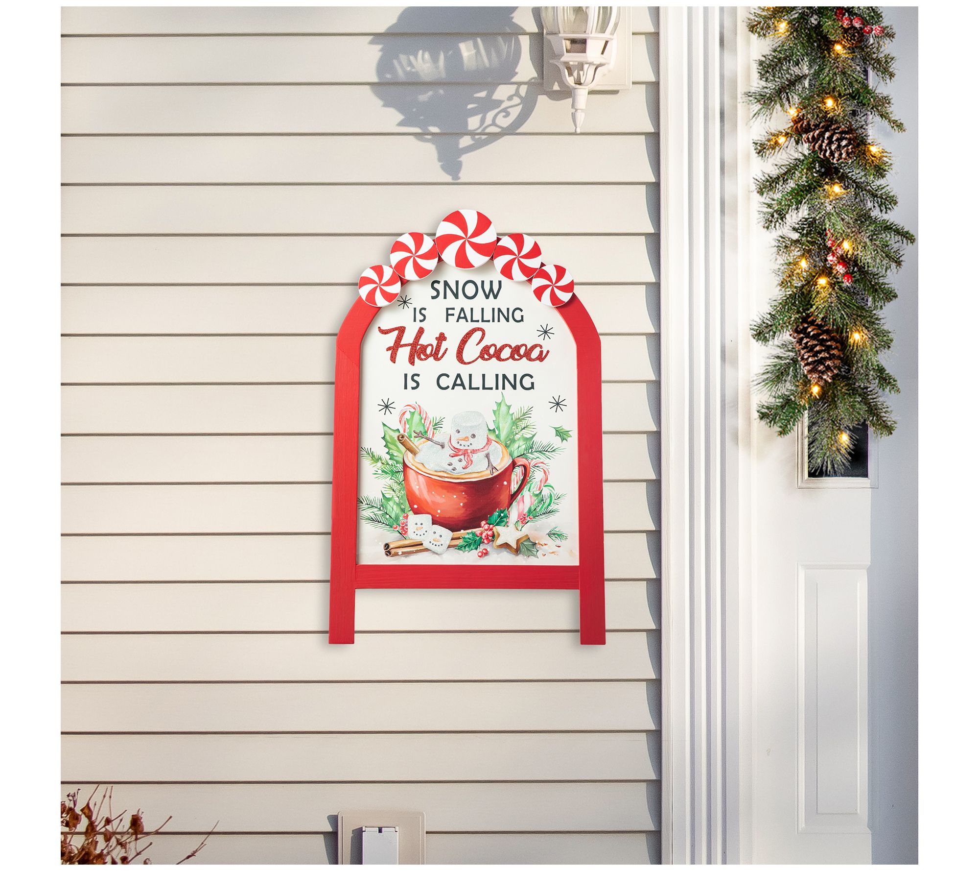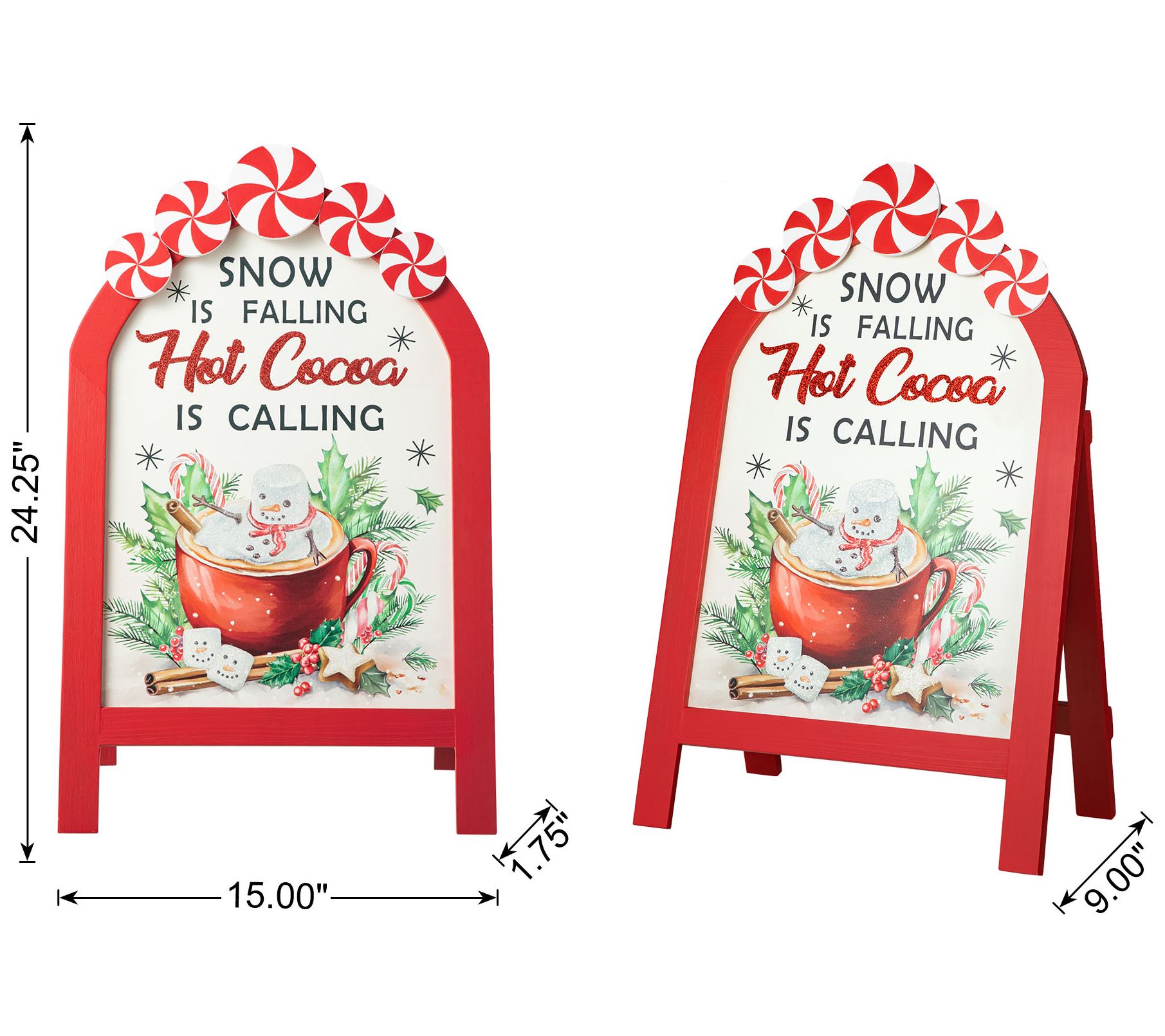 This delightful porch decor features an easel design adorned with peppermint and warm hot cocoa, creating a cozy holiday ambiance that's perfect for celebrating the season with loved ones. From Glitzhome.