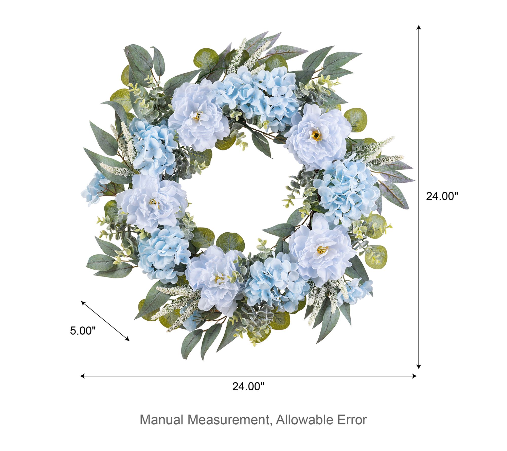 Bring a soothing touch to your space with this floral wreath, showcasing lifelike blue peonies and hydrangeas nestled among lush foliage. The serene blue tones instantly freshen up your front door or wall, while the included metal hanger lets you display it with ease -- no fuss, just effortless elegance all season long. From Glitzhome.