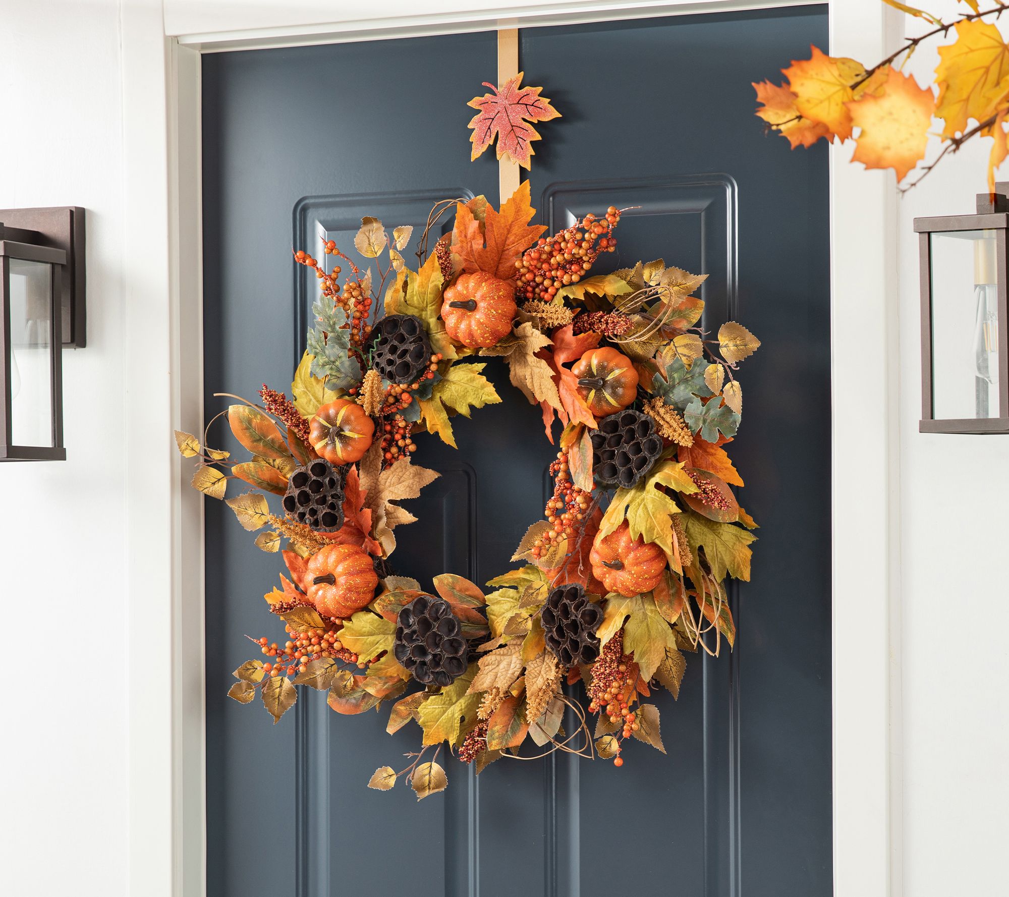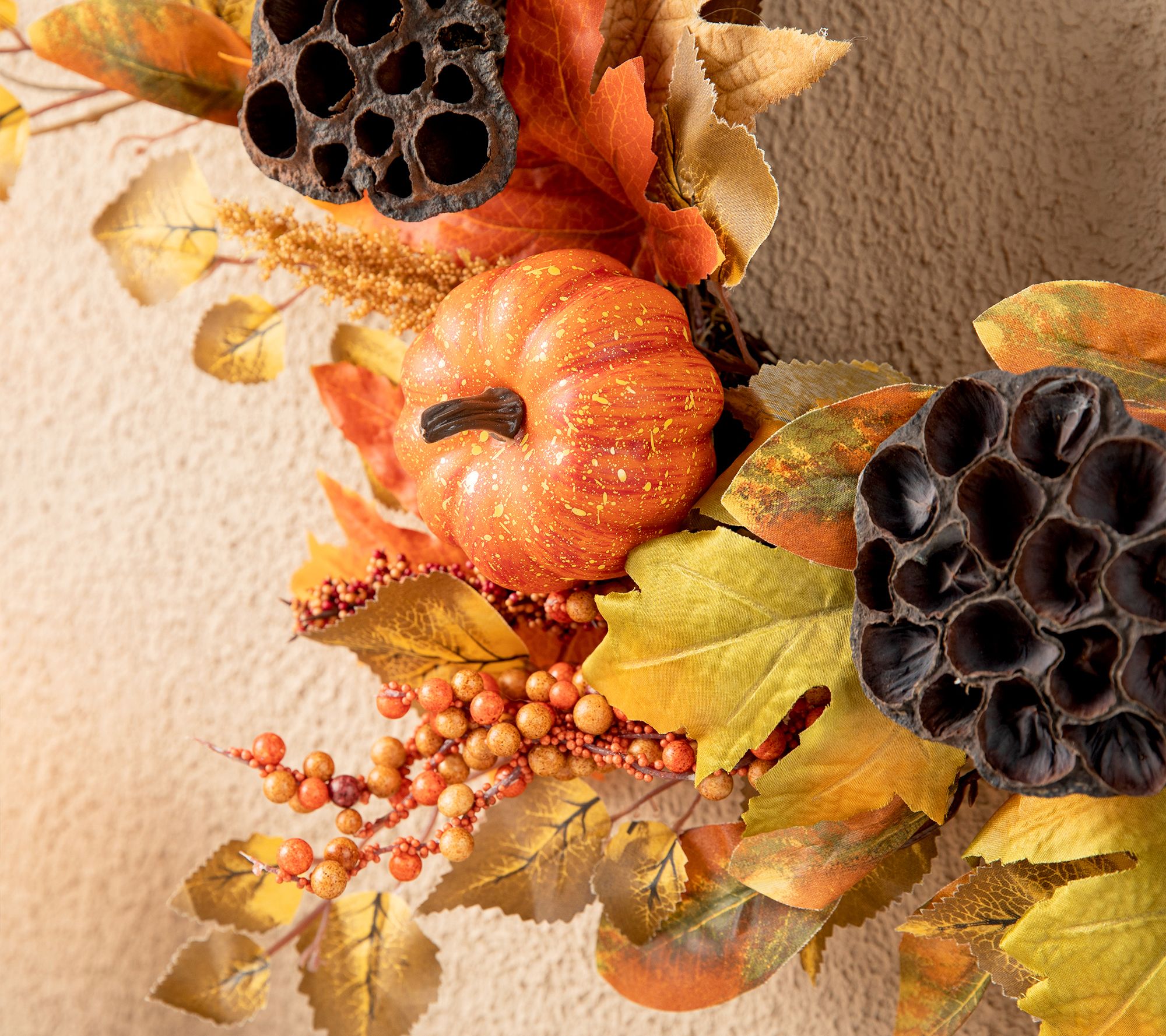 Deck your halls for the fall! Welcome your guests at your door or in your entryway with the warm autumnal charm of this harvest pumpkin floral wreath. From Glitzhome.