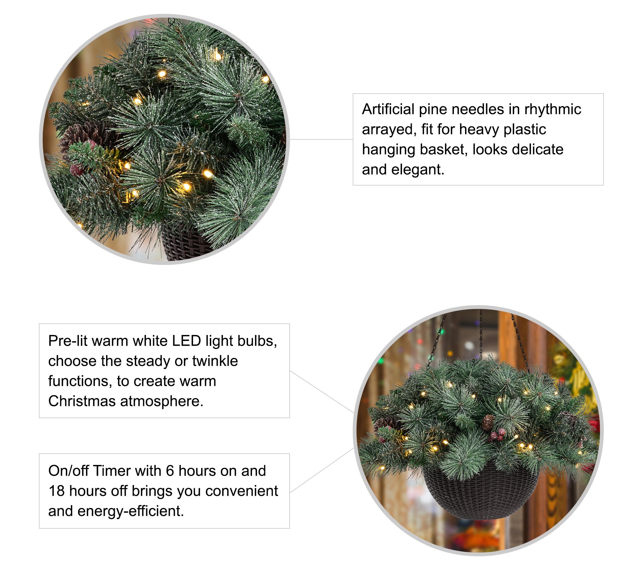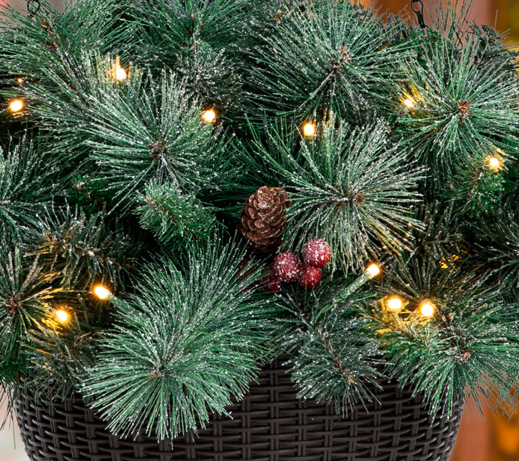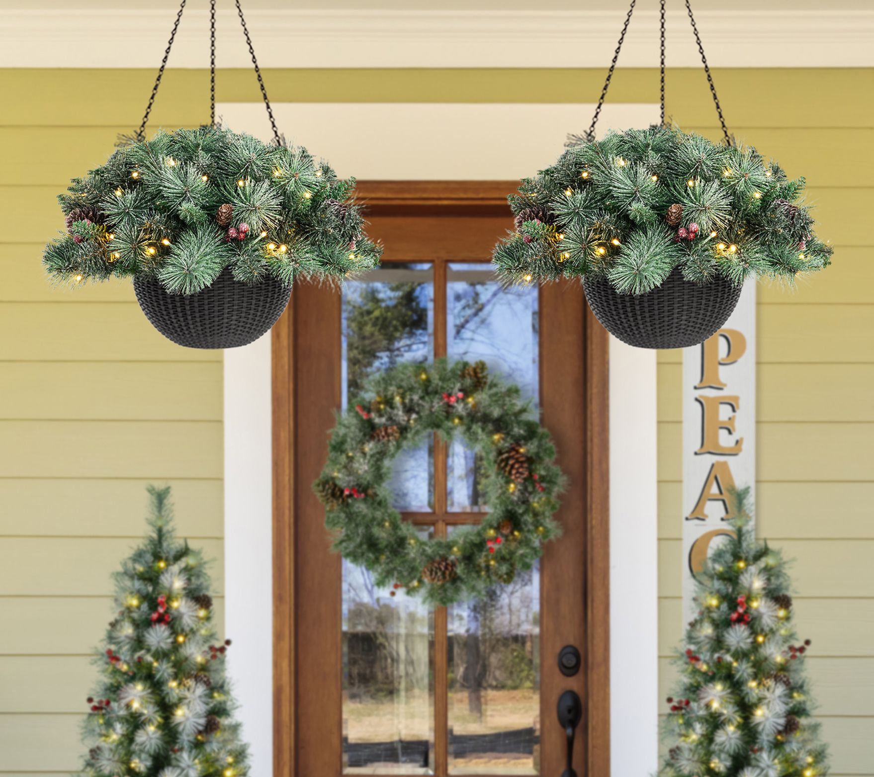 • Includes two frosted pine hanging baskets