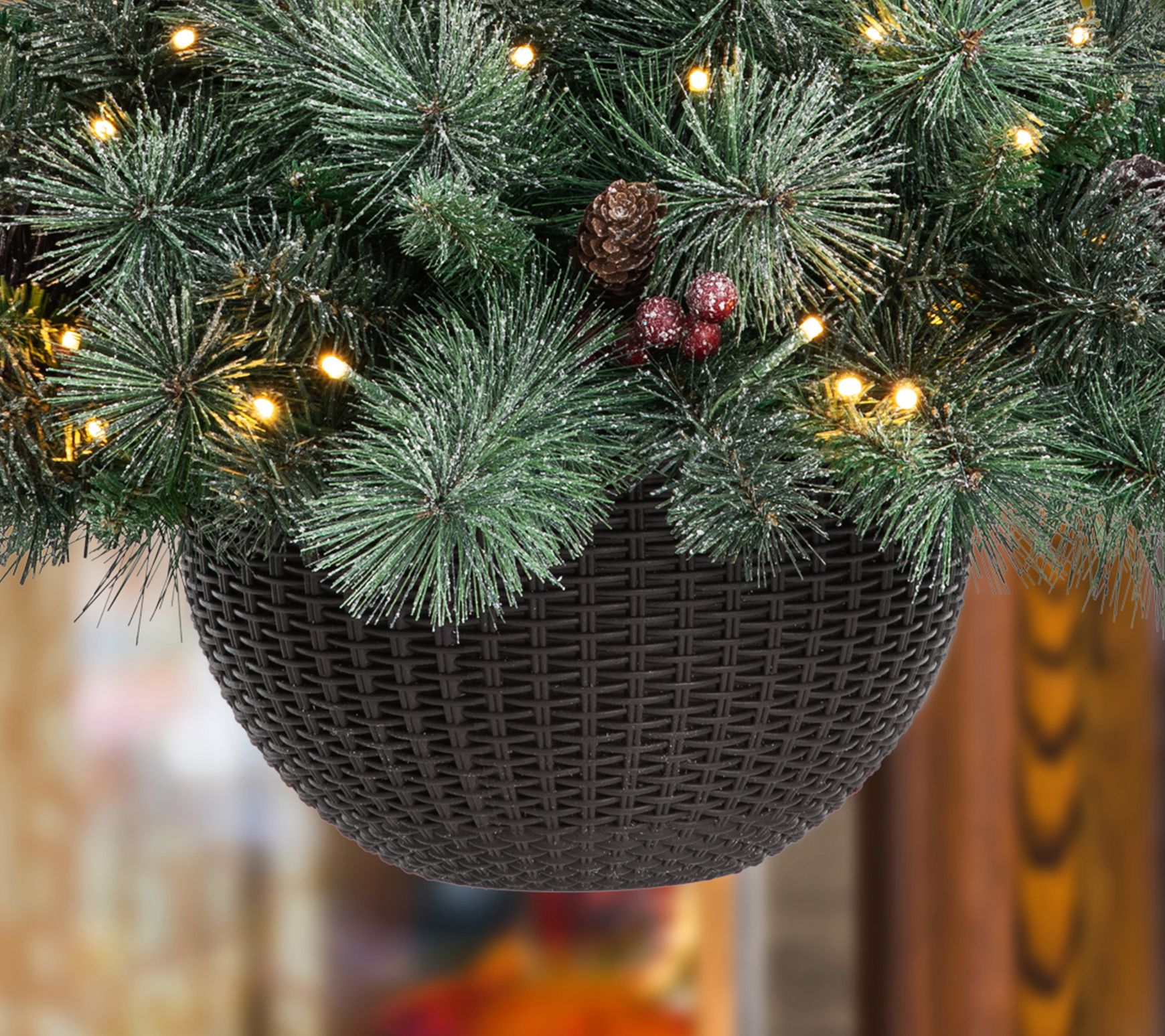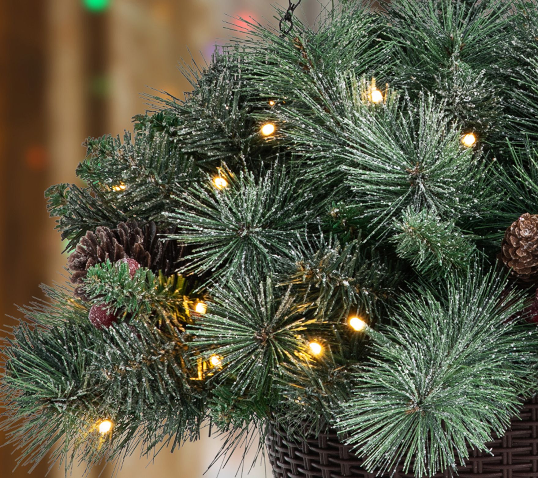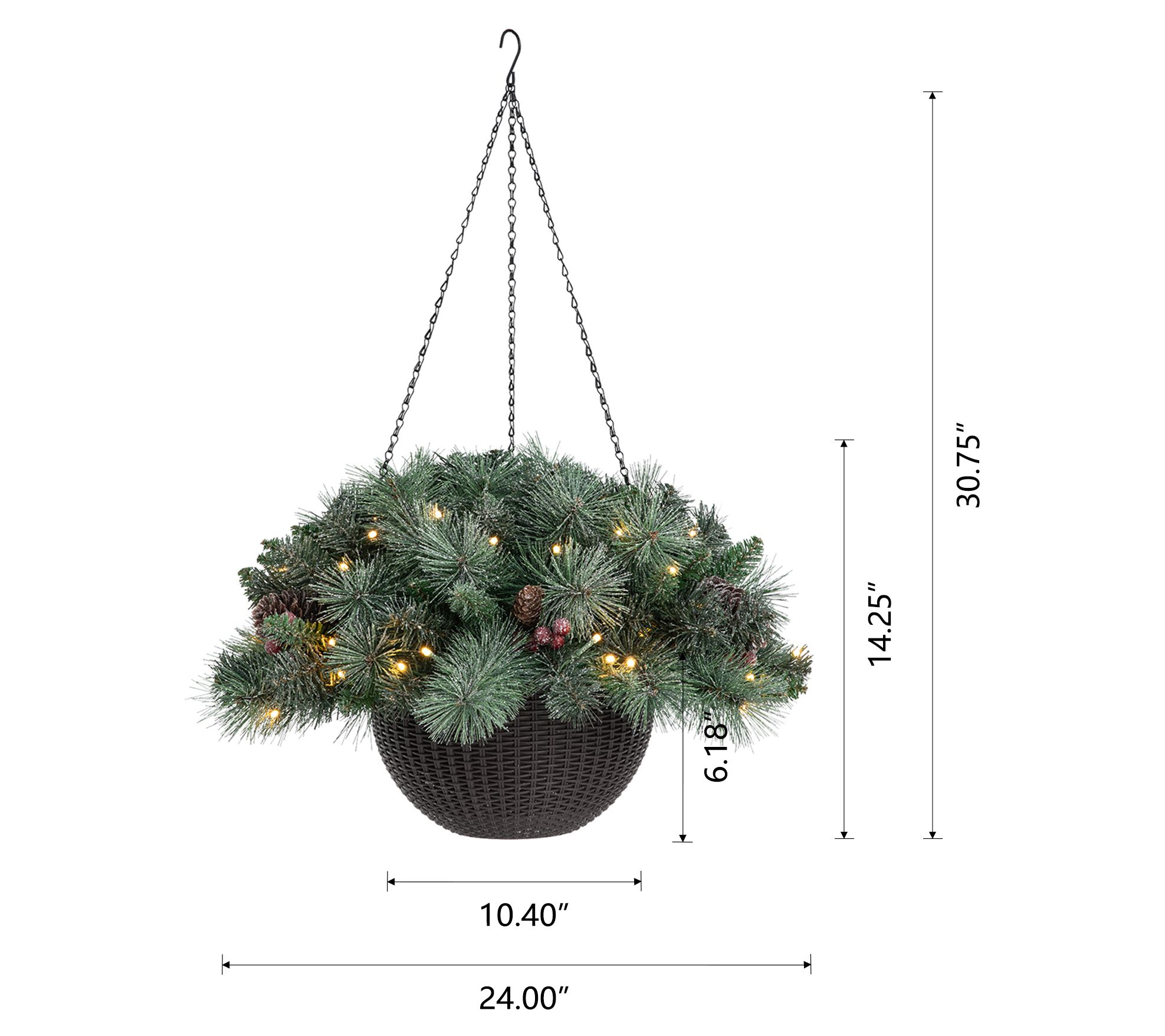 • Includes two frosted pine hanging baskets