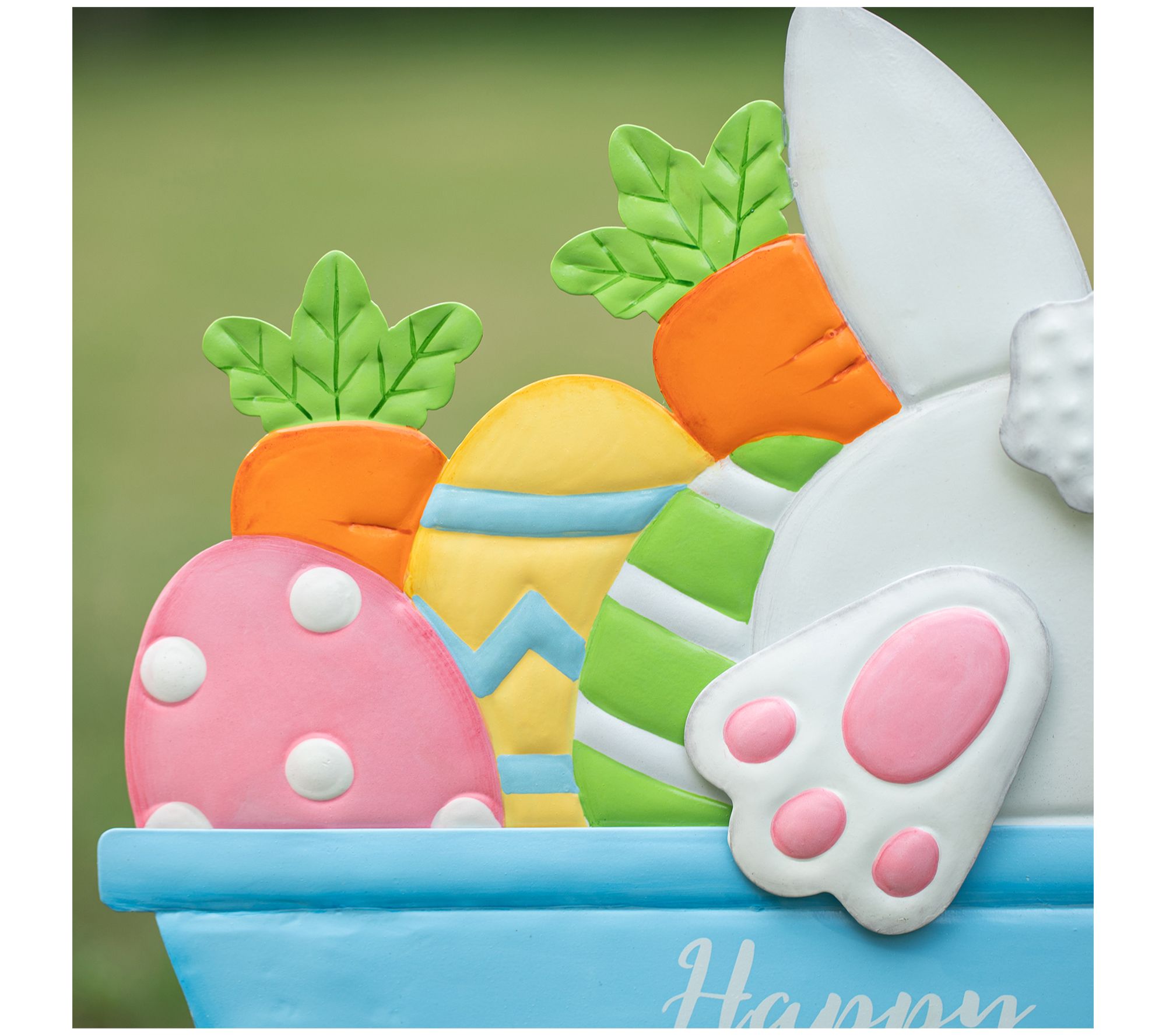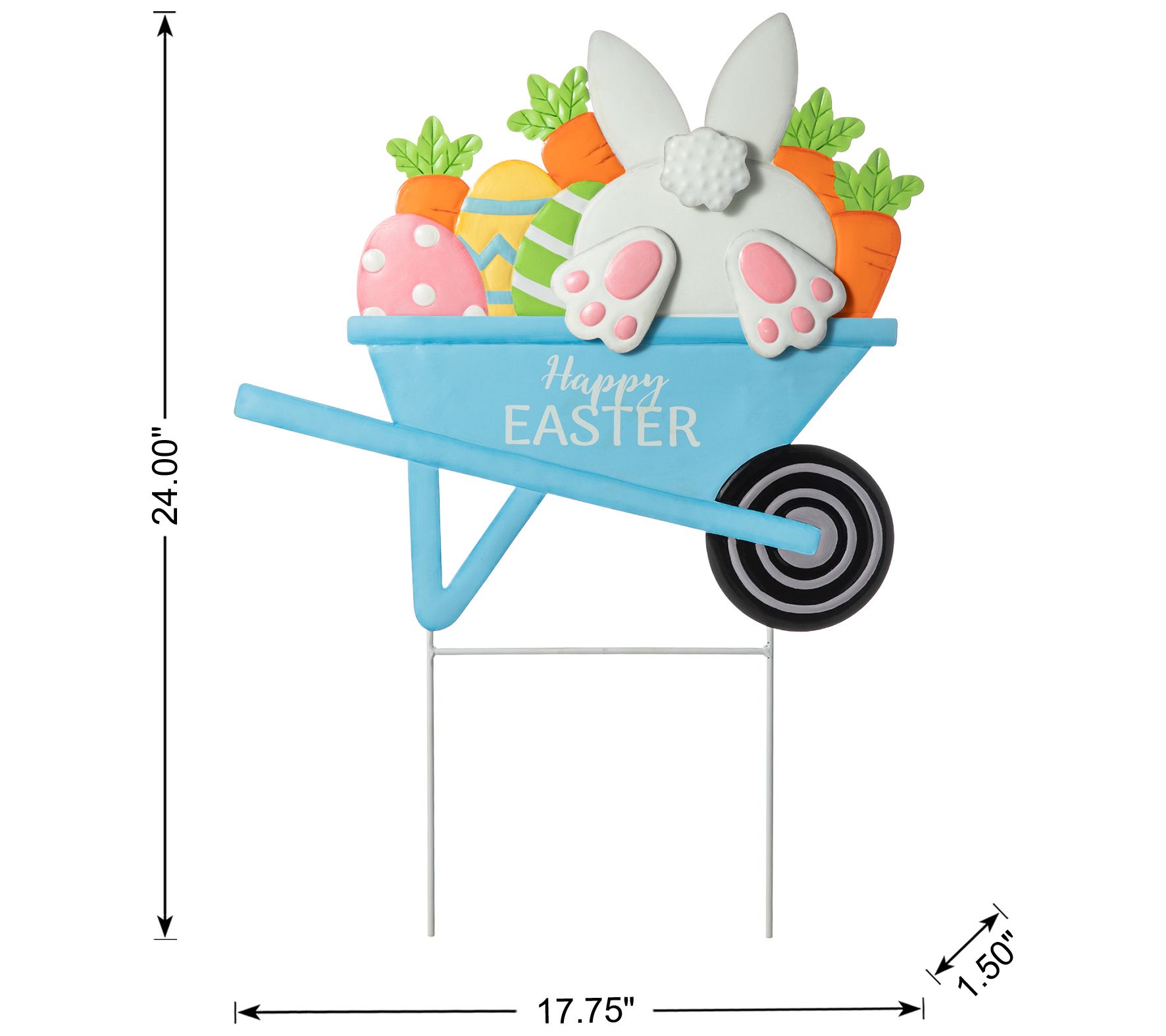 Add a festive touch to your garden or home with this adorable yard stake from Glitzhome. Featuring a classic blue wheelbarrow filled with colorful Easter eggs, carrots, and an adorable bunny, it immediately brings springtime cheer to your Easter celebrations. The vibrant colors and "Happy Easter" sign make it a delightful and compact addition to any display space. From Glitzhome.