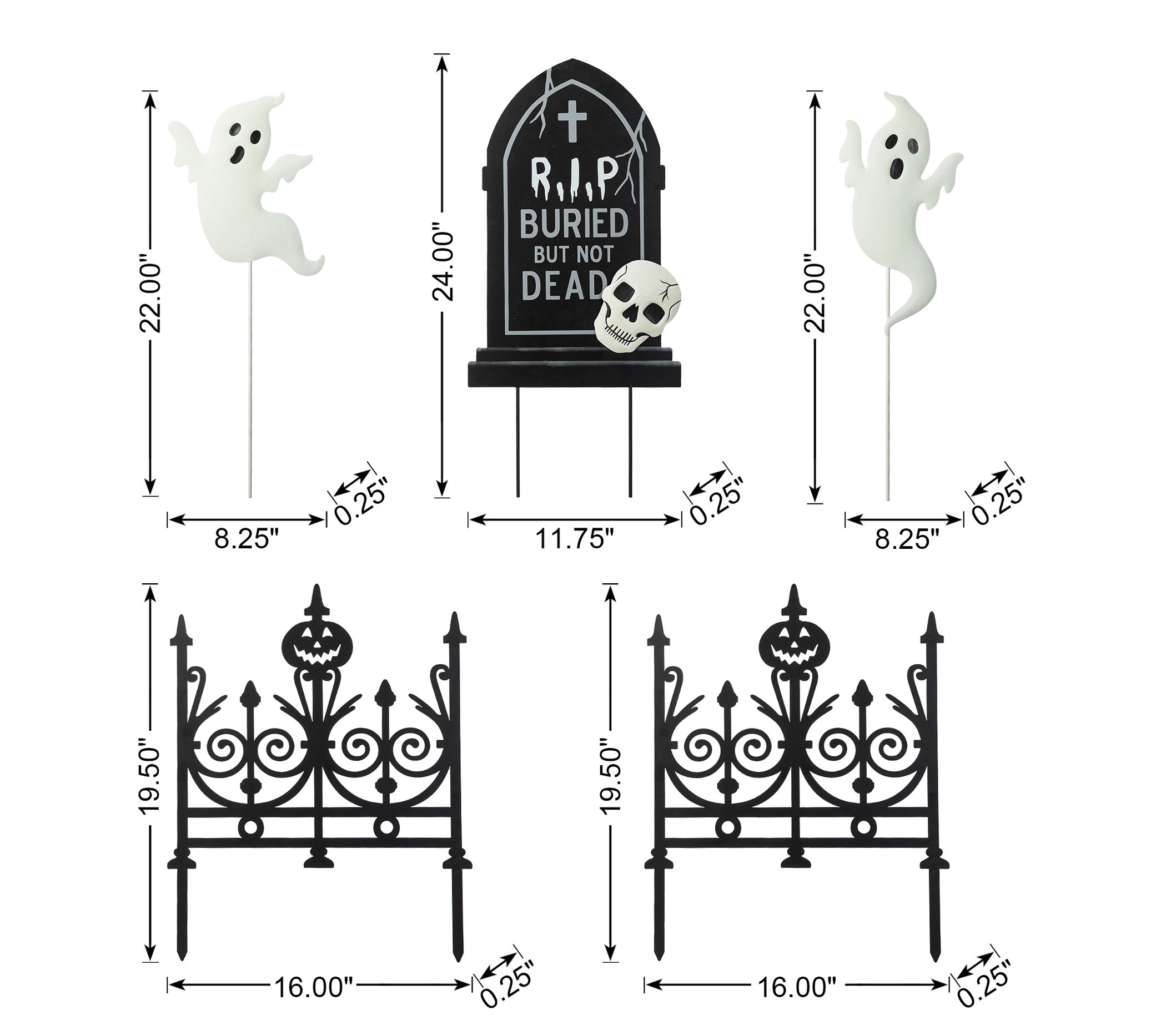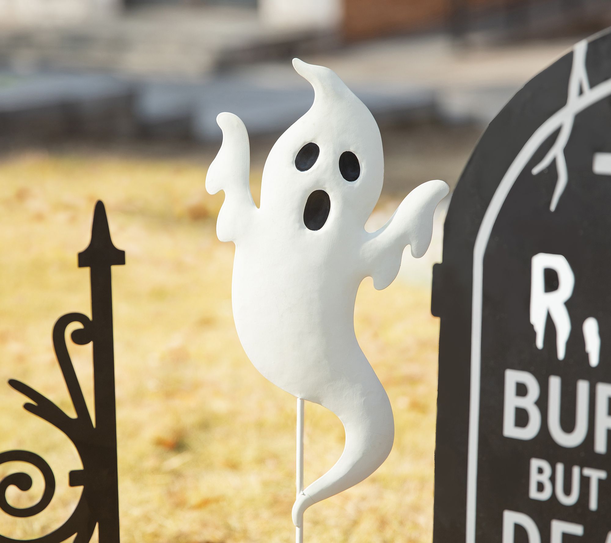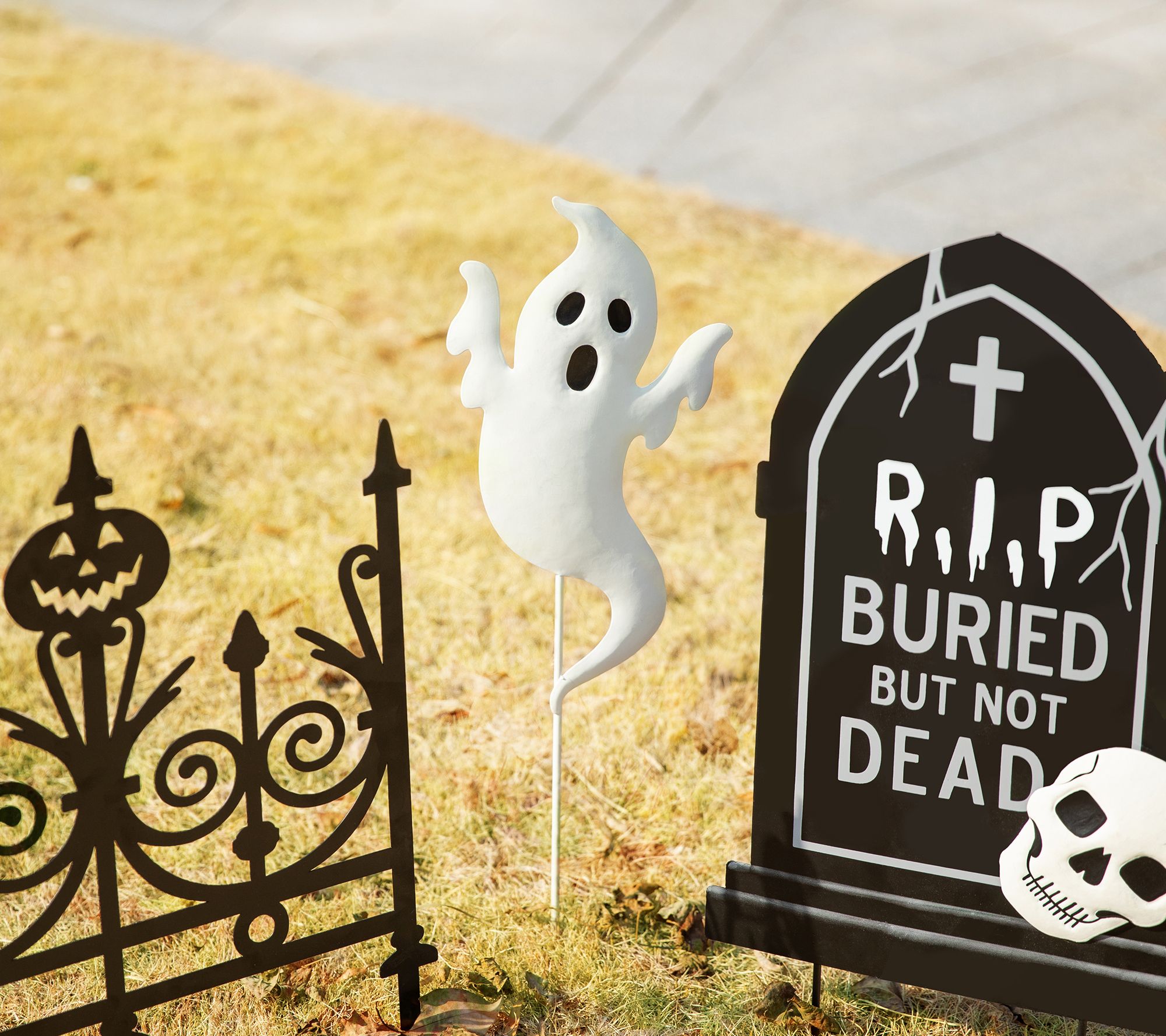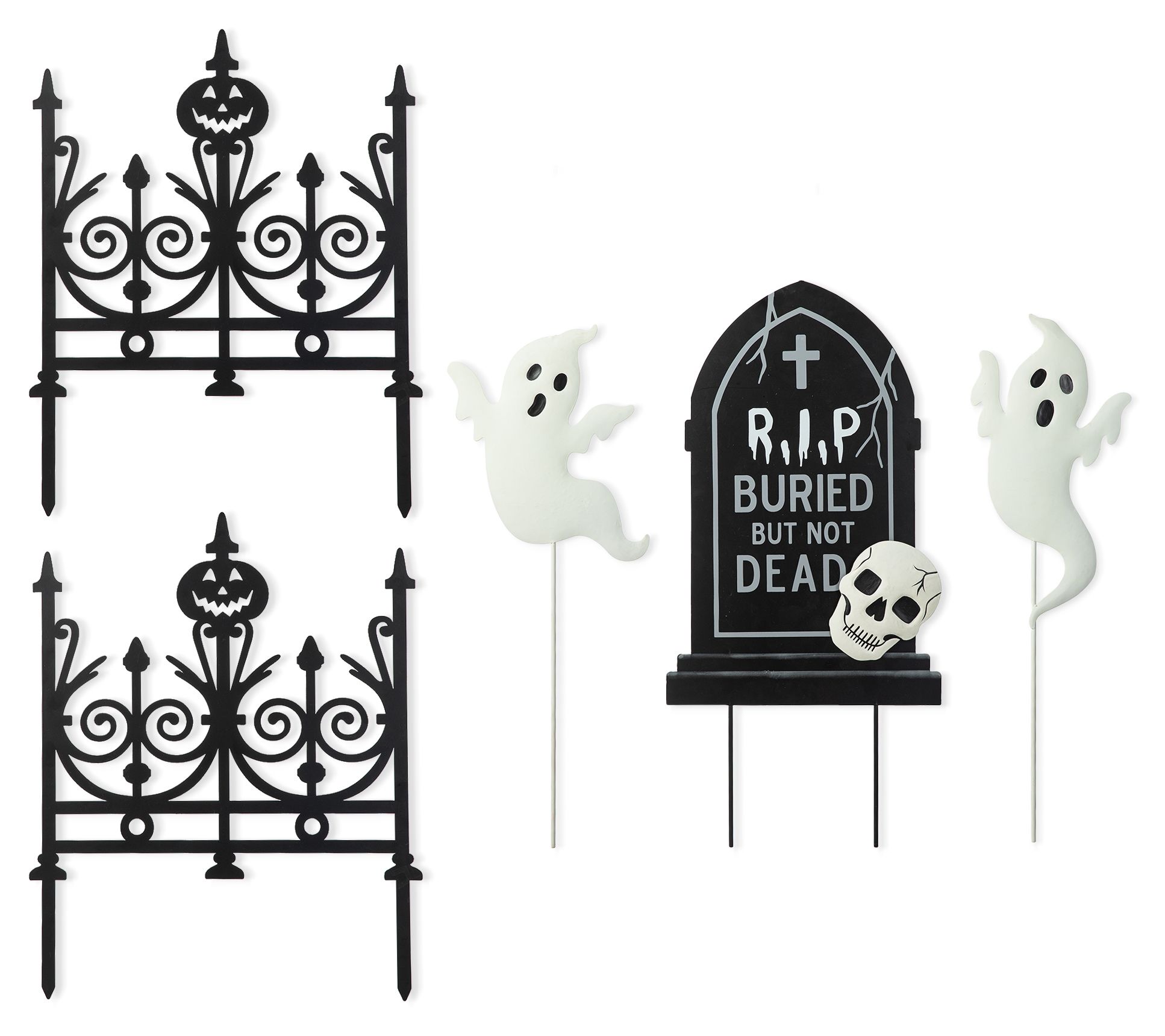 Spook your trick-or-treaters with the Glitzhome 24"H Halloween metal graveyard set. This five-piece garden stake set features a fence, tombstone, and ghost that create a scary silhouette anywhere in your yard. Place the iron stakes for a versatile and festive display. From Glitzhome.