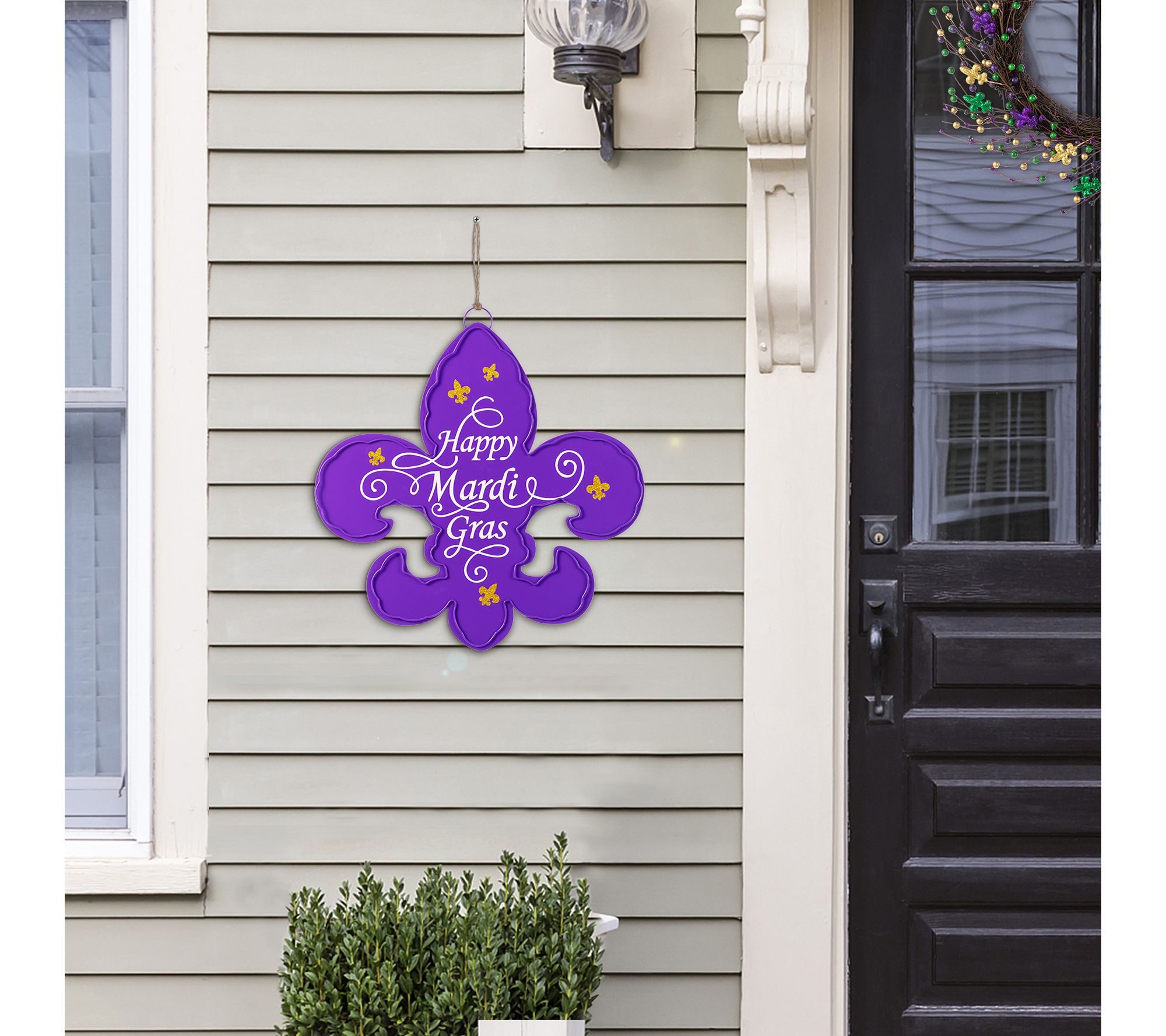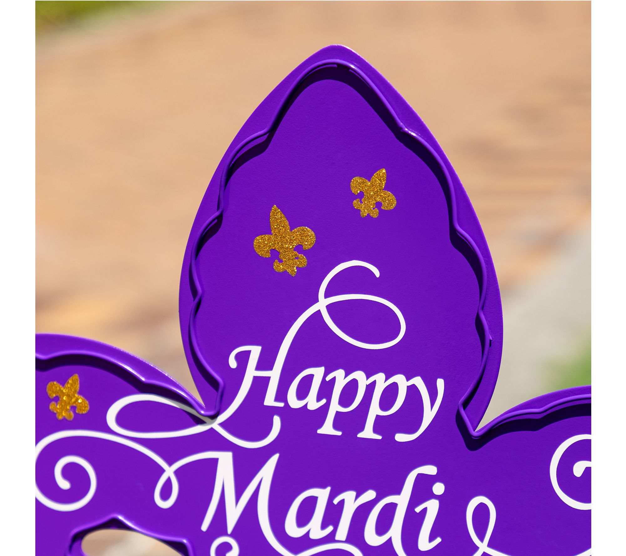 • Vibrant purple fleur-de-lis design with "Happy Mardi Gras" and goldtone accents
