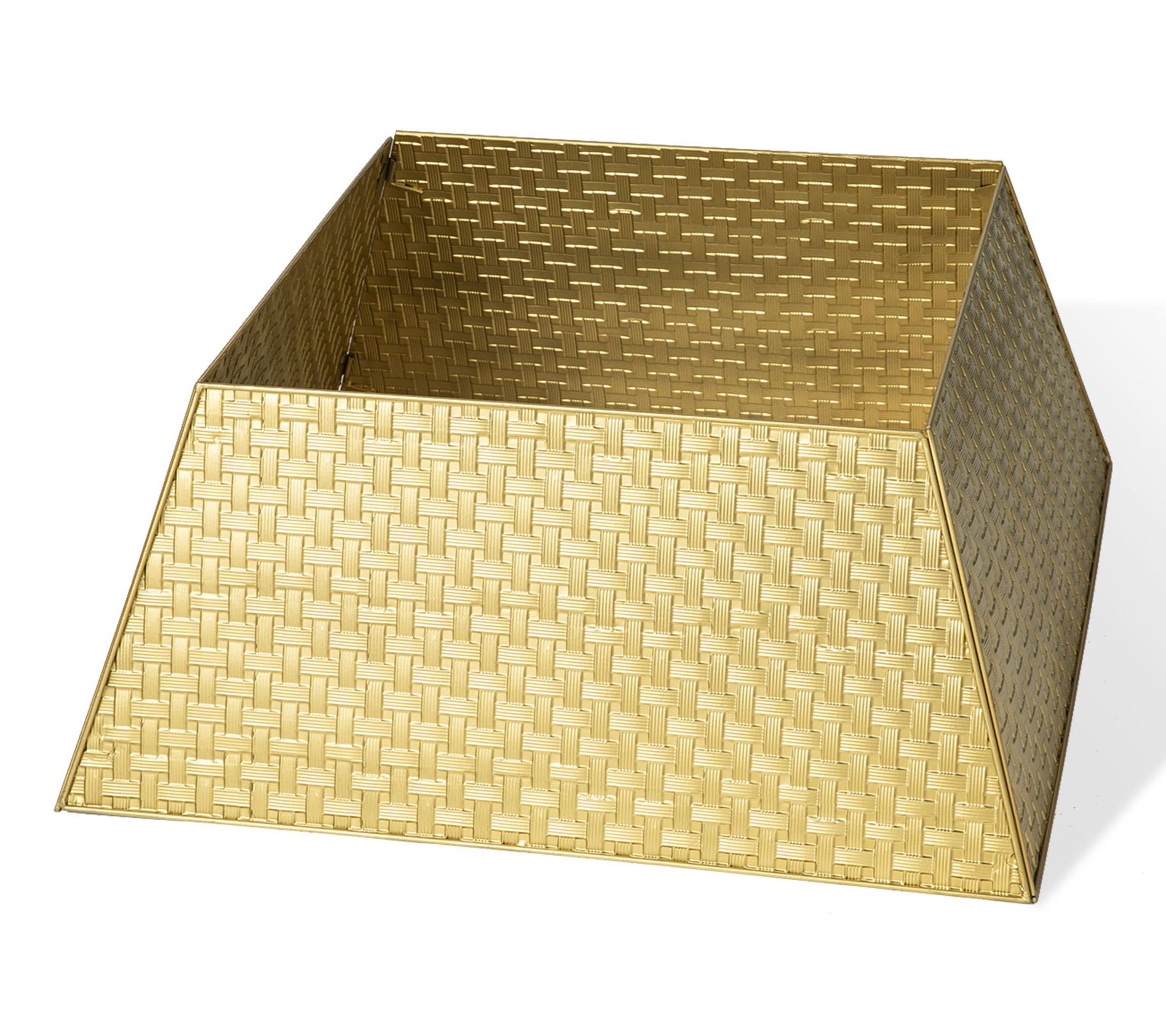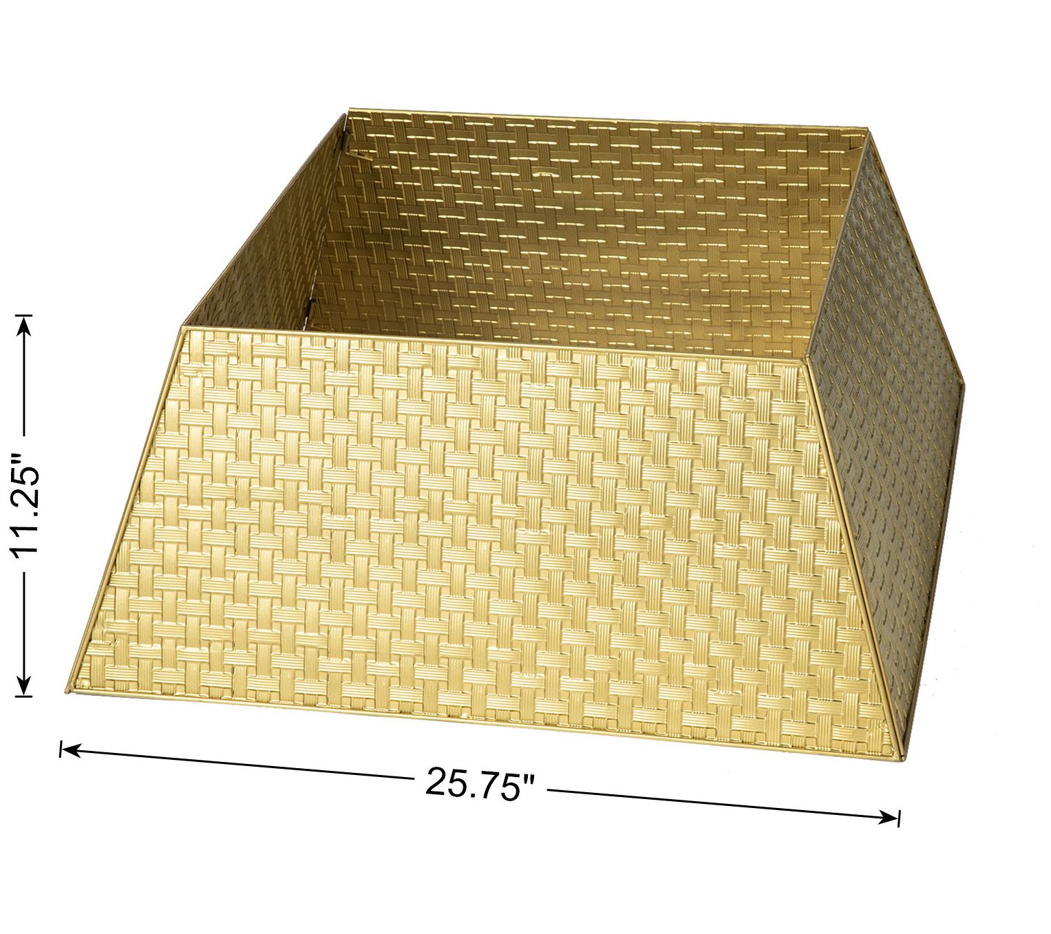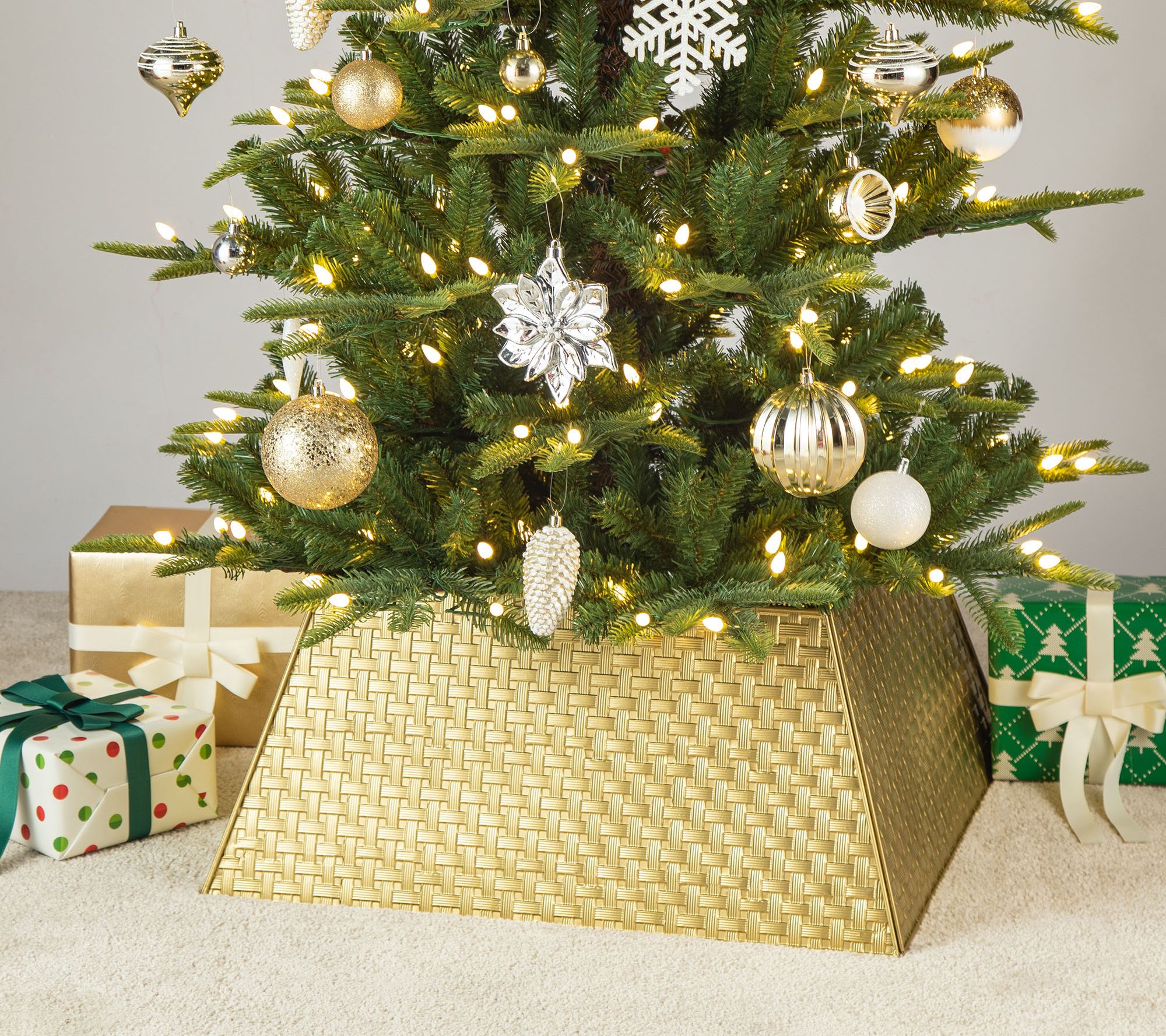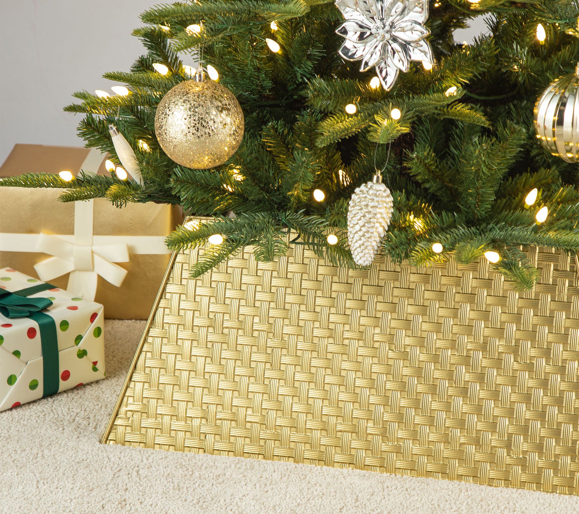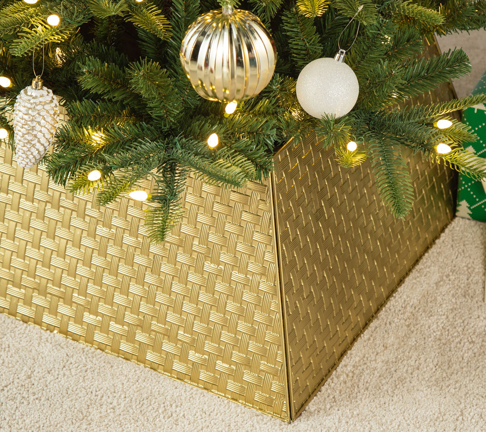Add a touch of modern elegance to your holiday decor with the Glitzhome trapezoid metal basket weave tree collar. This distinctive trapezoid design features an artisan-crafted glossy faux woven finish, making it a luxurious addition to your Christmas tree setup. Designed for trees up to 9' tall, it easily breaks down into four pieces for convenient storage after the holidays. From Glitzhome.