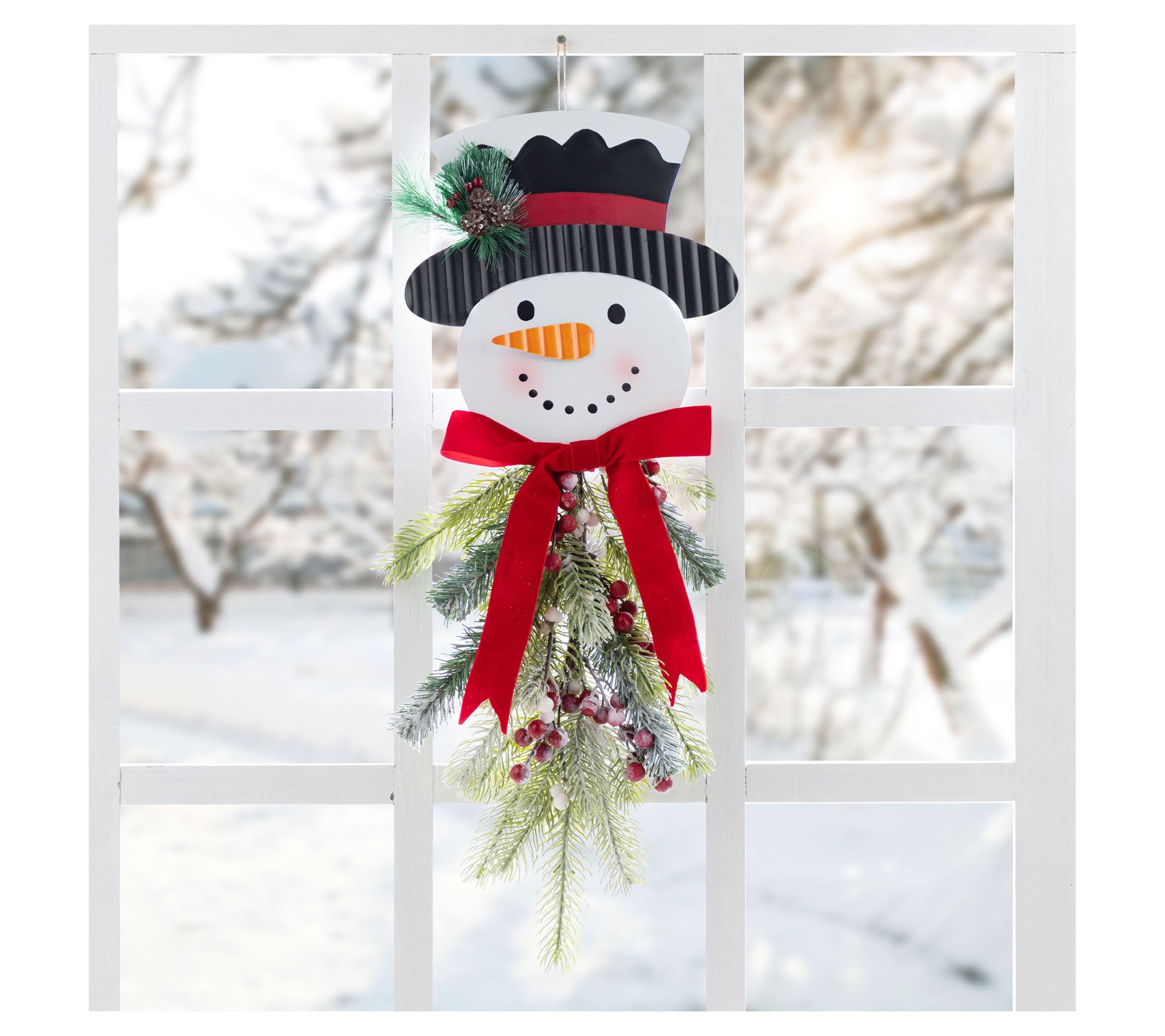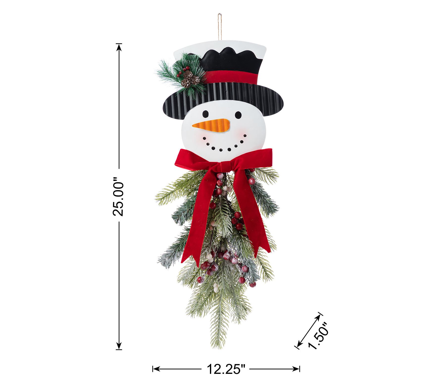 • Festive snowman design with black top hat, red bow, greenery, and red and white berries