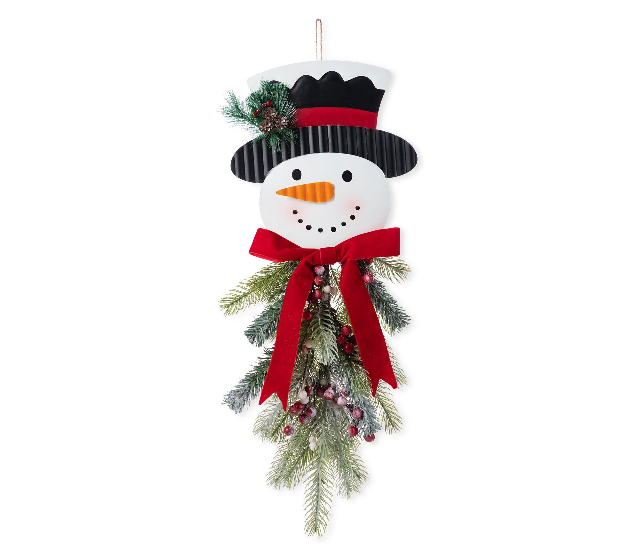 Make your holiday entryway shine with this cheerful snowman door hanger, complete with a black top hat, vibrant red bow, lush greenery, and pops of red and white berries. Crafted from durable metal and artificial florals, it brings a joyful welcome to guests when hung on your door or wall. From Glitzhome.