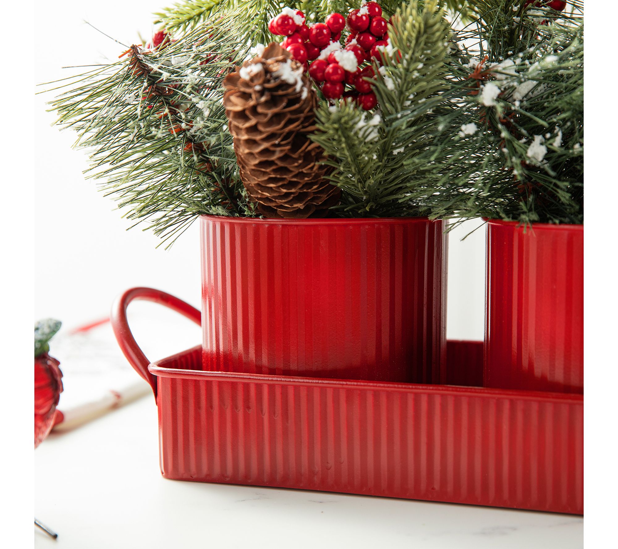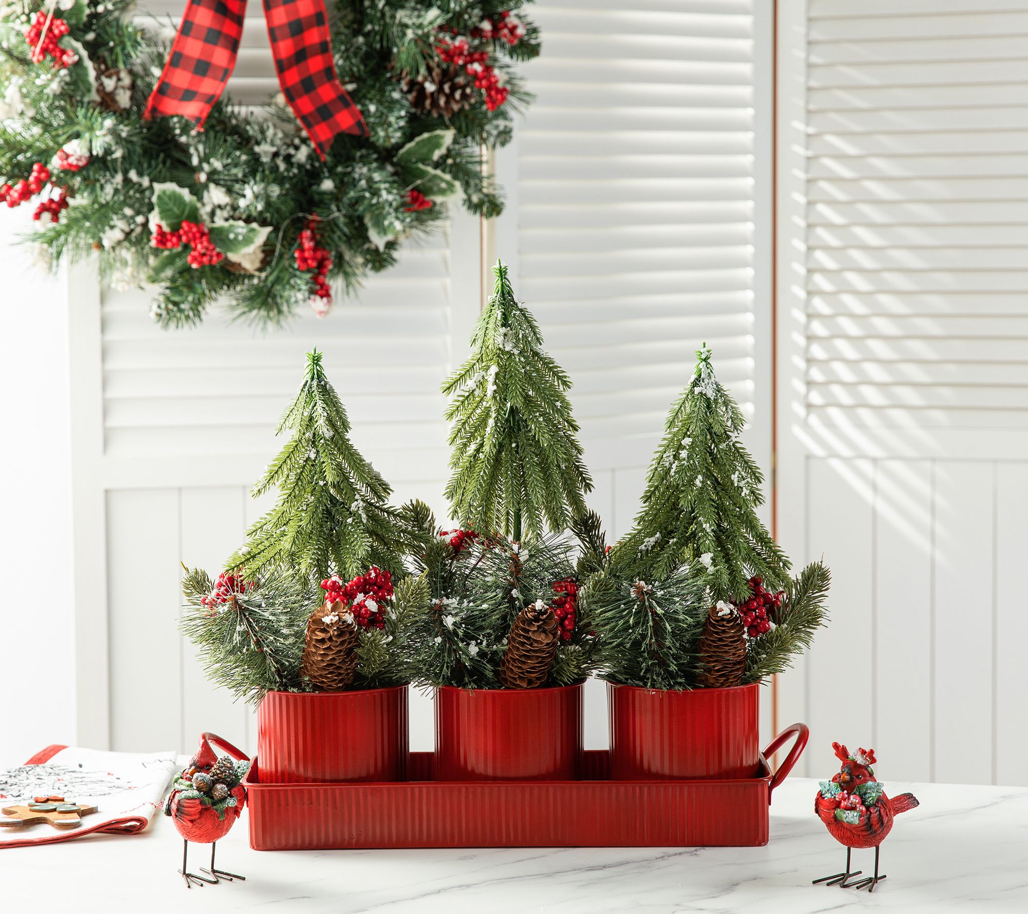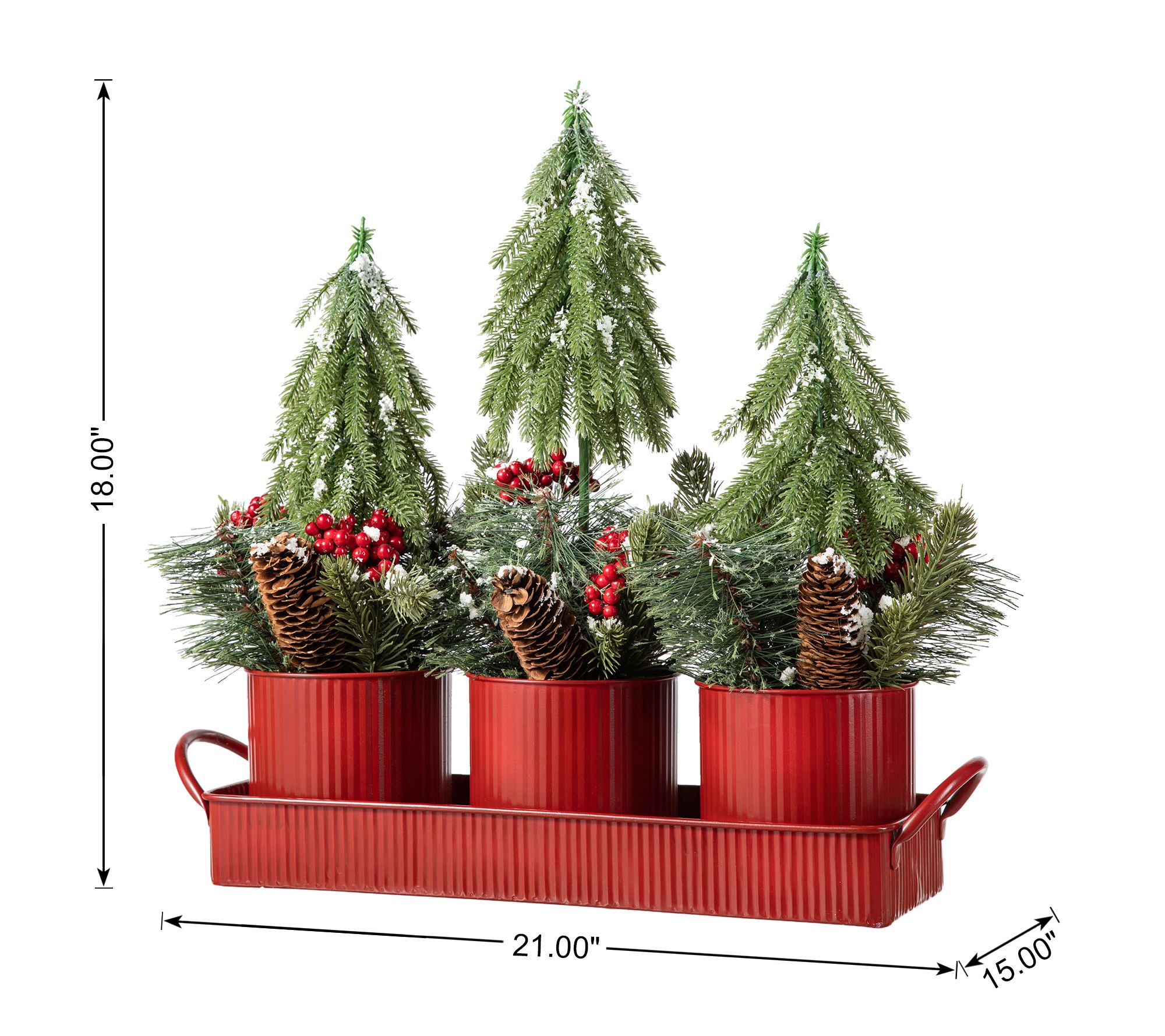 This tabletop centerpiece brings a natural and rustic feel to your decor. Three small Christmas trees adorned with faux pinecones and red berries are displayed in red metal pots on a matching tray, evoking the beauty and essence of the holiday season. From Glitzhome.