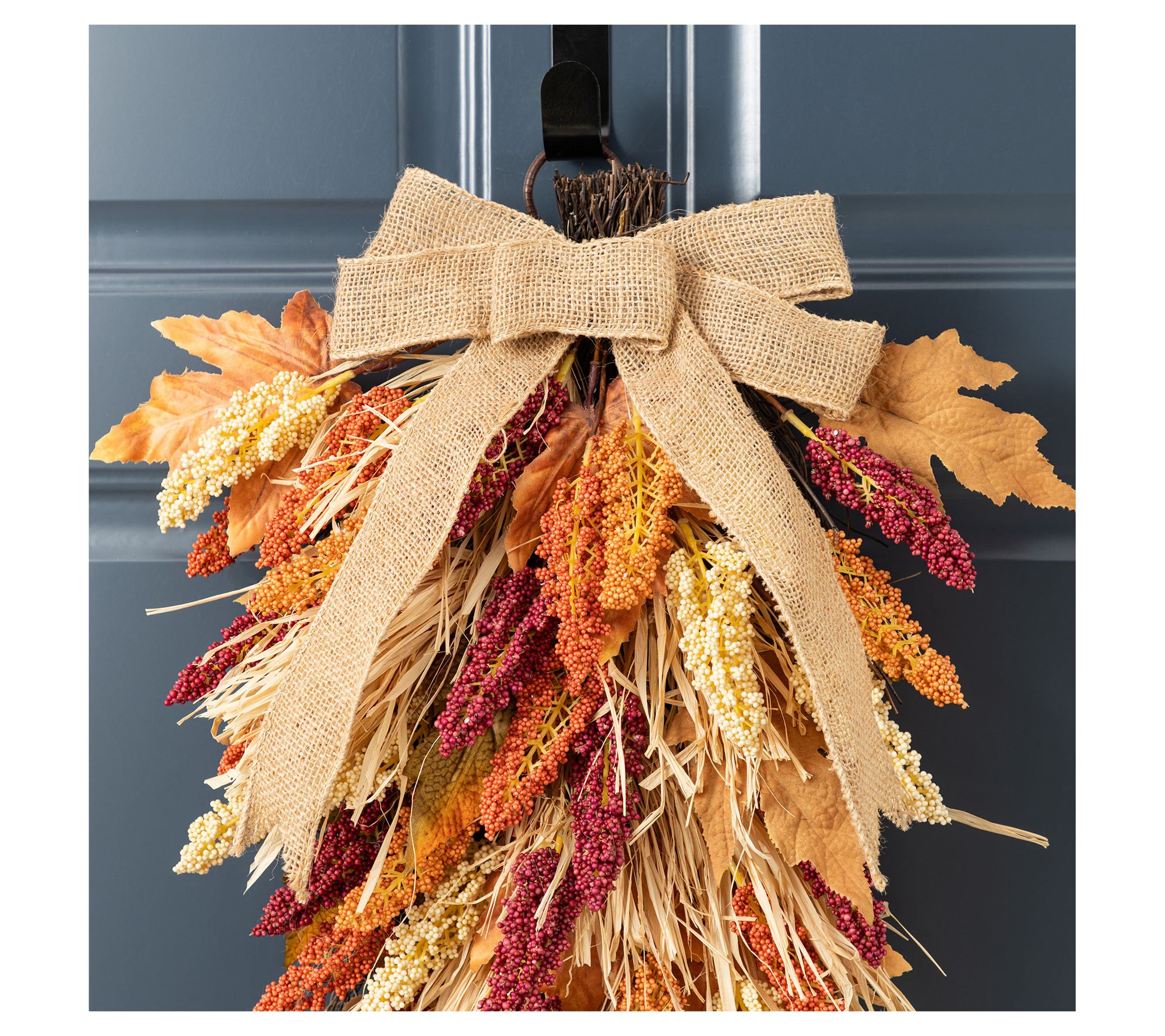 Autumn gatherings feel even more inviting when this fall harvest sorghum swag greets guests at your door. Shades of red, orange, and yellow blend together with dried leaves and a rustic burlap bow, providing a warm accent for any entryway, wall, or seasonal centerpiece. Simply hang and let the festive spirit of fall shine. From Glitzhome.
