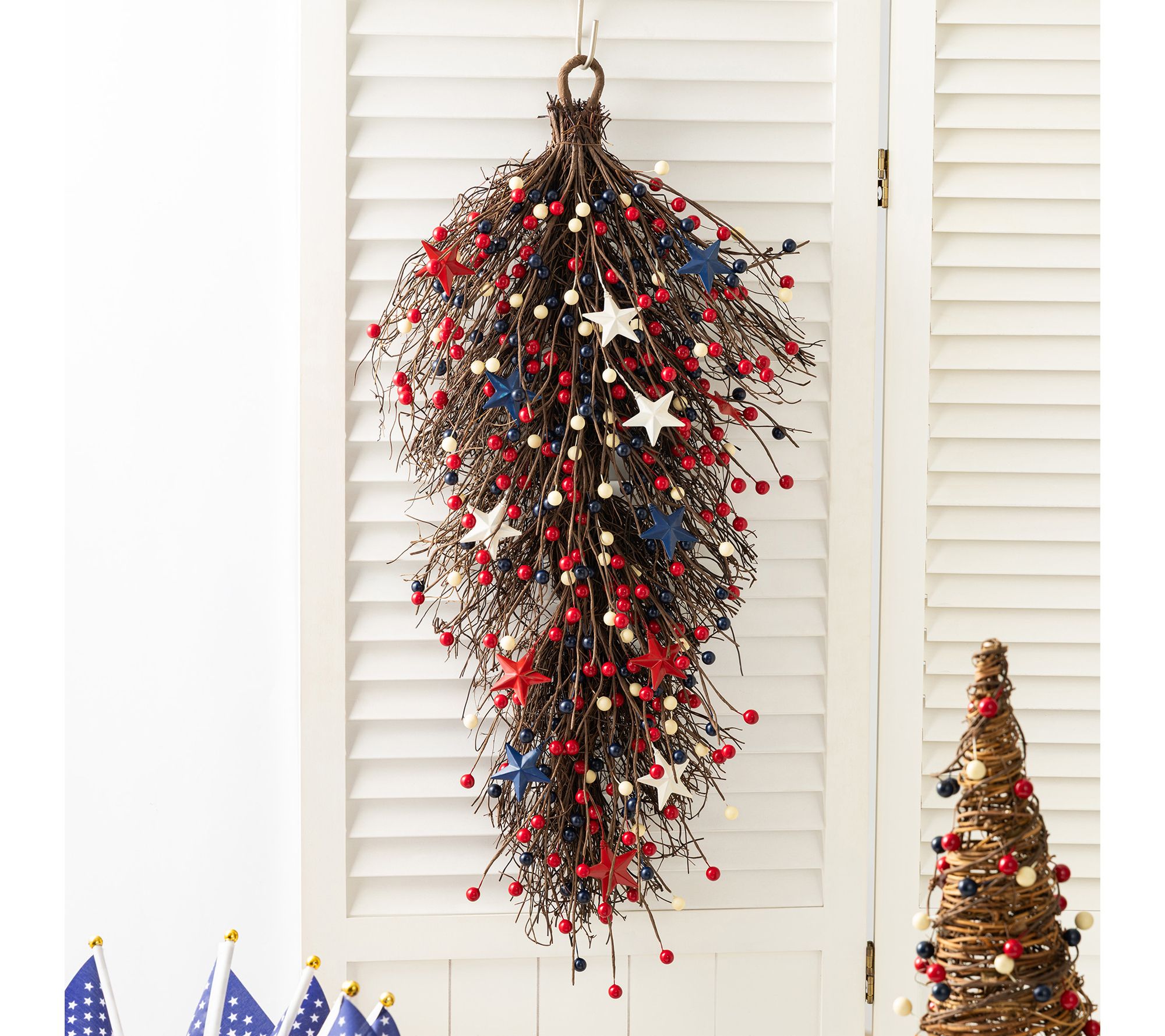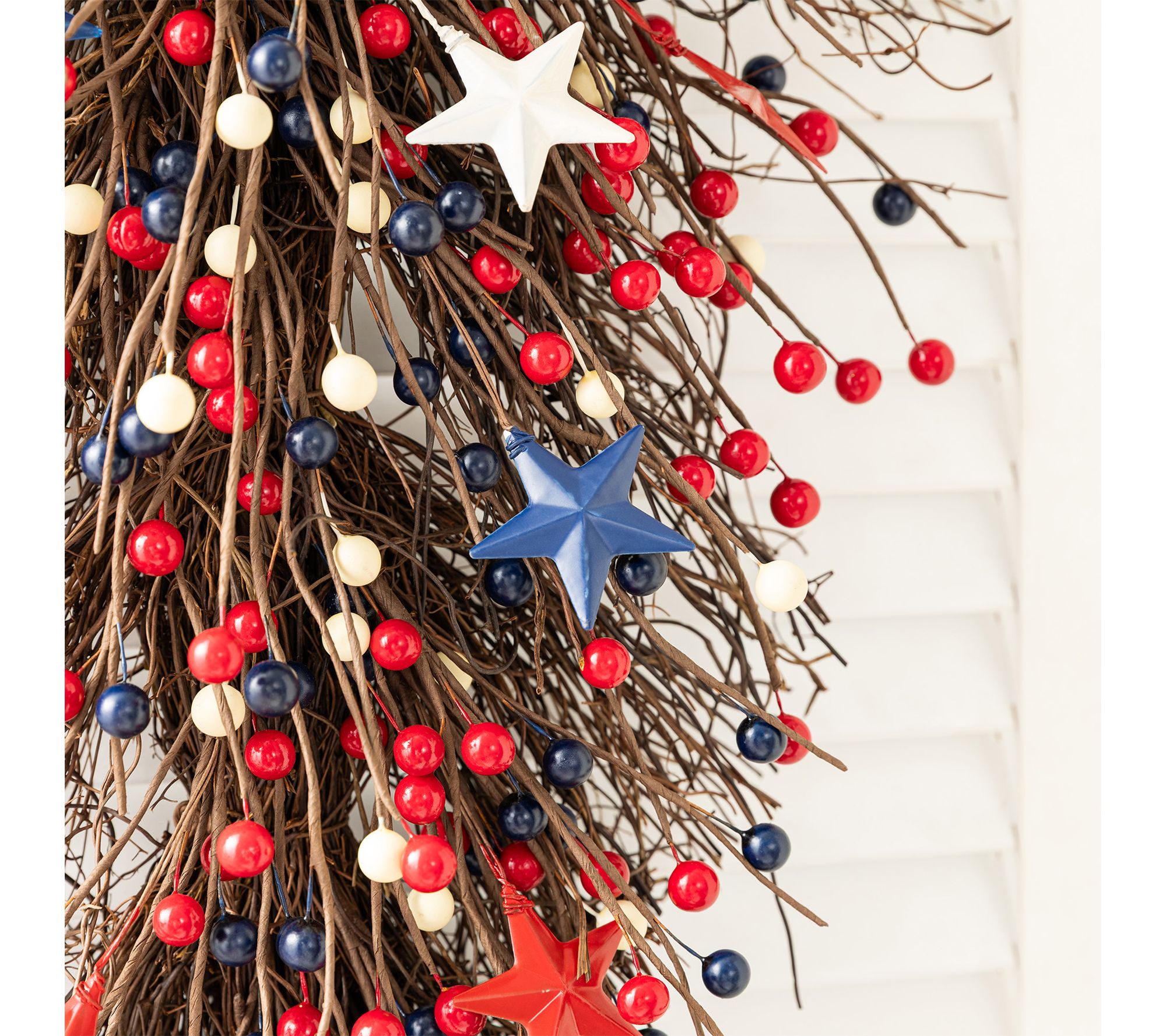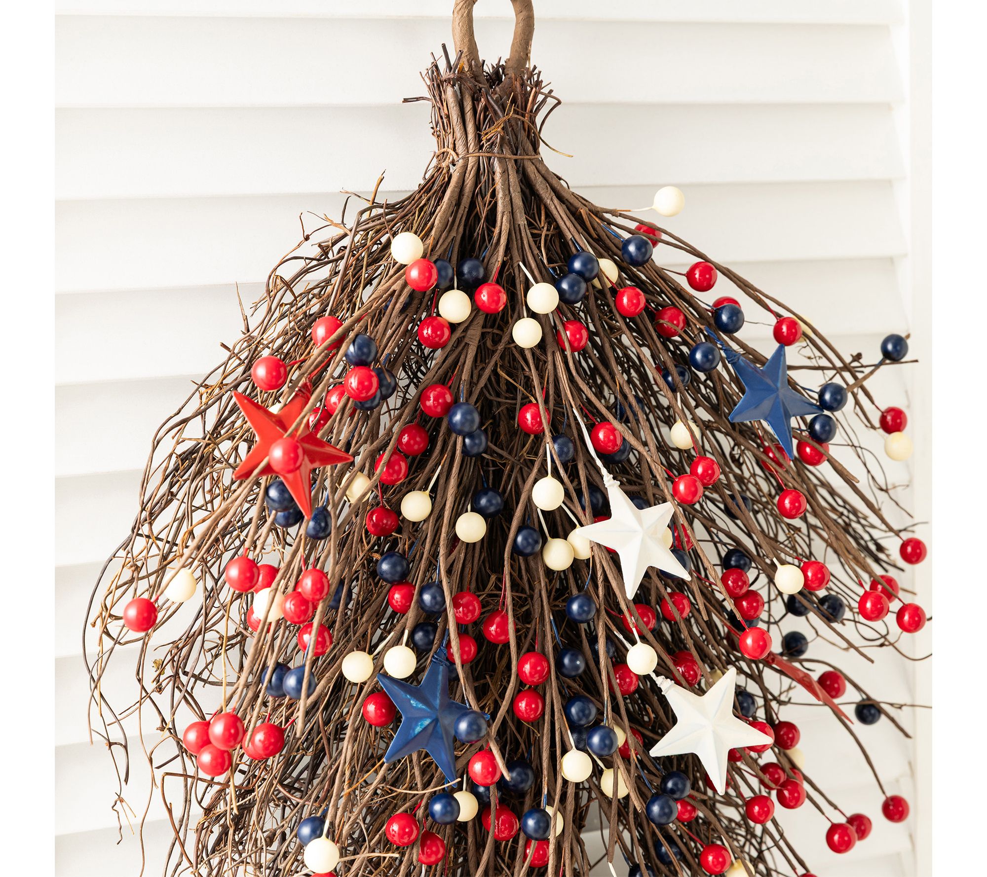 • Cascading teardrop shape with lifelike stars and berries in patriotic red, white, and blue