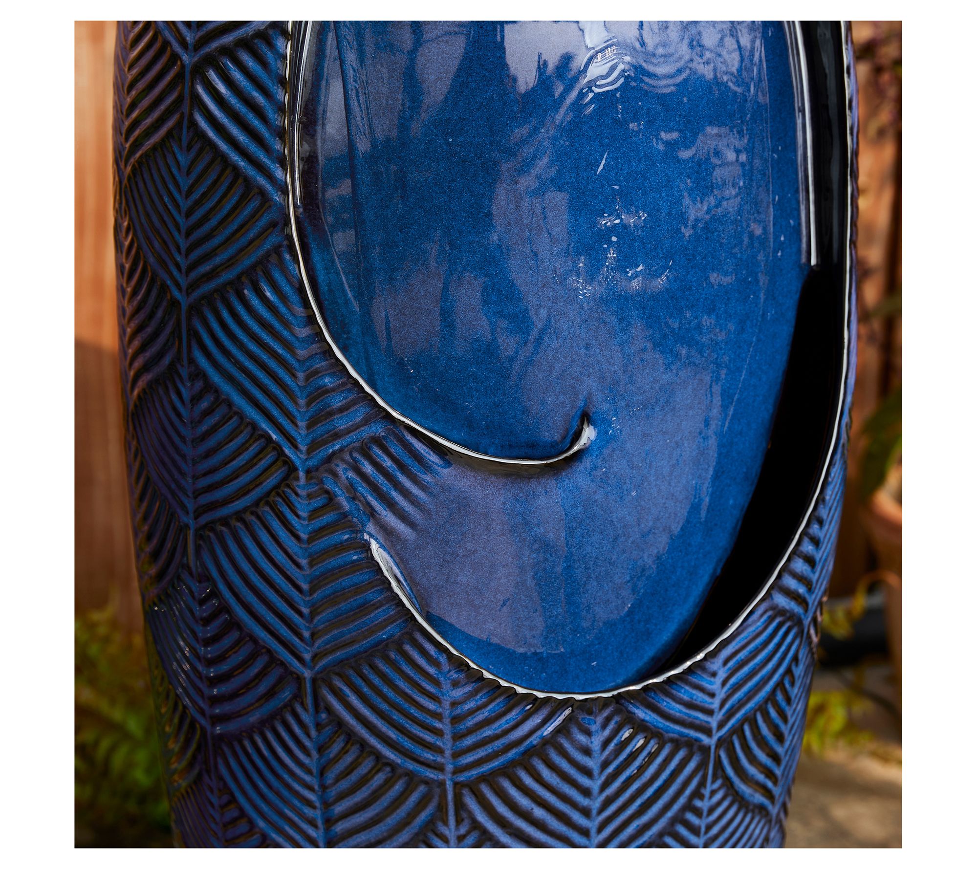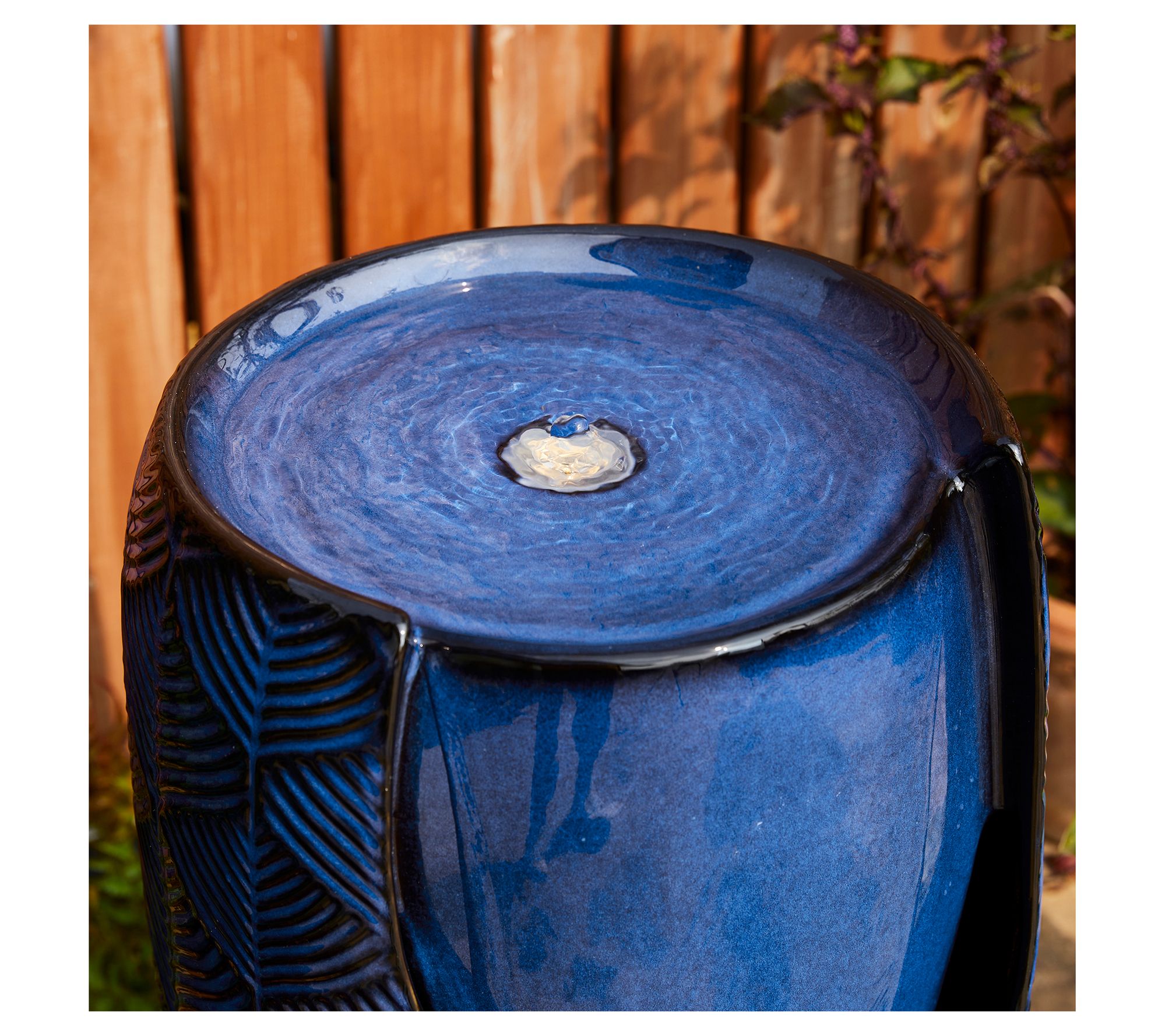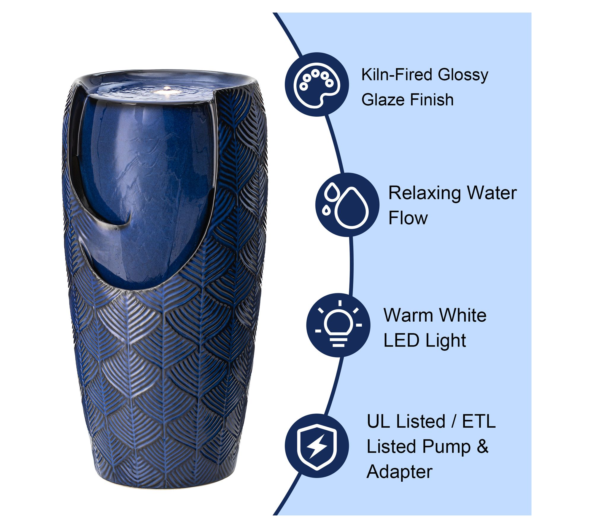 Create a calming oasis with this stylish ceramic fountain, featuring an elegant glossy glaze and delicate scale-like texture. The soothing sound of cascading water and warm white LED light create a relaxing atmosphere, perfect for any garden, patio, or indoor space. Simply add water, plug it in, and enjoy! From Glitzhome.